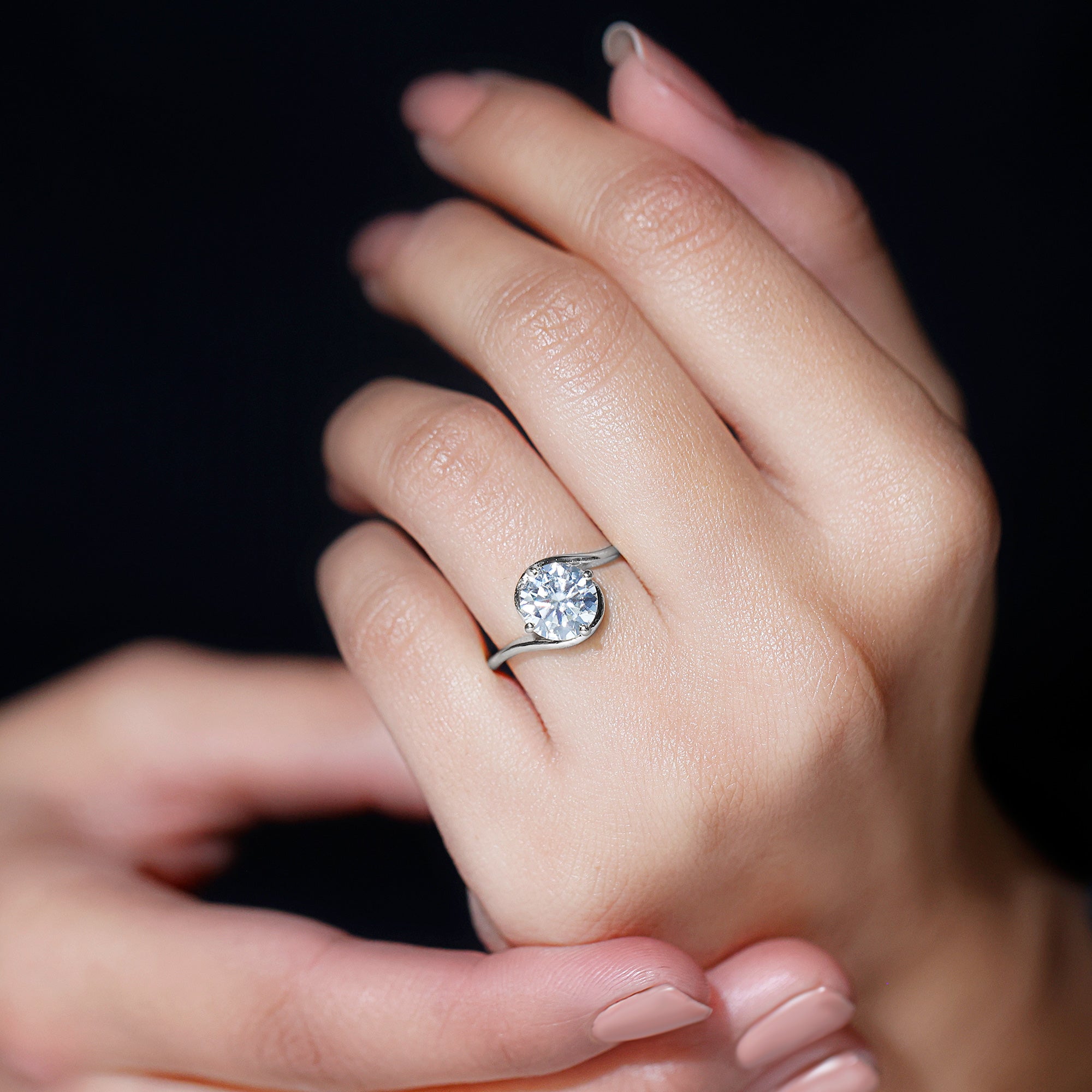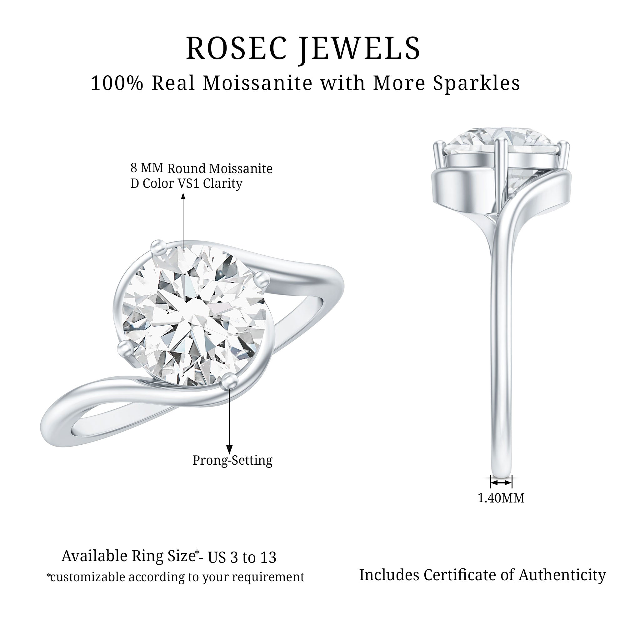 Mark a milestone moment with this striking Solitaire Moissanite Engagement Ring, thoughtfully designed to celebrate your one-of-a-kind love story. At the heart of this elegant design sits an 8 MM round brilliant cut moissanite, securely nestled in secure prong setting. Renowned for its brilliance and durability, the center stone radiates with fire and clarity, offering all the sparkle you could wish for without compromise. What makes this Solitaire Ring truly stand out is its graceful bypass shank. The flowing design wraps around the center stone like a gentle embrace, symbolizing two lives coming together. Sleek and modern with a romantic twist, the bypass style adds dimension and movement, creating a unique silhouette that is both timeless and contemporary. Perfect for someone who appreciates refined details with a hint of drama, this Bypass Engagement Ring blends simplicity with elegance in the most memorable way. It is a beautiful representation of lasting love - bold, bright, and full of meaning. It also offers customization options for metal color and type, so you can create a piece that is perfectly aligned with your partner’s style. Delivered in a signature jewelry box and accompanied by a certificate of authenticity, this 2 Carat Moissanite Ring for Women is ready to make your proposal unforgettable. A true celebration of love and individuality, this Solitaire Engagement Ring is designed to be cherished every day, for a lifetime.