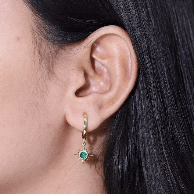 Celebrate love with these radiant Sunburst Hoop Earrings, adorned with Round Shape Created Emerald delicately set in a bezel setting. These Hoop Drop Earrings symbolize elegance and grace. Express your affection and add a touch of enchantment to any outfit with these captivating earrings.