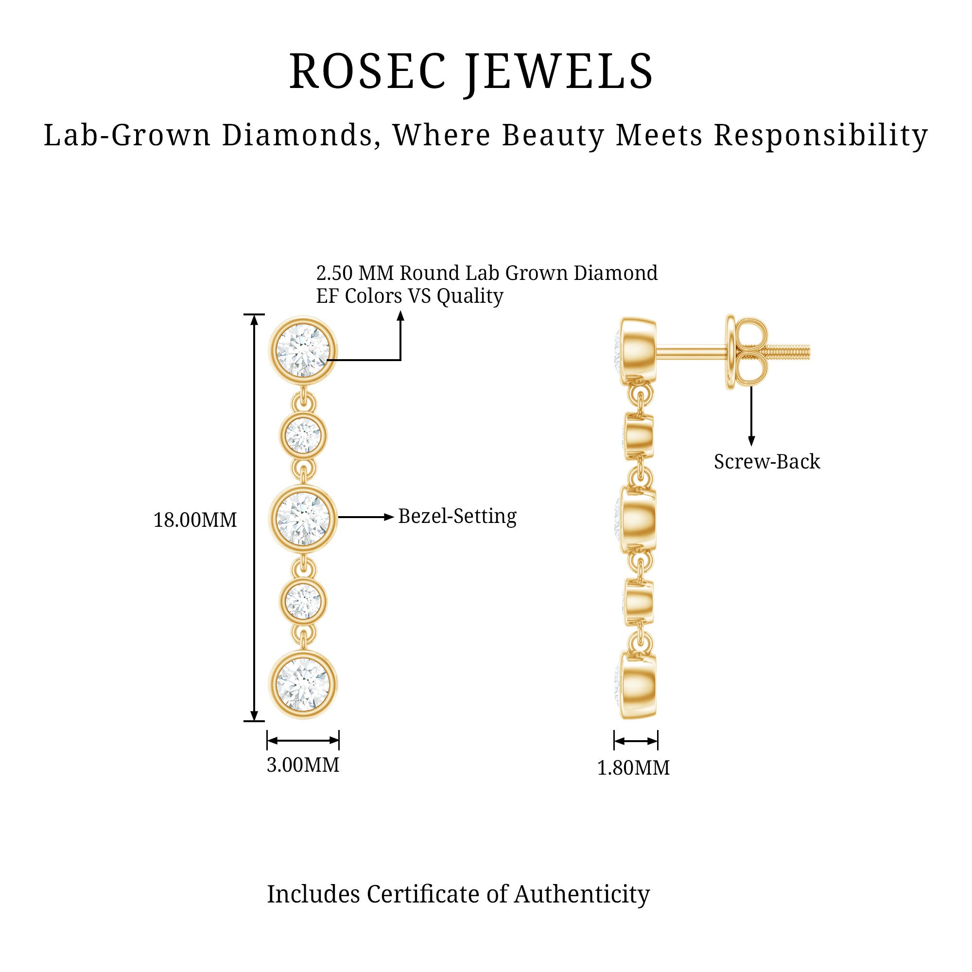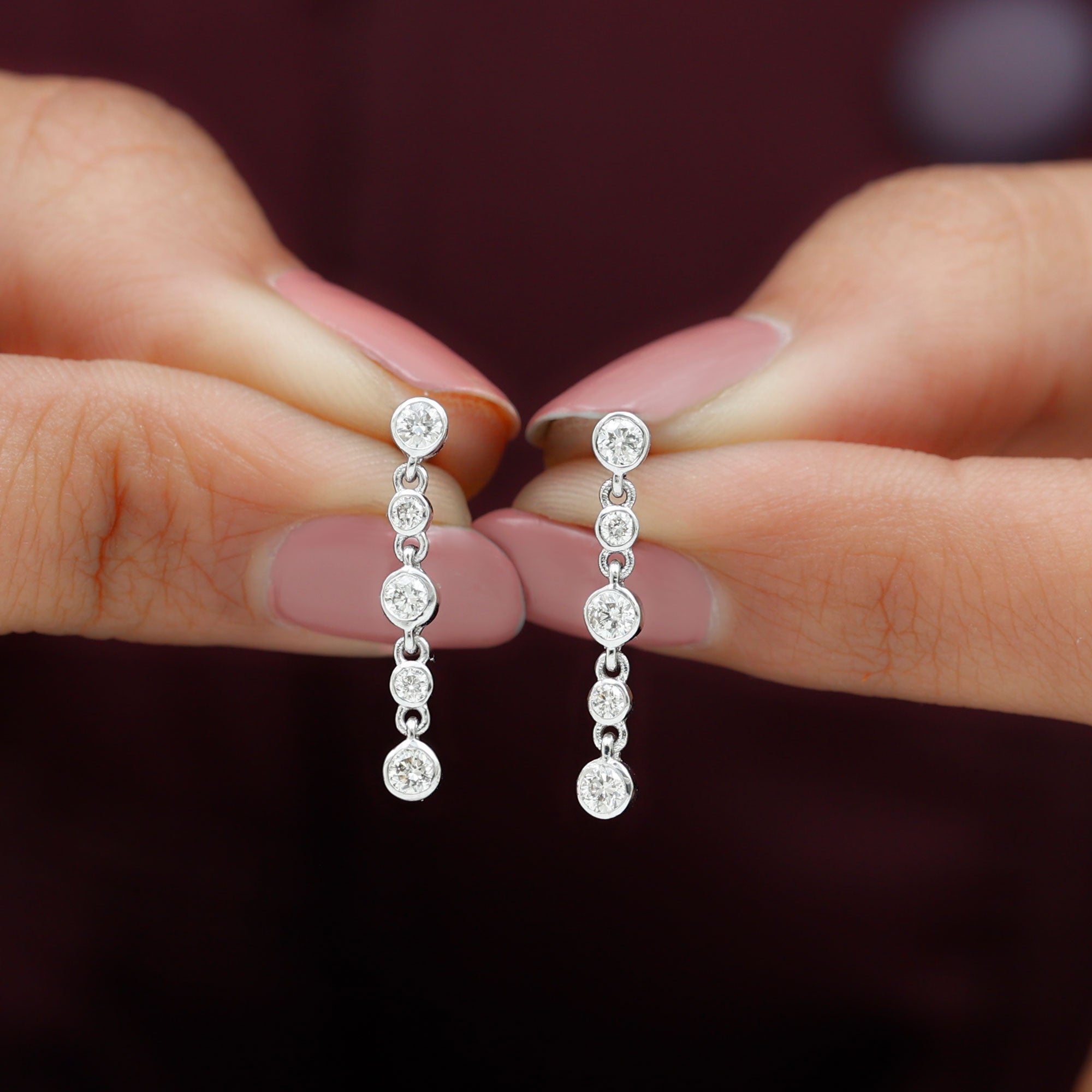 These Diamond Dangle Earrings offer a sparkle that captures attention and makes hearts flutter. Crafted with two sizes of Round Brilliant Cut Lab Grown Diamonds of EF-VS Quality, arranged in an alternating pattern in Bezel Setting, this piece epitomizes modern luxury. The mix of small and large stones in a vertical arrangement presents a look that is both elegant and refined. Each earring features a Screw Back Closure for comfort and security, making these Lab Grown Diamond Earrings perfect for dancing the night away or shining during daytime events. Packaged in a stylish jewelry box, these Chain Dangle Earrings are a wonderful gift for special occasions, surprises, or just to pamper yourself. If you appreciate jewelry that exudes style without being overly flashy, these Bezel Diamond Earrings will feel like your signature piece. Infuse a touch of drama, a hint of sparkle, and a wealth of elegance into your jewelry collection with these beauties.
