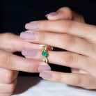 Add a splash of color and elegance to your special occasion with this gorgeous Emerald and Diamond Engagement Ring that perfectly blends passion and style. At the center of the Designer Ring is a stunning 5 MM round cut emerald, securely set in half bezel setting. To enhance its allure, the bypass-inspired band is adorned with sparkling diamonds that twinkle with every move. The delicate diamond accents beautifully emphasize the emerald color, striking a lovely balance between luxury and simplicity. This Unique Engagement Ring is carefully designed to showcase the best of both stones, the fiery green of the AAA quality emerald and the cool sparkle of the HI-SI quality diamonds. Made for comfort as well as beauty, the smooth curves of the band ensure it is easy to wear daily while still feeling elegant and special. Perfect for those who appreciate vibrant jewelry with significance, the Emerald Engagement Ring radiates personality and charm. Beautifully packaged and ready for gifting, this Bypass Ring serves as a timeless reminder of love, warmth, and the moments that truly count.
