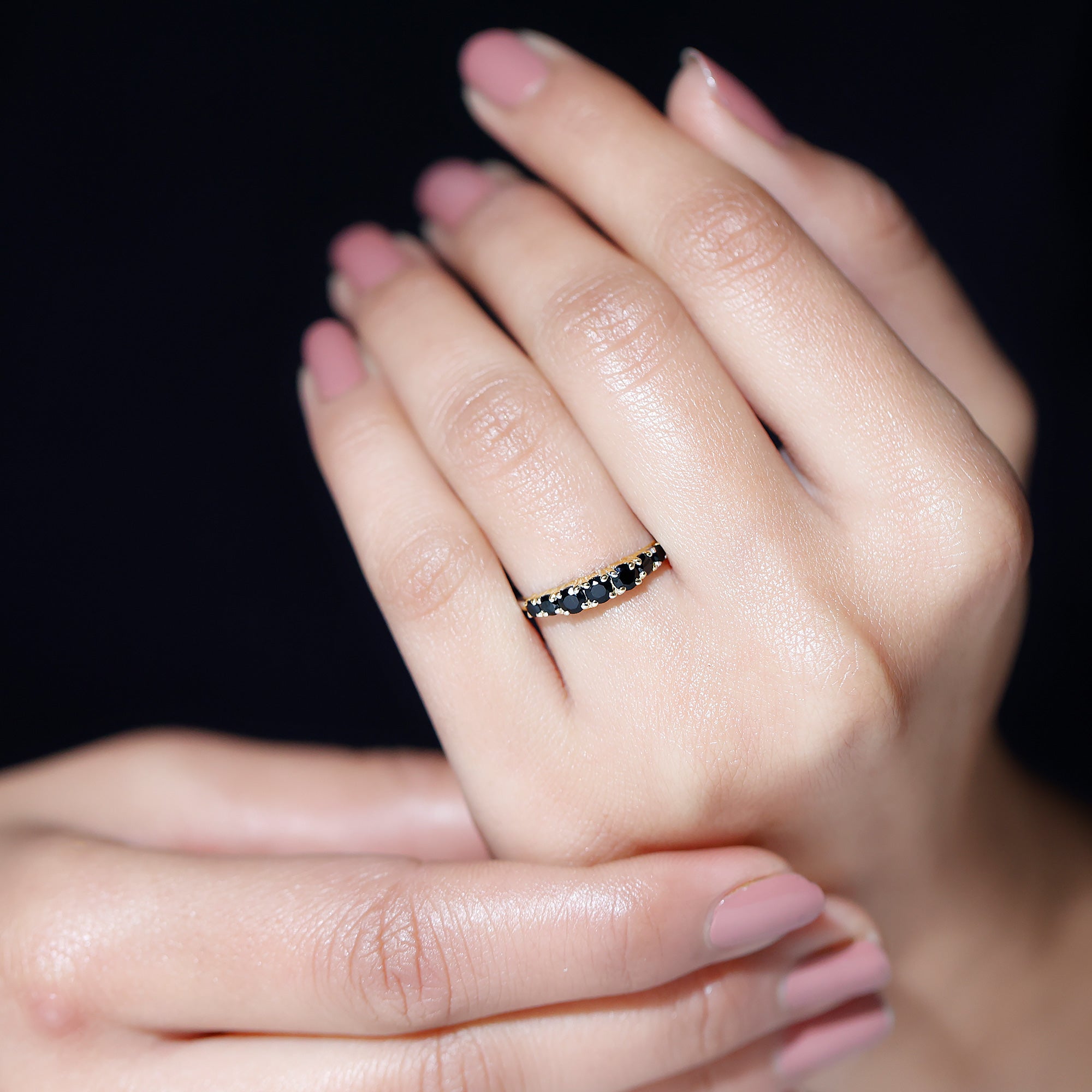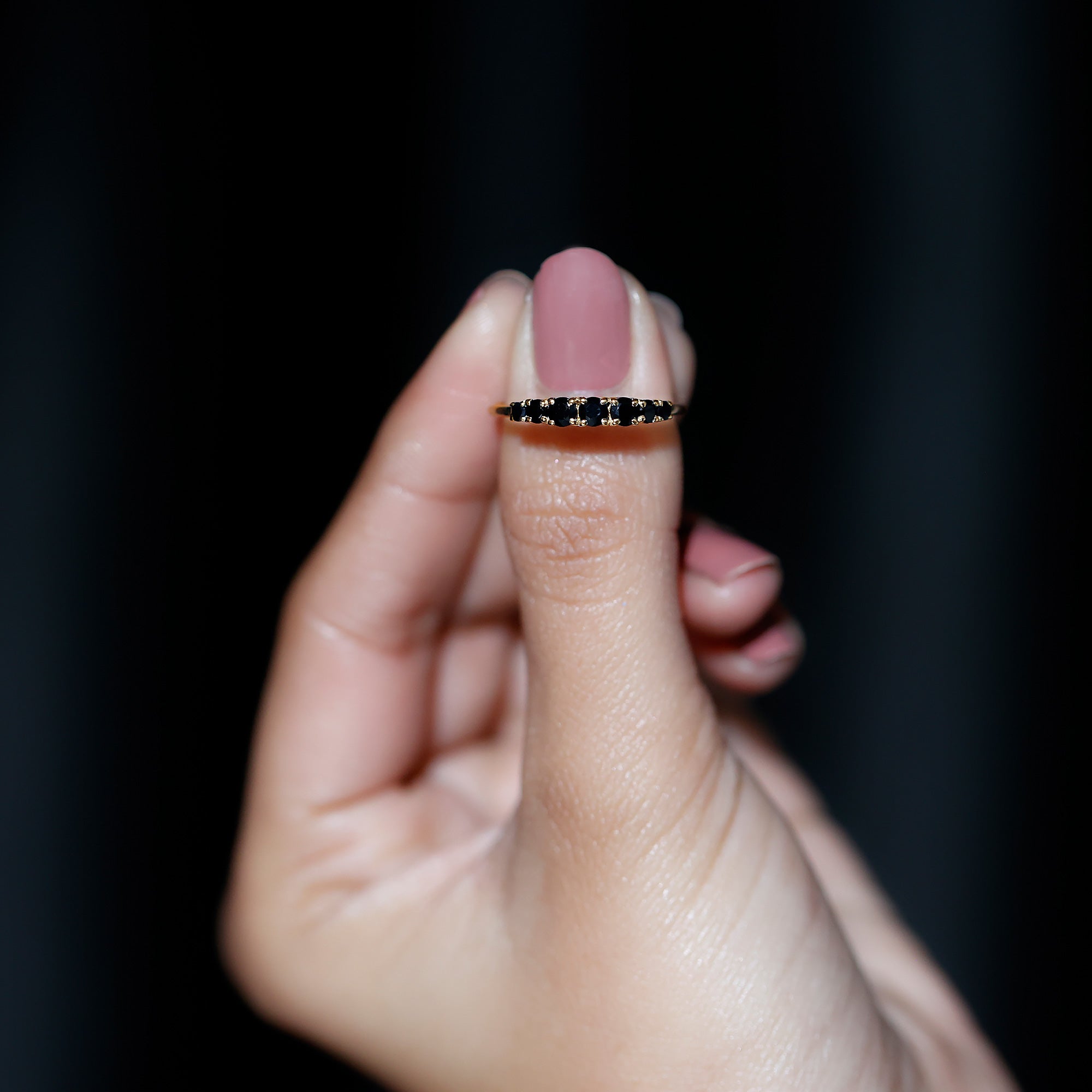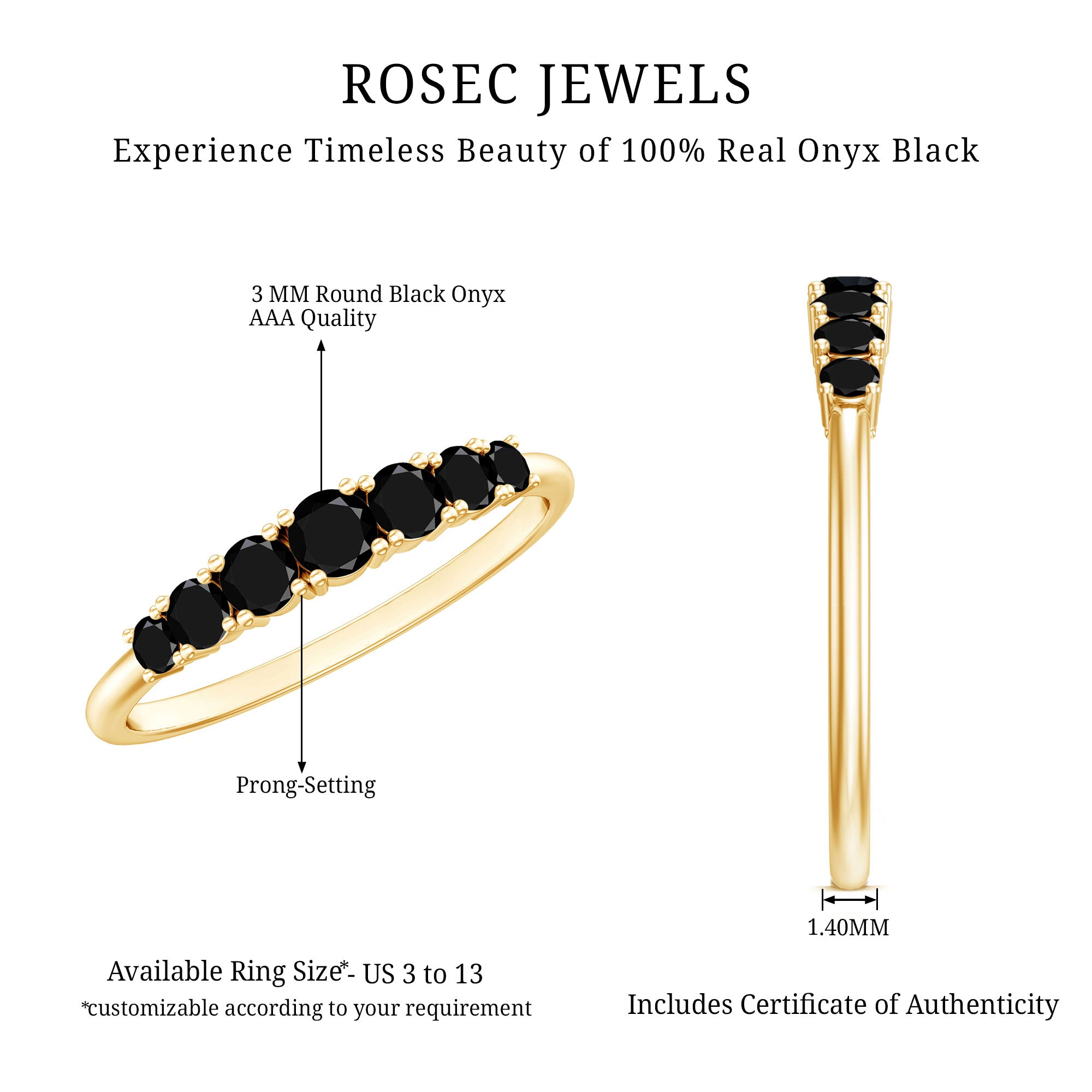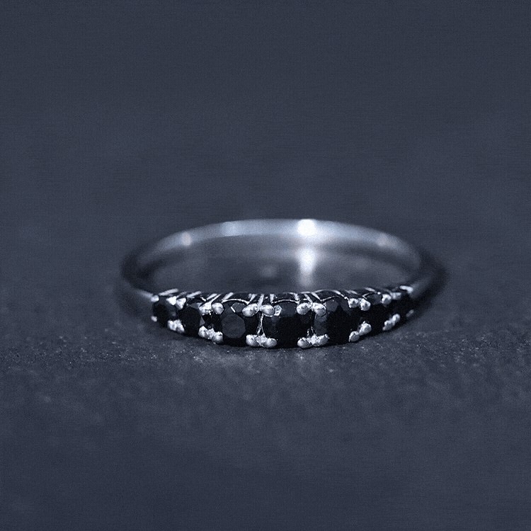 Like a gentle wave, the stones in this Black Onyx Eternity Ring rise and fall in perfect balance. Featuring seven round black onyx gemstones arranged in a gentle graduated pattern, the Half Eternity Ring is designed to draw attention without being overwhelming. The center stone is slightly larger, while the side stones smoothly decrease in size, creating a curve that fits beautifully on the finger. Each stone is carefully placed in secure prong setting, letting the rich tone of the black onyx shine through while offering a comfortable and durable fit. The design flows with ease, making this Black Onyx Wedding Band ideal for everyday wear or meaningful occasions. Black onyx, admired for its deep color and symbolic strength, adds purpose to the piece. It is known to support calm, protection, and balance, qualities that make it more than just a piece of jewelry. As the birthstone for December and a special gem for Leo signs, it holds extra meaning for many wearers. Whether given as a gift or chosen for yourself, this 7 Stone Anniversary Band offers simplicity with depth. It looks lovely worn alone or stacked with other favorites, and it suits any style, from bold to minimal. Carefully crafted with AAA quality stones, this ring brings a subtle elegance to your jewelry collection.