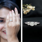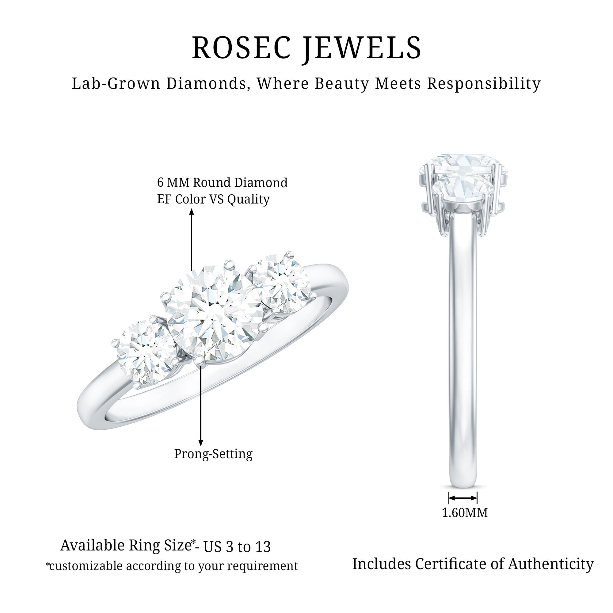 Representing a love that deepens over time, this Three Stone Engagement Ring serves as a lovely reminder of your shared journey. Featuring three beautifully set EF-VS quality round lab created diamonds that symbolize the past, present, and future, this Lab Grown Diamond Engagement Ring embodies the essence of an everlasting bond in a truly elegant manner. The center stone is slightly larger than the two side stones, all set in a secure prong setting for a sophisticated appearance. Each stone radiates with brilliant clarity, capturing light and hearts with every movement. Crafted to impress and built to endure, this 3 Stone Diamond Ring comes in a charming jewelry box, perfect for proposals, anniversaries, or special milestones. This Round Diamond Ring is ideal for everyday wear or unforgettable occasions, ensuring she feels treasured every single day. Offered in a range of ring sizes, this Past Present and Future Ring provides the perfect fit for every love story. This Timeless Engagement Ring is a contemporary classic with a romantic flair, a piece that conveys deep meaning without uttering a word. From subtle glances to grand promises, let it shine through every moment.