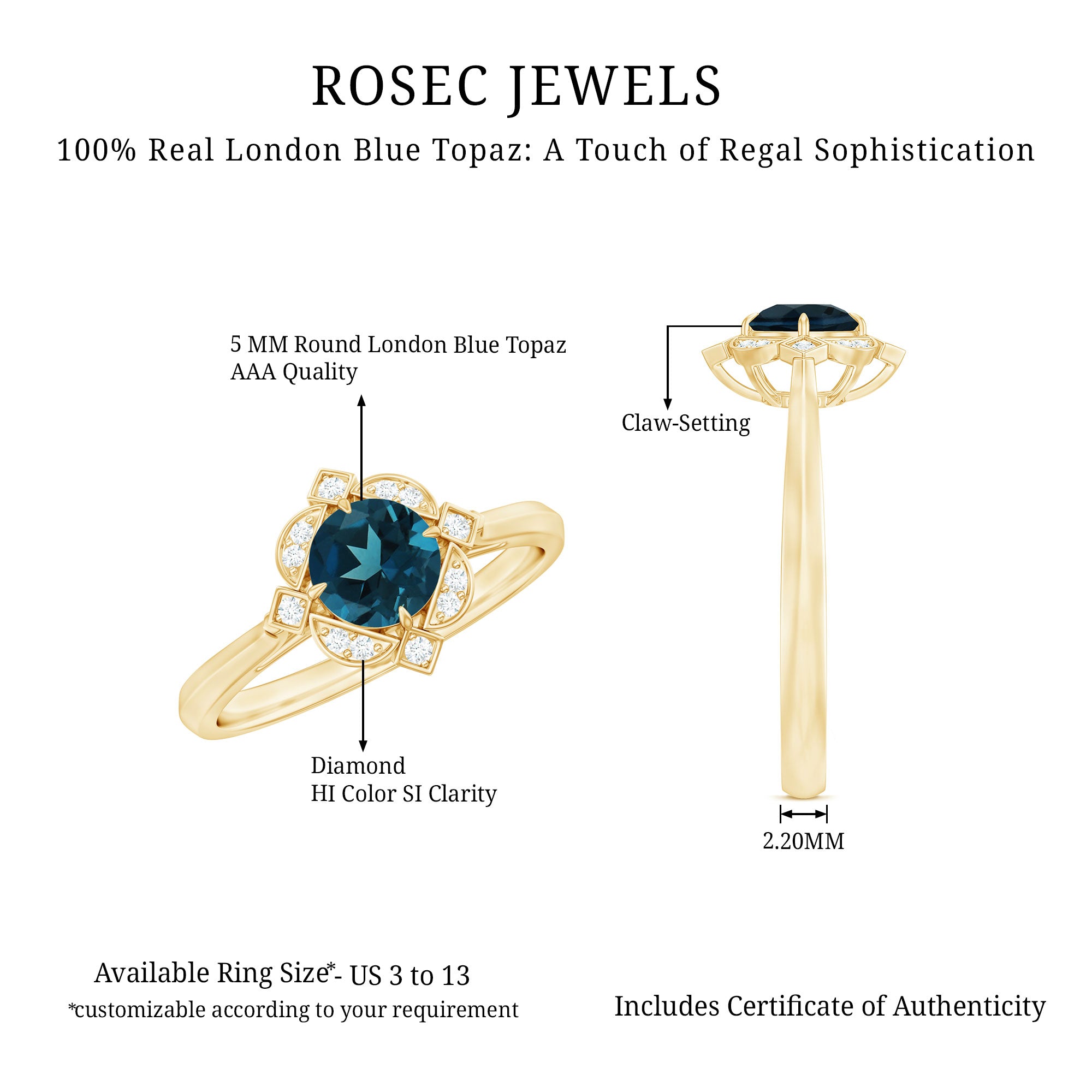 If she appreciates the charm of old school aesthetics and significant details, this Vintage Blue Topaz Ring is the ideal choice. It harmoniously combines classic elegance with timeless romance in an enchanting manner. At its core lies a 5 MM round shape london blue topaz, securely set in a claw setting. Encircling the onyx is a floral halo of genuine diamonds, imparting the London Blue Topaz Engagement Ring with a delicate and antique essence - reminiscent of treasures found in a cherished heirloom box. The halo design not only enhances the sparkle but also softens the striking center stone, resulting in a balanced and exquisite appearance that feels both distinctive and graceful. Constructed with AAA quality london blue topaz and HI-SI quality diamonds, this Floral Engagement Ring is designed for durability and intended to be cherished for many years. It is an excellent choice for proposals, anniversaries, or even as a considerate gift. The floral silhouette, vintage embellishments, and rich contrast of the stones render this Natural Blue Topaz and Diamond Ring a remarkable addition to any jewelry collection.