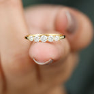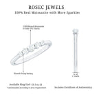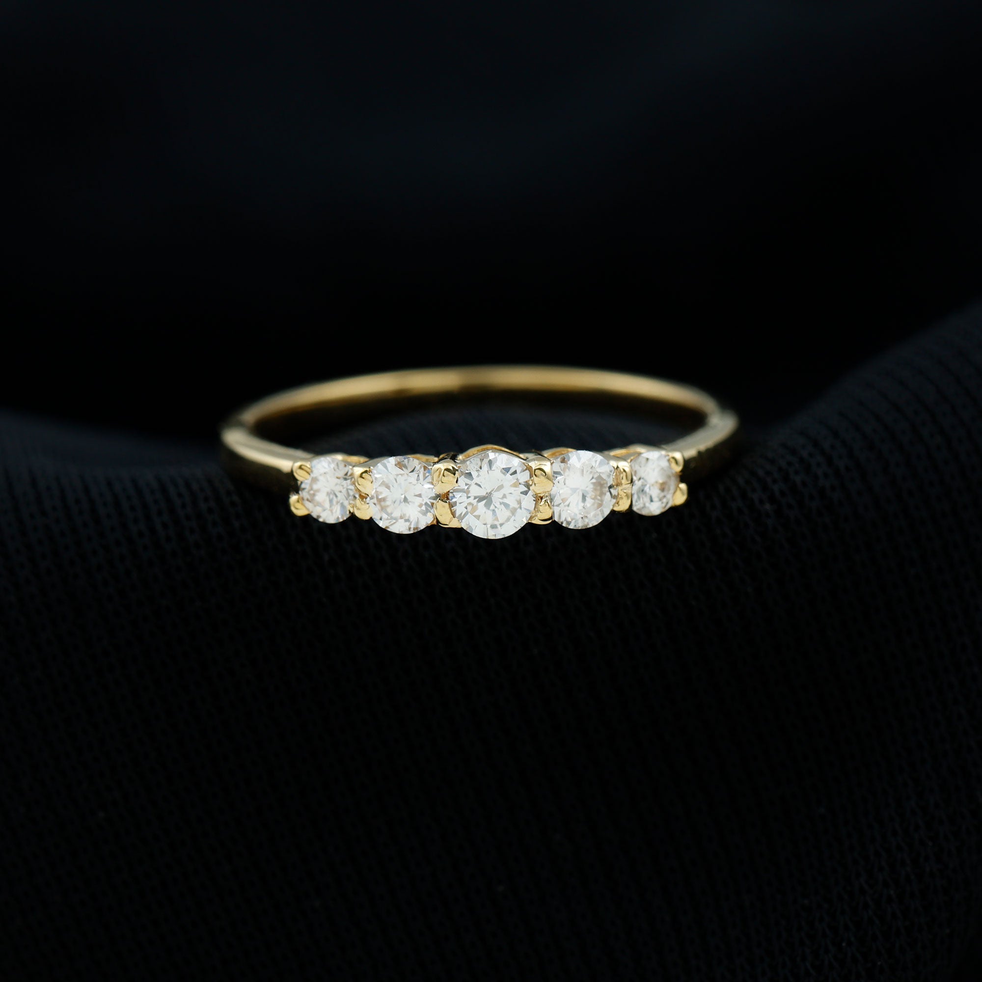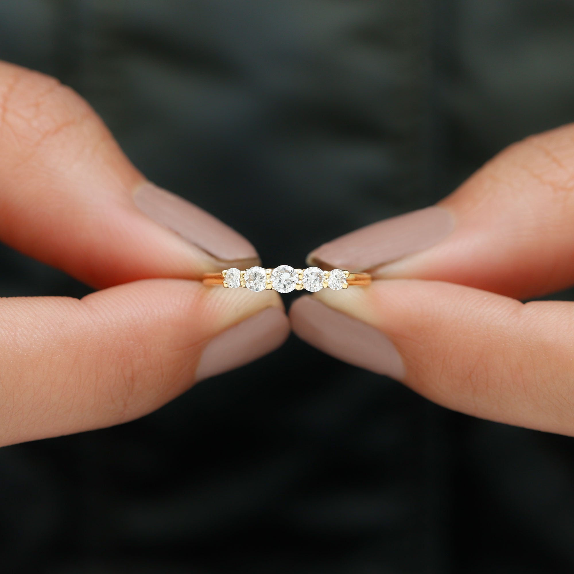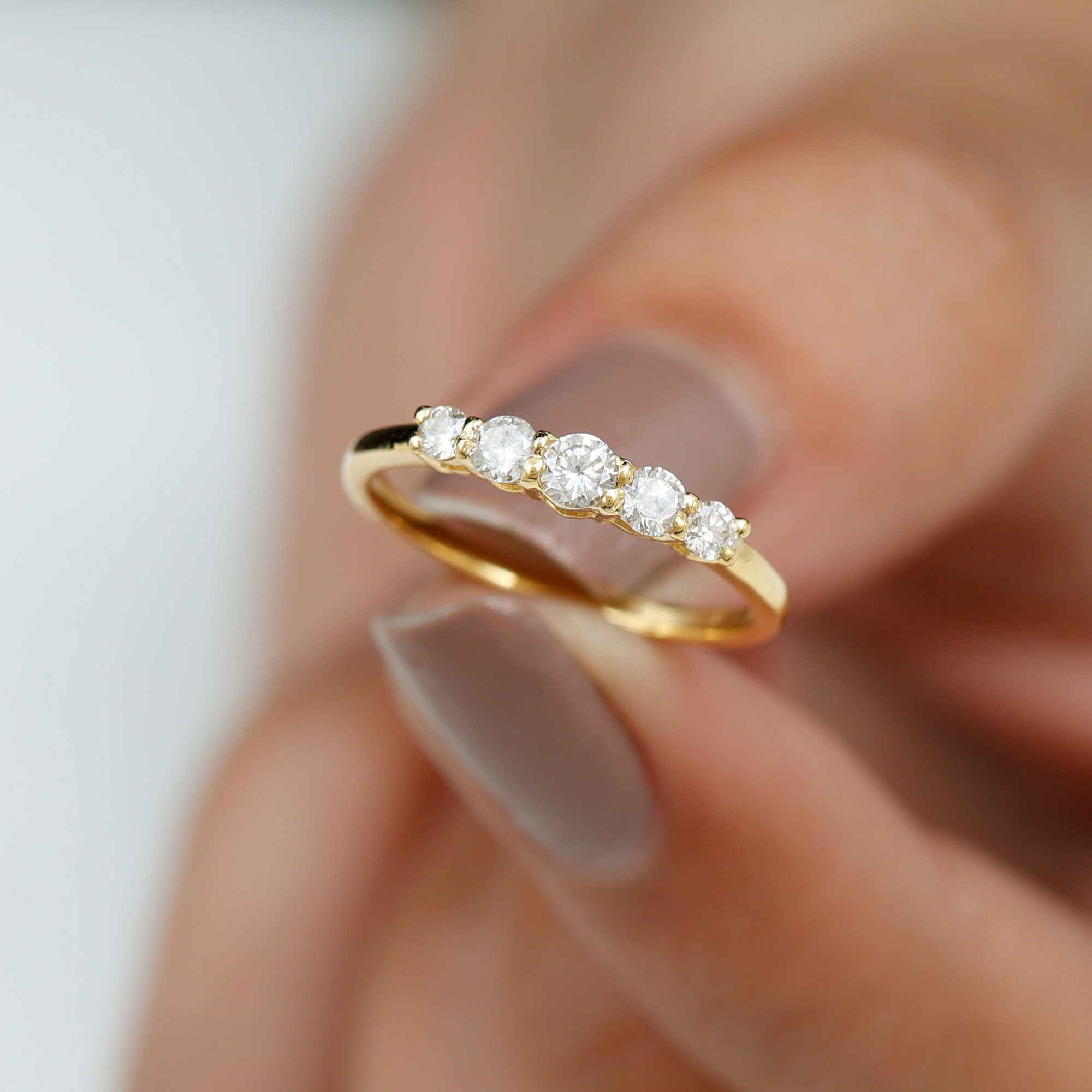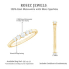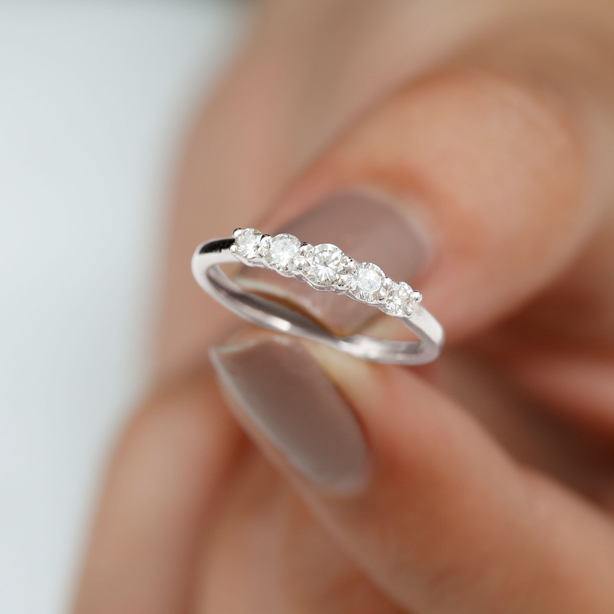 The timeless design of the Moissanite Promise Ring for Her enhances its overall appearance, highlighting the continuous shimmer of five round brilliant cut moissanites set in prong setting along the band for a sleek finish. The result is a ring that is both striking and understated, perfect for any occasion. This Five Stone Ring symbolizes eternal love and beauty, making it a favored choice for weddings, anniversaries, or any special event. Rosec Jewels has meticulously crafted this exquisite Round Moissanite Ring from precious metal, offering a variety of color and purity options. Celebrate your commitment with this Simple Ring, whose elegant design draws attention while keeping a subtle and enchanting glow. This beautiful piece will elevate any outfit, adding a touch of sophisticated shine and elegance. With D Color and VS1 Clarity grade, this Minimalist Ring is not only compatible but also exudes brilliant sparkle. Featuring a Ready to Gift option, this Proposal Ring is presented in a Signature jewelry Box, ensuring safe and secure storage.