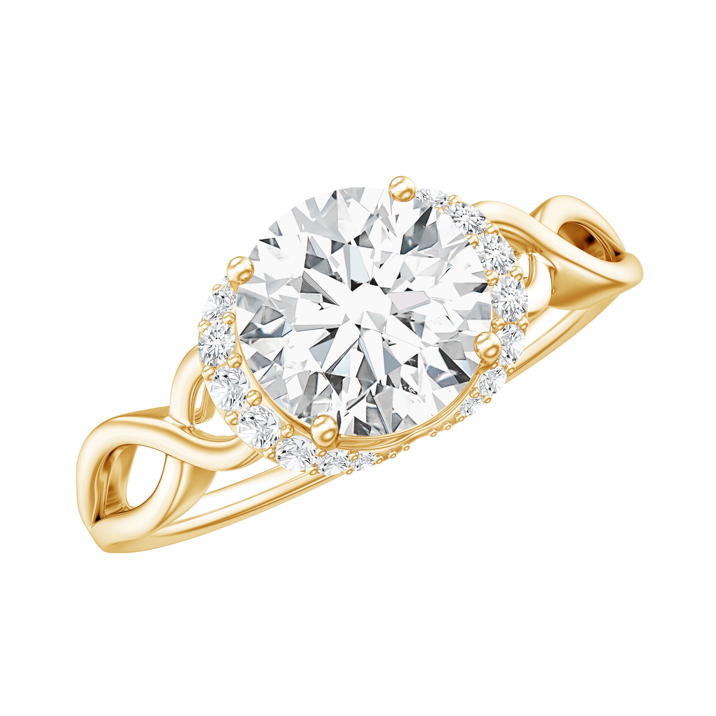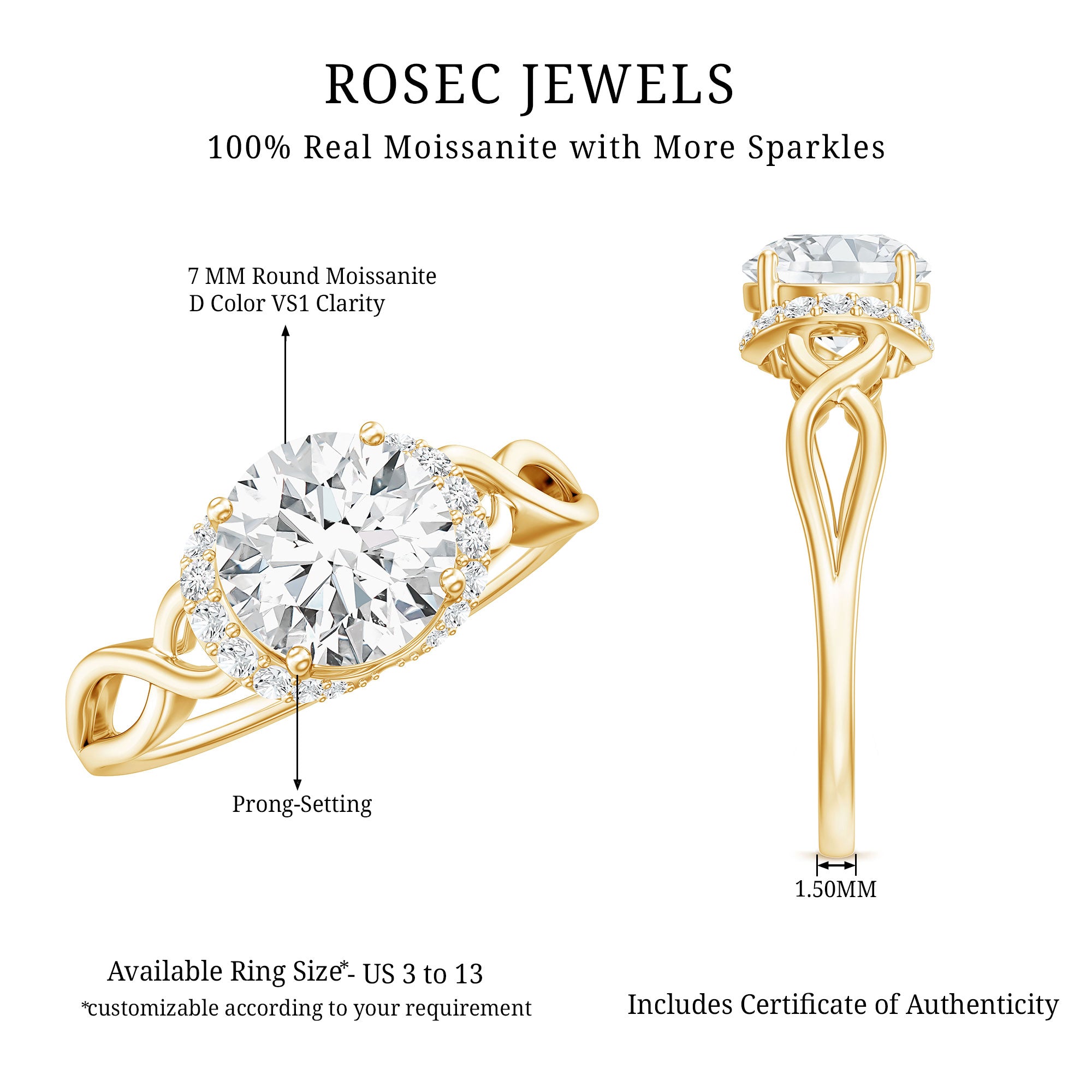 Make a timeless statement with this Moissanite Engagement Ring, a perfect reflection of love that lasts forever. At the heart of this captivating design lies a 7 MM round cut moissanite, securely nestled in prong setting. The band is thoughtfully crafted with a graceful infinity inspired twist, intertwining two paths into one unified design. This elegant motif represents a bond that is eternal, two souls forever connected. Along the shoulders of the band, petite round moissanites accent shimmer delicately, adding just the right amount of sparkle without overshadowing the center stone. Crafted with care and precision, this Infinity Engagement Ring is a beautiful blend of symbolic meaning and refined beauty. The D-VS1 quality moissanite stones offer high clarity and unmatched brilliance, making this Round Engagement Ring not only an eye-catching piece but also a mindful and luxurious alternative to traditional diamonds. Its contemporary charm and timeless elegance ensure it will be cherished for a lifetime. Presented in a beautifully crafted jewelry box, this Solitaire Moissanite Ring is ready to become the centerpiece of your love story, a symbol of forever, wrapped in brilliance and grace.