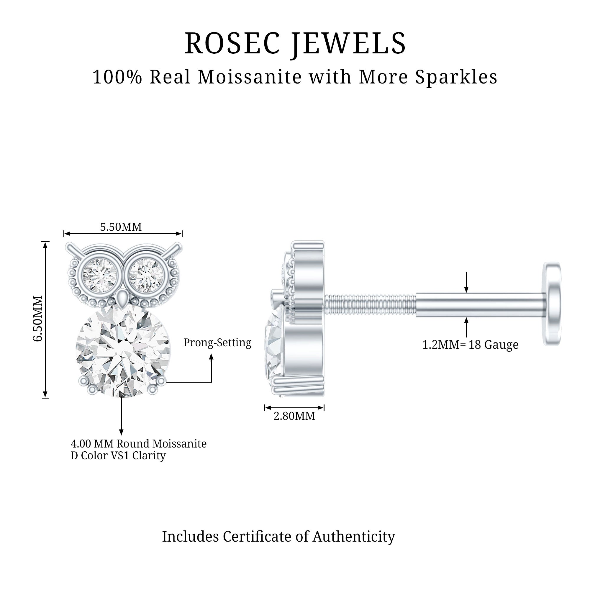 Round Cut Moissanite Owl Earring for Cartilage Piercing
