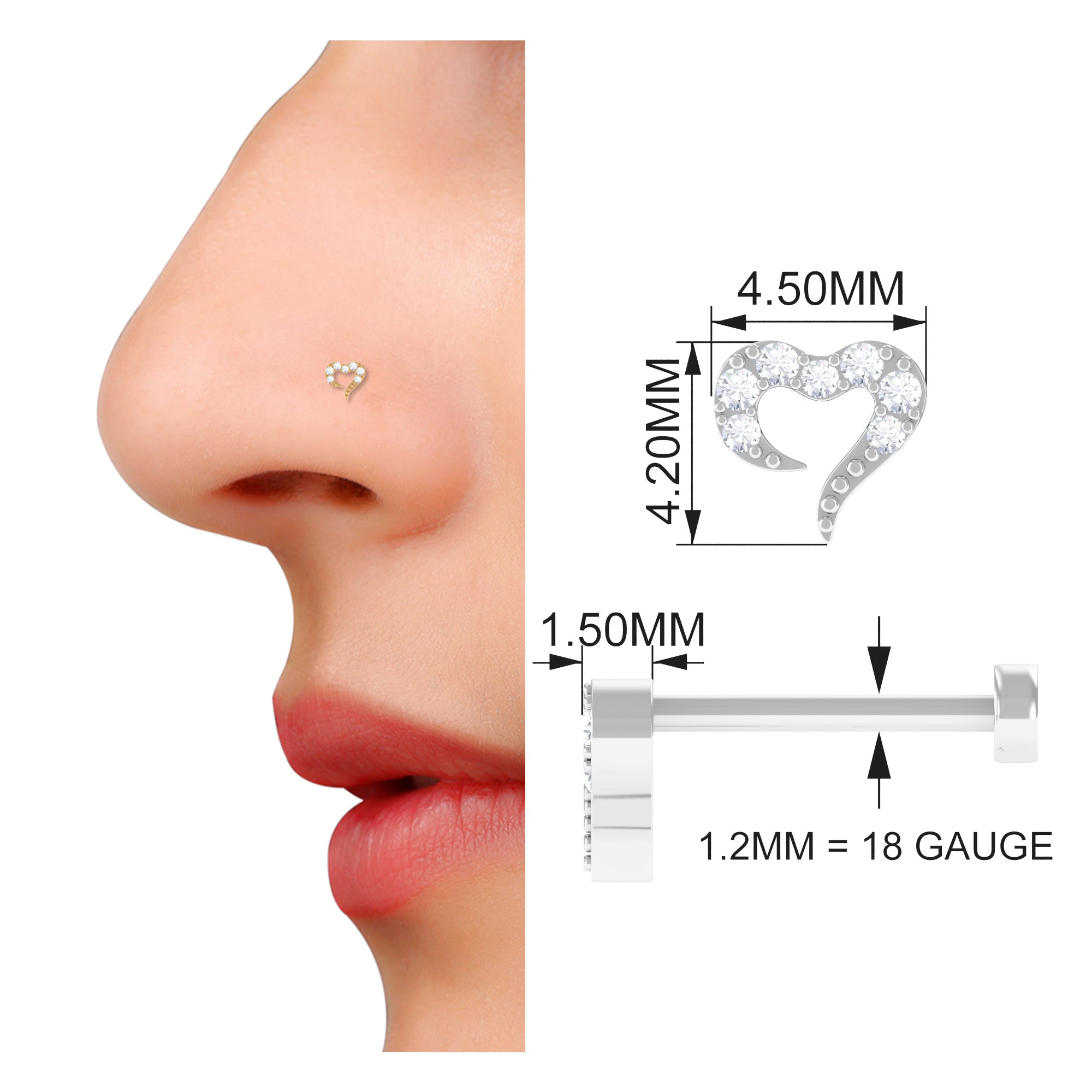 Indulge in the beauty of this Heart Nose Pin crafted from high-quality Gold and adorned with a stunning Round Shape Diamond in Prong Setting. Available in Yellow, White, and Rose Gold, its simple and elegant design is enhanced by the secure Flat Back Closure that ensures it stays in place all day long. Its tiny size and fashionable look make it a stylish accessory that can add a touch of elegance to your everyday outfit. This exquisite Nose Piercing is the perfect combination of simplicity and elegance, making it an excellent choice for any occasion. Surprise your loved one with this Heart Nose Pin as a thoughtful and romantic anniversary gift that she will cherish forever.