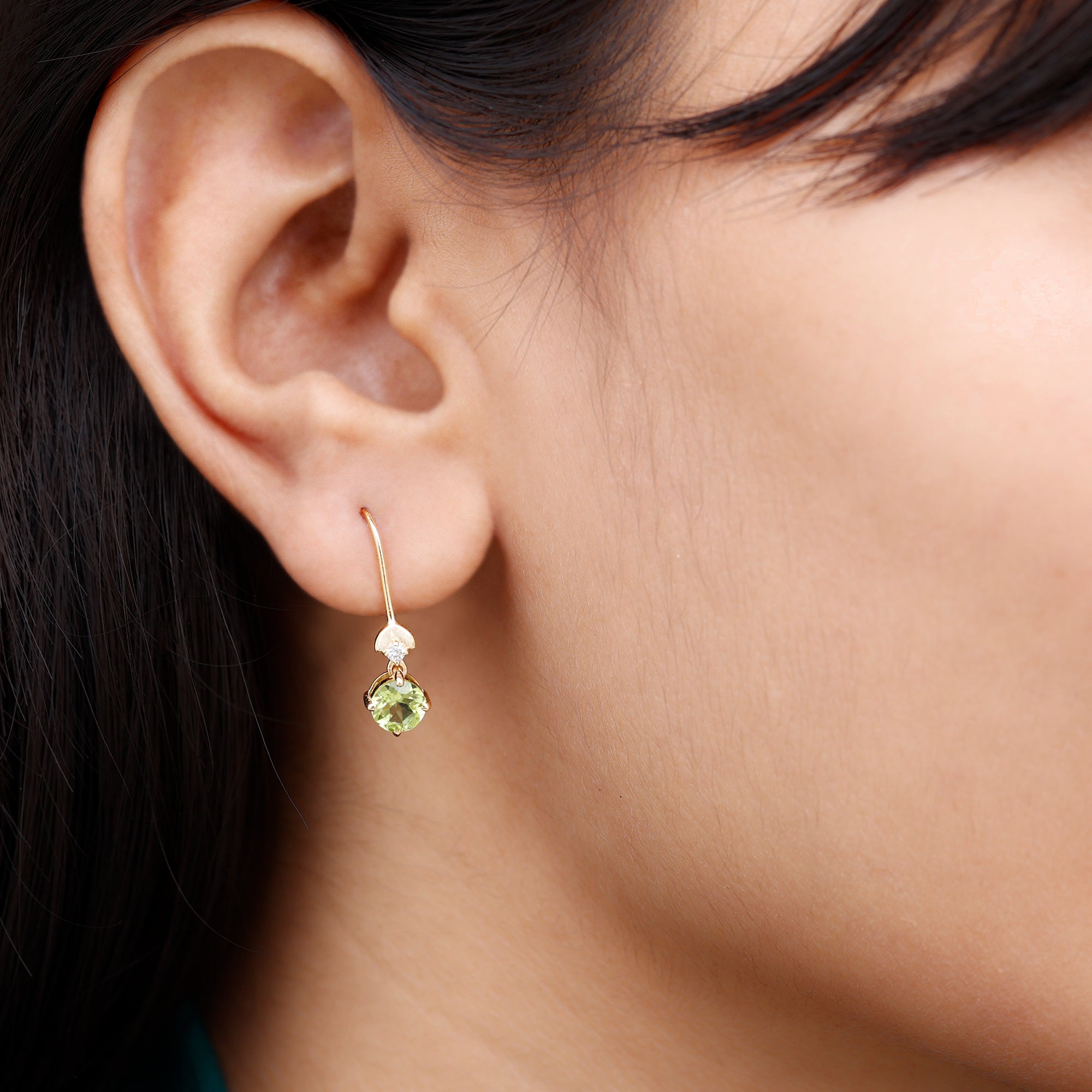 These Peridot Drop Earrings are embellished with fascinating Round Shape Peridot secured by 4 Prong Setting and Moissanite in Prong Setting. Grab these Fish Hook Earrings for your special one and make her special dress even more eye catchy. Let her know how much you adore her by presenting these August Birthstone Earrings.