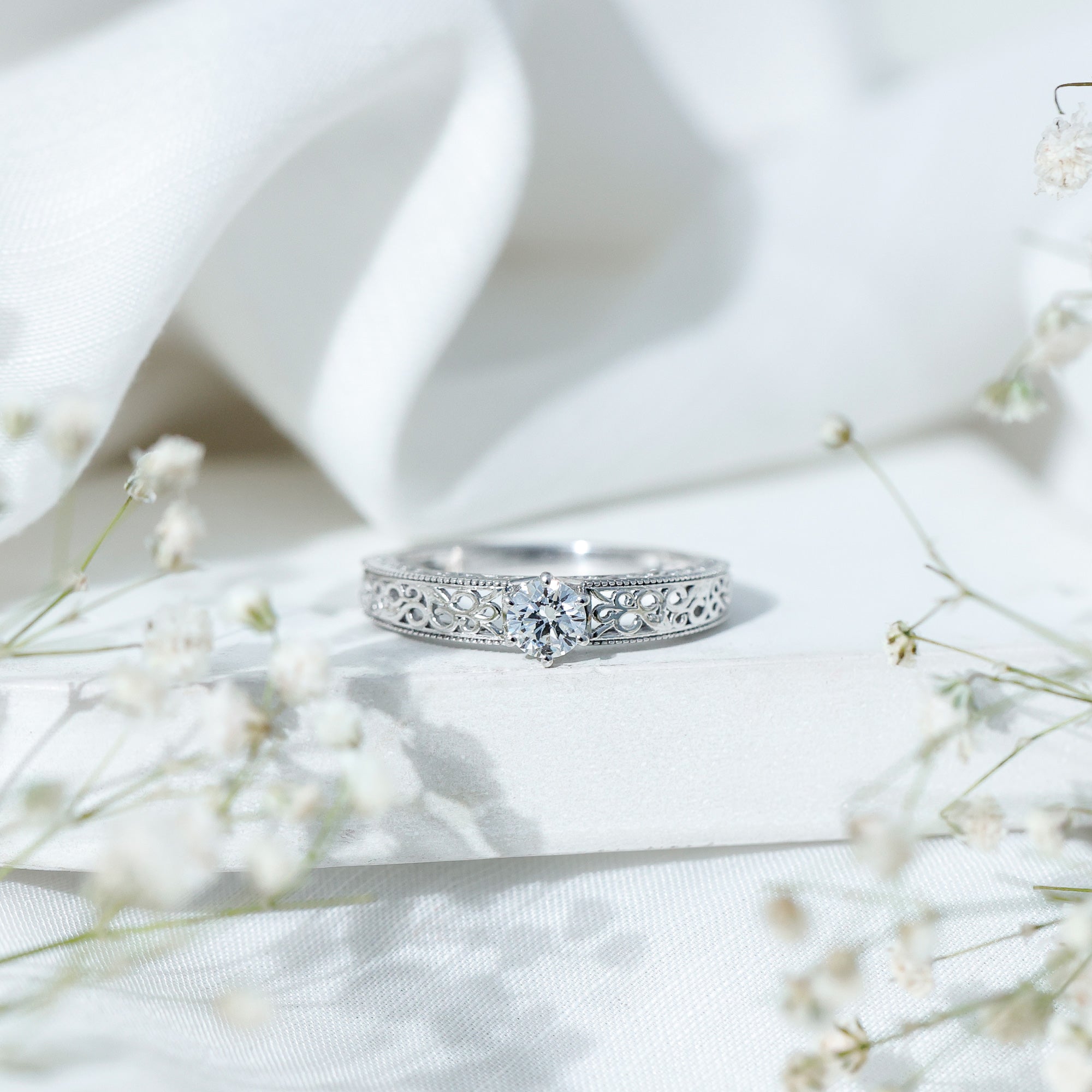 Round Cut Solitaire Moissanite Vintage Looking Engagement Ring