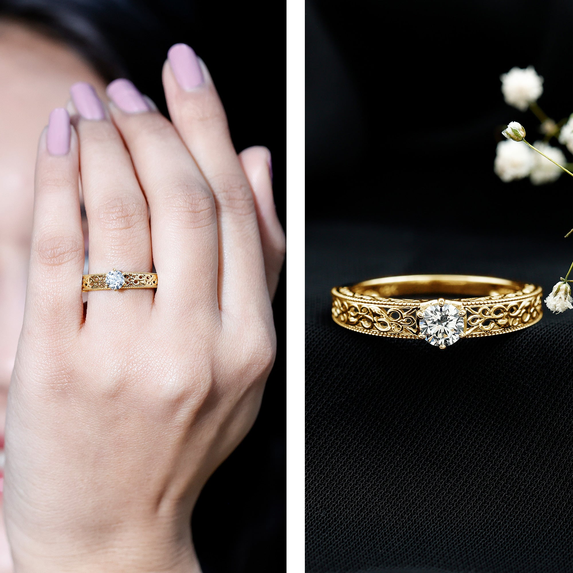 Like a treasure from the past, this Vintage Moissanite Engagement Ring tells a story of timeless love and beauty. At the center of the design sits a 5 MM Round Cut Moissanite, held securely in claw setting. Its perfect shape and fiery brilliance make it a stunning symbol of love and commitment, crafted to shine through every moment. The band features intricate Art Deco inspired filigree work, adding a rich vintage charm that feels both timeless and unique. The fine milgrain border on the band, giving it that soft, heirloom-quality finish. With a total weight of half carat, this Vintage Looking Engagement Ring is both delicate and eye-catching, perfect for brides who appreciate elegance with character. Designed for women who adore vintage flair, this Moissanite Solitaire Engagement Ring brings together romance, craftsmanship, and timeless beauty. Available in a variety of metal colors, types, and ring sizes, and delivered in a lovely jewelry box, this Antique Moissanite Ring also comes with a certificate of authenticity to ensure quality and trust. A truly memorable piece, this Vintage Filigree Ring is made to be cherished for a lifetime.