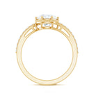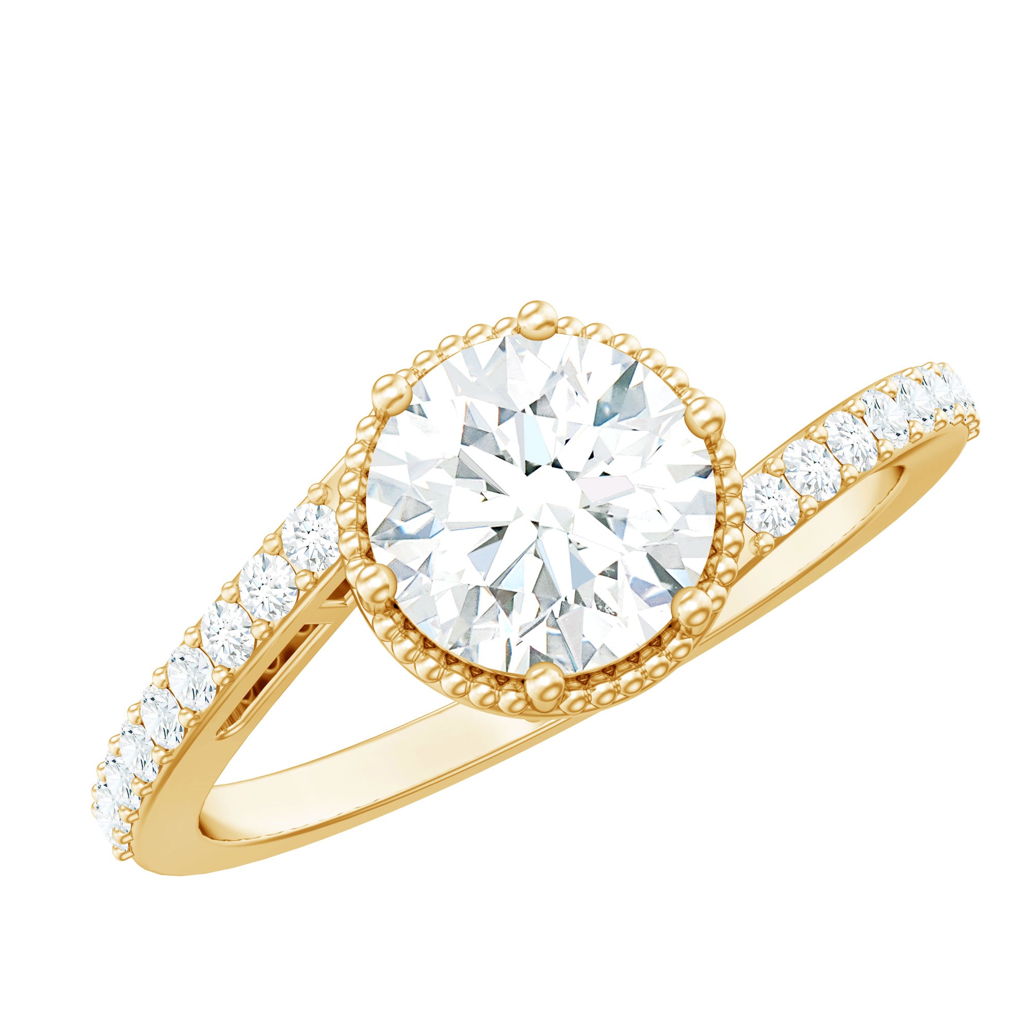 With a contemporary split shank design this ring has a unique solitaire Zircon with shining metal and a sculptural look. Amazingly crafted in Gold with a round shape cubic zirconia surrounded by a fold beaded detail and side stone. Stunningly adorn yourself with this timeless Simulated Diamond Ring.