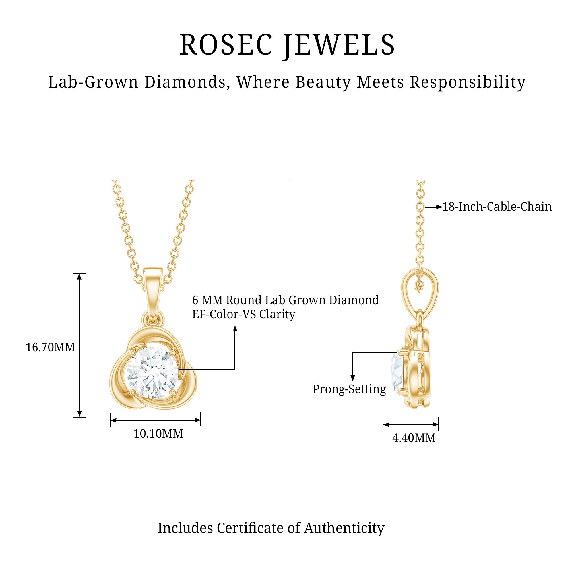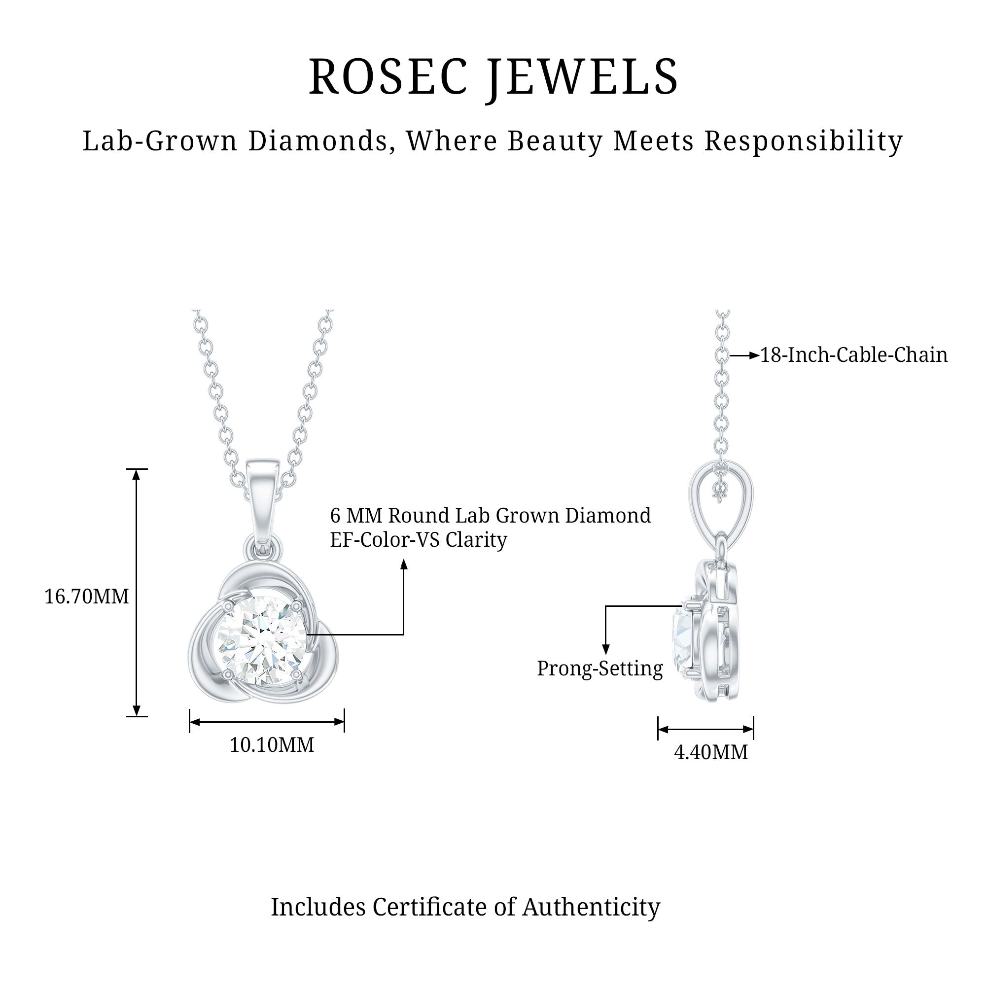 Dangle pure elegance with this captivating Diamond Pendant Necklace. This pendant necklace features a 6 mm Round Shape Lab Grown Diamond, encased in a Swirl Design. Meticulously crafted, this Floral Pendant Necklace reflects our commitment to quality and sustainability. Experience luxury with EF-VS Quality Diamond, where authenticity meets eco-conscious glamour. This Round Shape Diamond Pendant will be delivered to you in a premium quality jewelry box for storage when not in use.