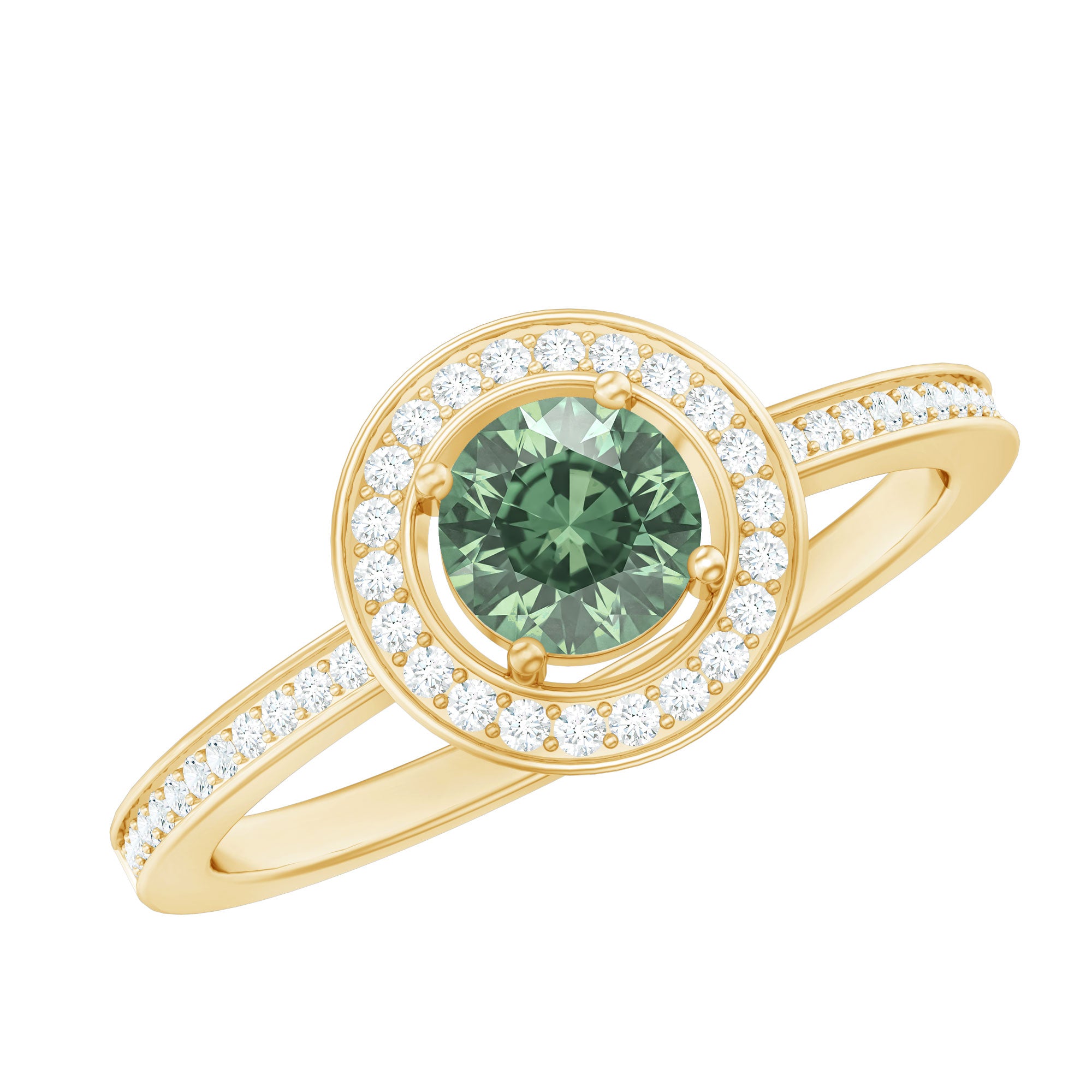 Experience the enchanting beauty of this Halo Engagement Ring. The stunning round green sapphire is embraced by a radiant Diamond floating halo, creating a captivating and ethereal allure. This ring is a true symbol of everlasting love and sophistication.