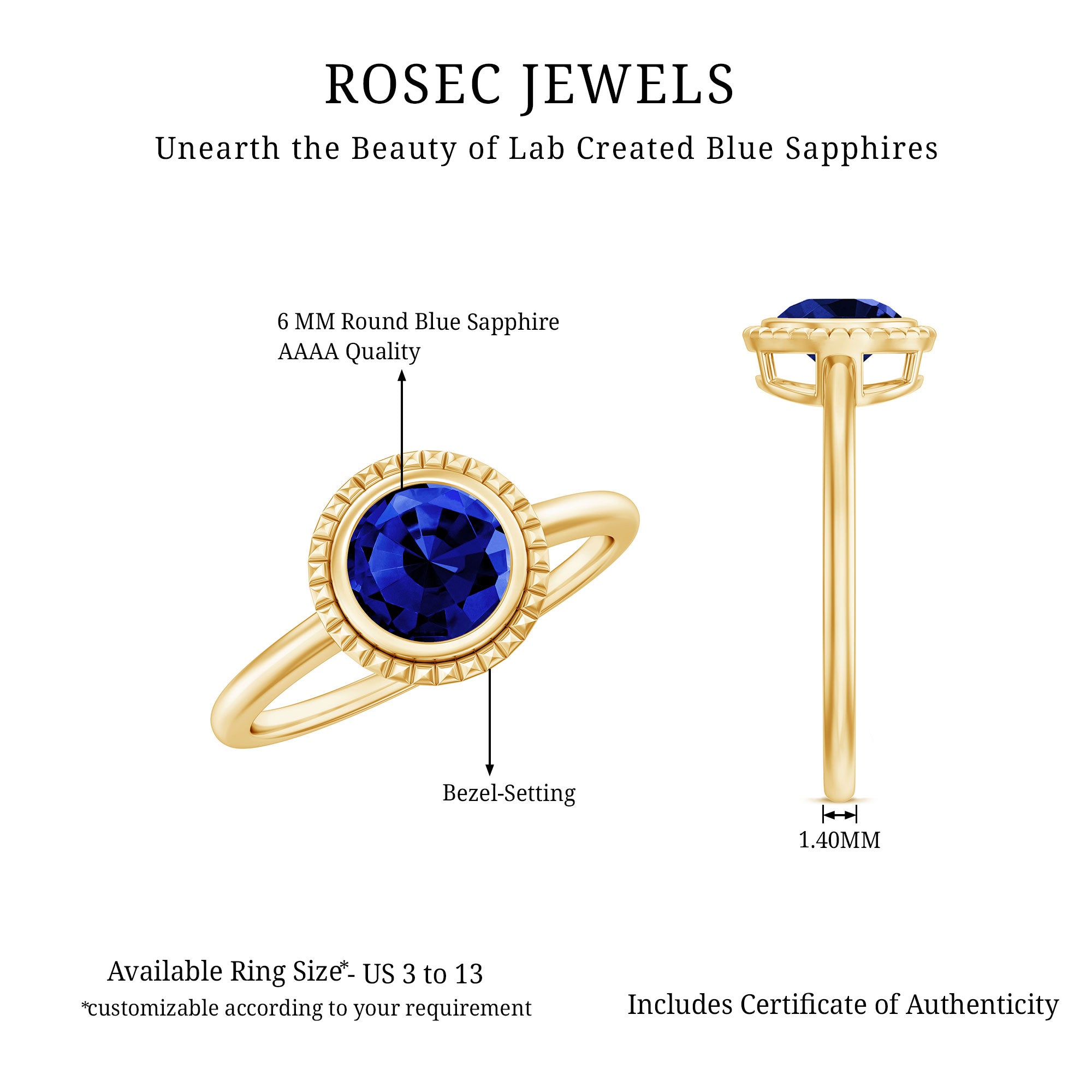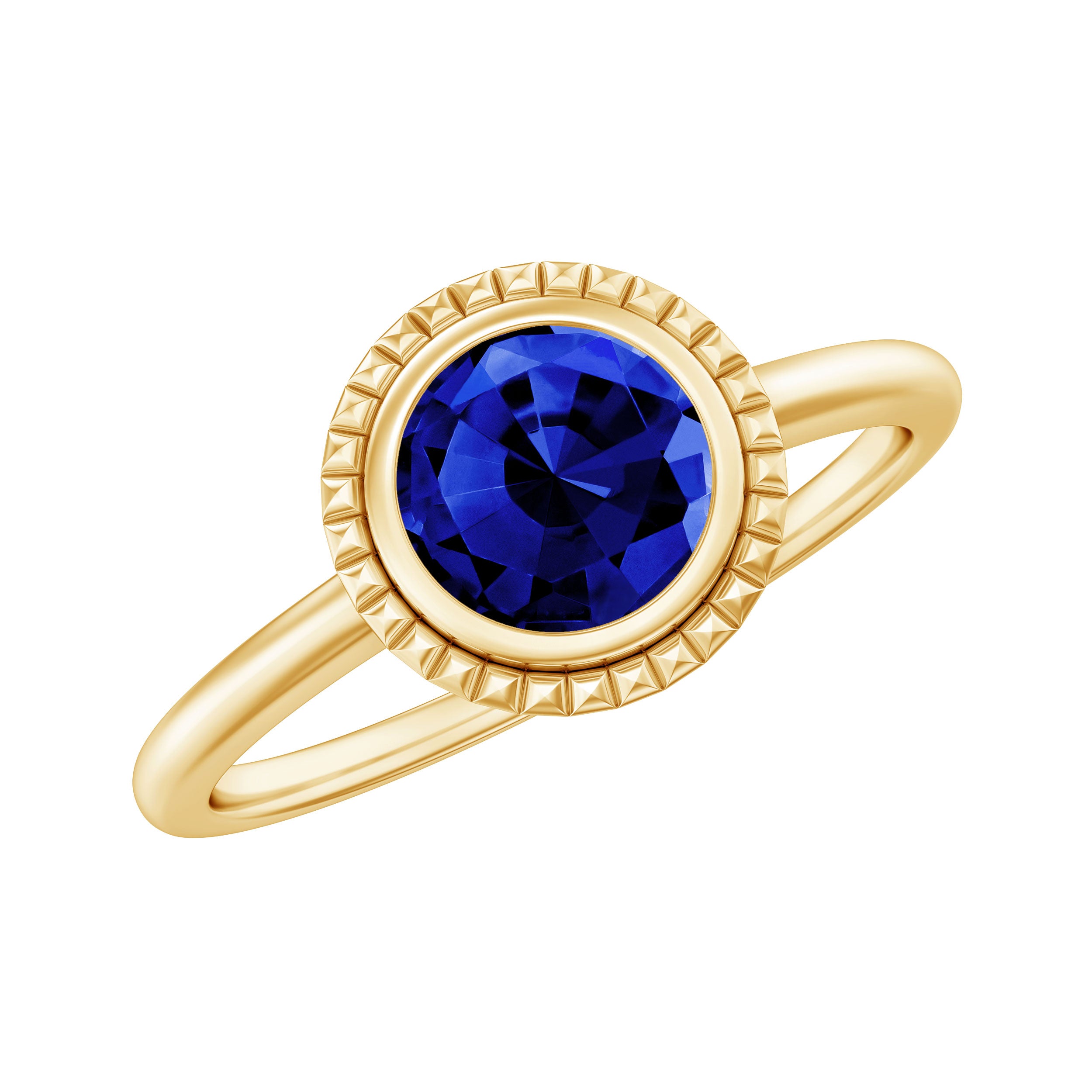 A Lab-Created Blue Sapphire Solitaire Ring makes a lasting symbol of your love. Featuring a round cut Created blue sapphire in a bezel setting with engraved gold details, this ring is made of gold metal. Its an ideal gift for weddings or special events for the woman you love.
