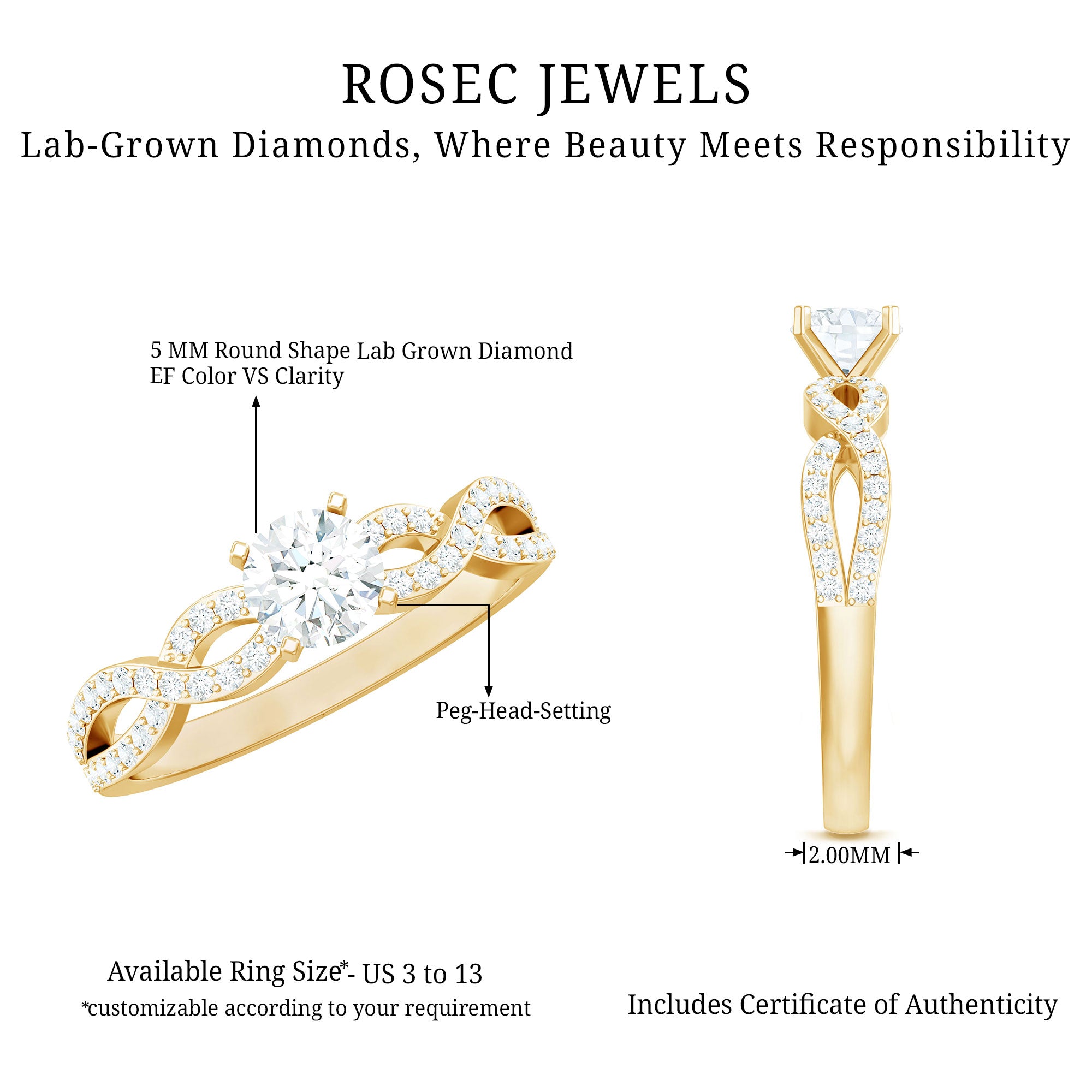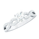 Here is a Lab Grown Diamond Infinity Ring that perfectly reflects upon the boundless spirit of all the boss ladies out there who refuse to give up, come what may! Boasting a one of a kind sparkle, it is effortlessly mounted by the Single Stone of 5 MM Round Shape Lab Grown Diamond that is fastened to the metal by Peg Head Setting. Complementing it at its finest is the meticulously crafted Infinity design on either sides of the center stone, encrusted with sparkling series of Lab Grown Diamond.