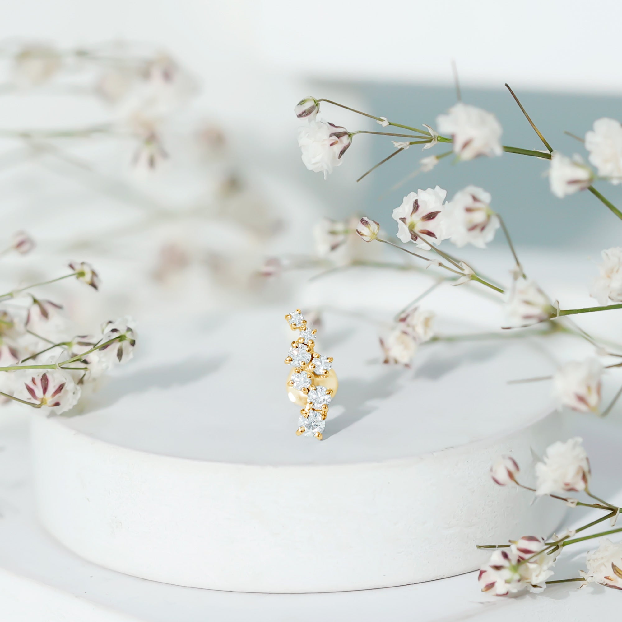 Make a statement with our stunning Moissanite Helix Crawler Earring, featuring a scattered pattern of Round Cut Moissanites secured by a prong setting. This Cluster Earring is perfect for adding a touch of glamour to your Helix, Cartilage, or Upper Lobe Piercing. Step into the spotlight and showcase your style with this show-stopping earring that is sure to turn heads.