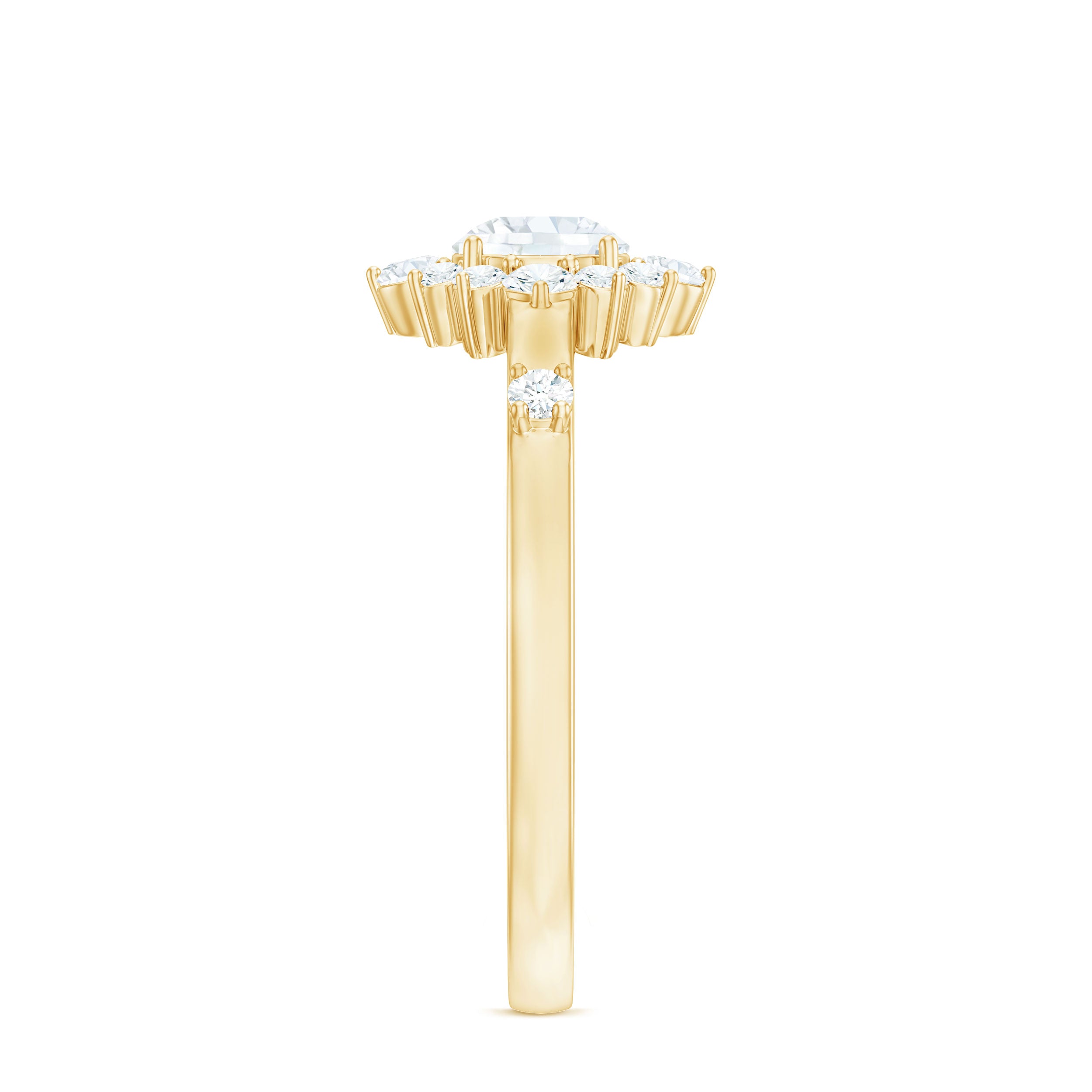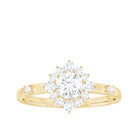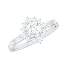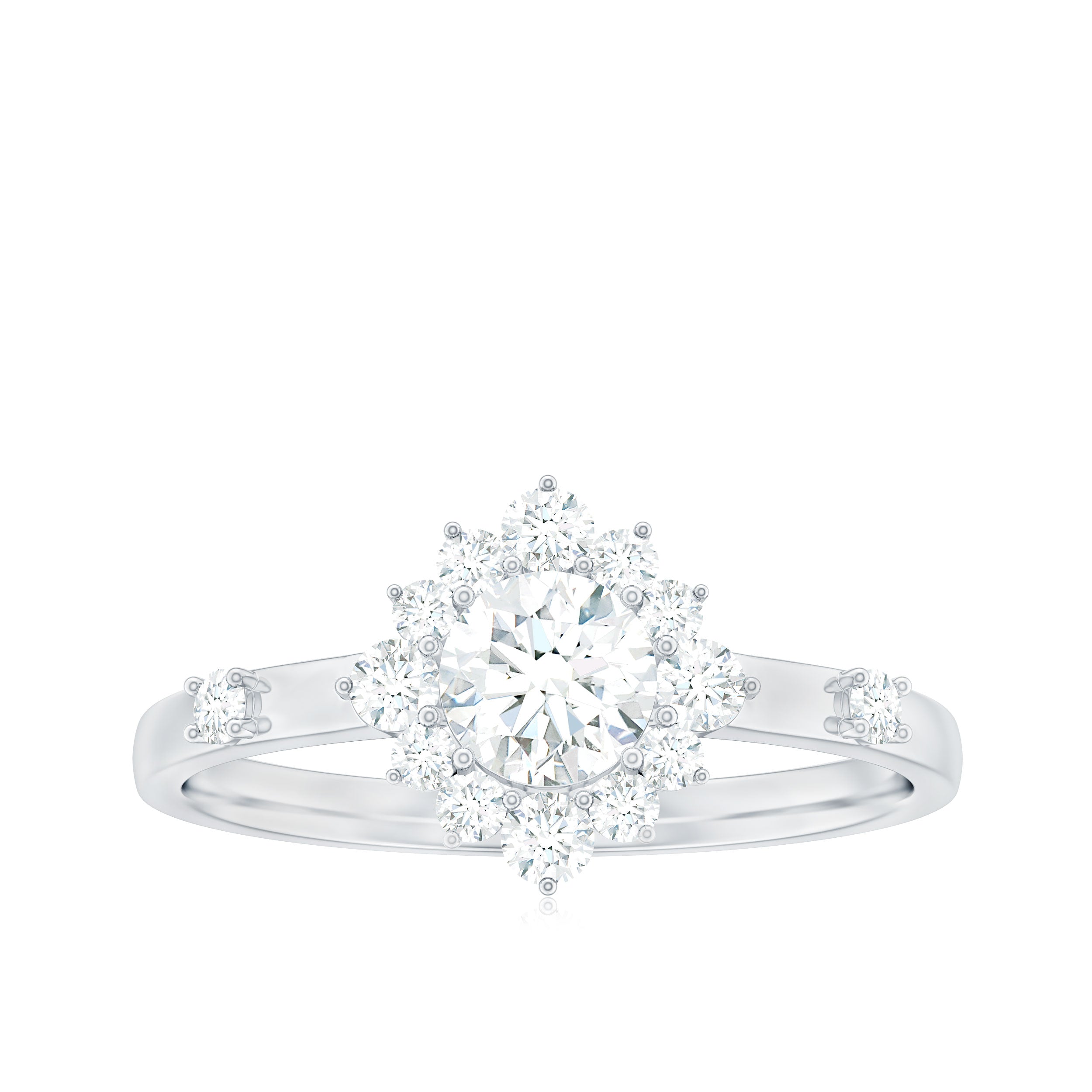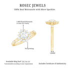 Mark the beginning of your forever with this beautiful Moissanite Halo Engagement Ring. Designed to celebrate true love, this ring features a 5 MM round cut moissanite at the center, held securely in prong setting. A sparkling halo of smaller moissanite stones surrounds the center gem, enhancing its brilliance and giving the Round Engagement Ring a timeless, elegant look. Adding to its charm, the band shows two round cut moissanite stones, one on each side of the center, creating a balanced and graceful design. The slim band offers a comfortable fit, making it perfect for everyday wear. Made for those who value both beauty and ethics, this Round Moissanite Engagement Ring uses a sustainable and eco-friendly gemstone that shines just like a diamond. With its classic design and radiant sparkle, this Classic Engagement Ring is available in US sizes 3 to 13 to ensure the perfect fit. It comes in an elegant jewelry box, making it ready for that unforgettable moment. Let this ring be the symbol of your love, brilliant, lasting, and full of heart.
