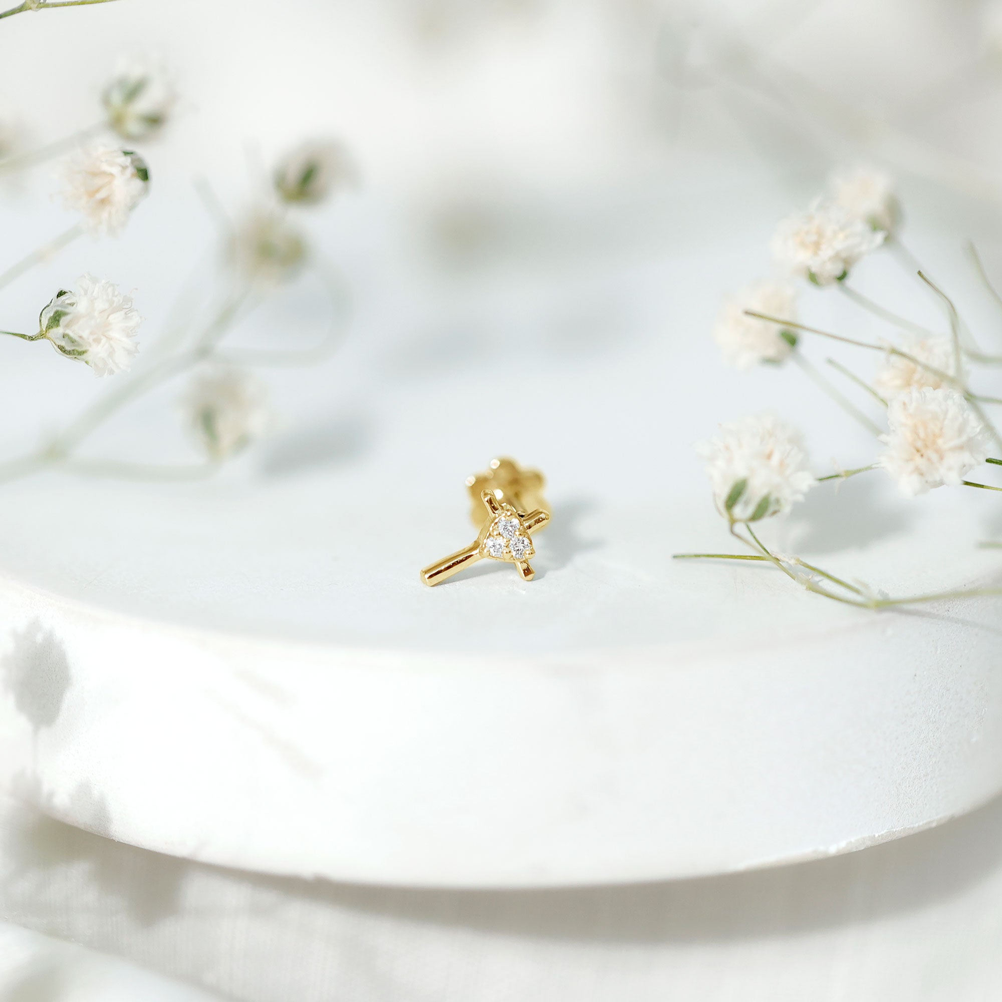 Modern style meets sparkle in the Diamond Cross Earring, a piece that feels playful, meaningful, and easy to wear. At the center of the design, three diamonds come together in a heart shape, set closely in pave setting to create a bright and eye-catching shine. The religious cross sign gives the Diamond Helix Earring character while keeping it light and wearable for daily use. Comfort plays a big role in this design. The flat back closure sits smoothly against the skin, making it comfortable enough to wear all day and even while resting. Its size and shape allow it to be worn in several piercings, including the helix, cartilage, tragus, conch, or upper lobe, giving plenty of styling options. Casual outfits get an instant lift with this Diamond Tragus Earring, while party looks gain a subtle sparkle. Worn alone, it stands out nicely, and when paired with other earrings, it blends in beautifully with an ear stack. Crafted with care and attention to detail, the Religious Earring comes packaged in a jewelry box along with a certificate of authenticity for peace of mind. Custom options are available in different metal colors and types, allowing it to match personal style preferences.