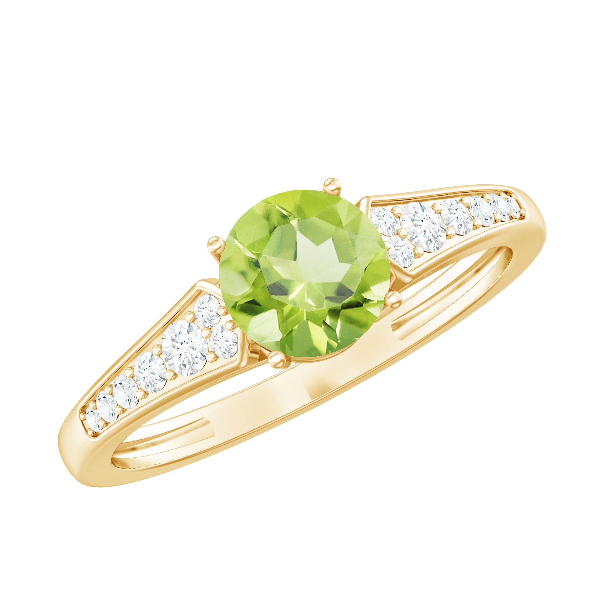 Add a flair of charm to your look with this elegant solitaire ring that features a Round Shape peridot gemstone at its center, with sparkling Diamond side stones on either side. The light green hue of the peridot is beautifully complemented by the shimmering Diamond stones, creating a delicate and sophisticated look. Perfect for any occasion, from a proposal to a special anniversary, this ring is sure to be treasured for its beauty and meaning. A symbol of love and commitment, this ring is the perfect choice for the one you love.