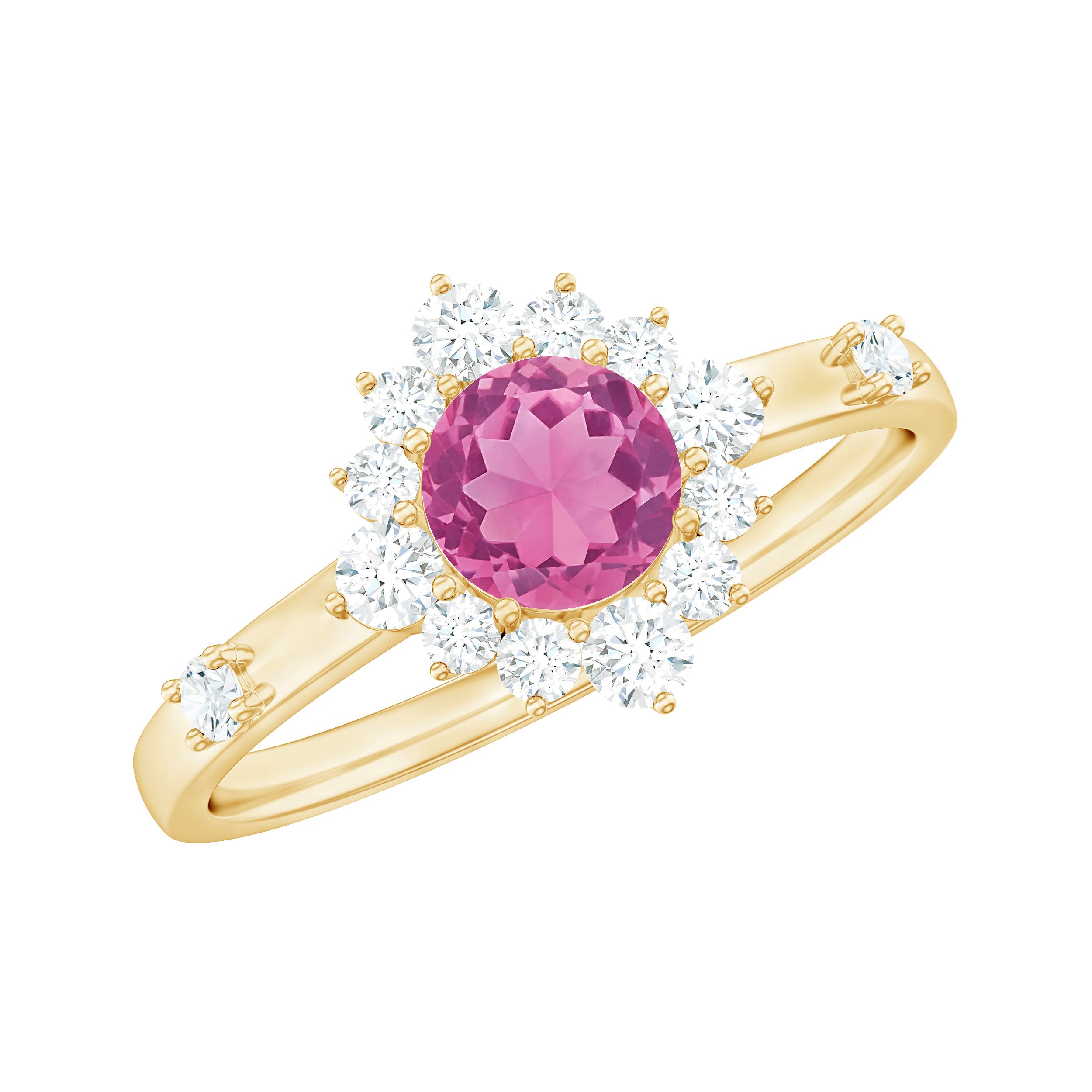 Add a touch of elegance to your attire with this charming Pink Tourmaline Ring, crafted from solid gold. The Engagement ring features a Round Shape Pink Tourmaline set in a Halo style, surrounded by Diamond stones to create a captivating appeal. This classic gold ring with its stunning design is the perfect accessory to complement any outfit.