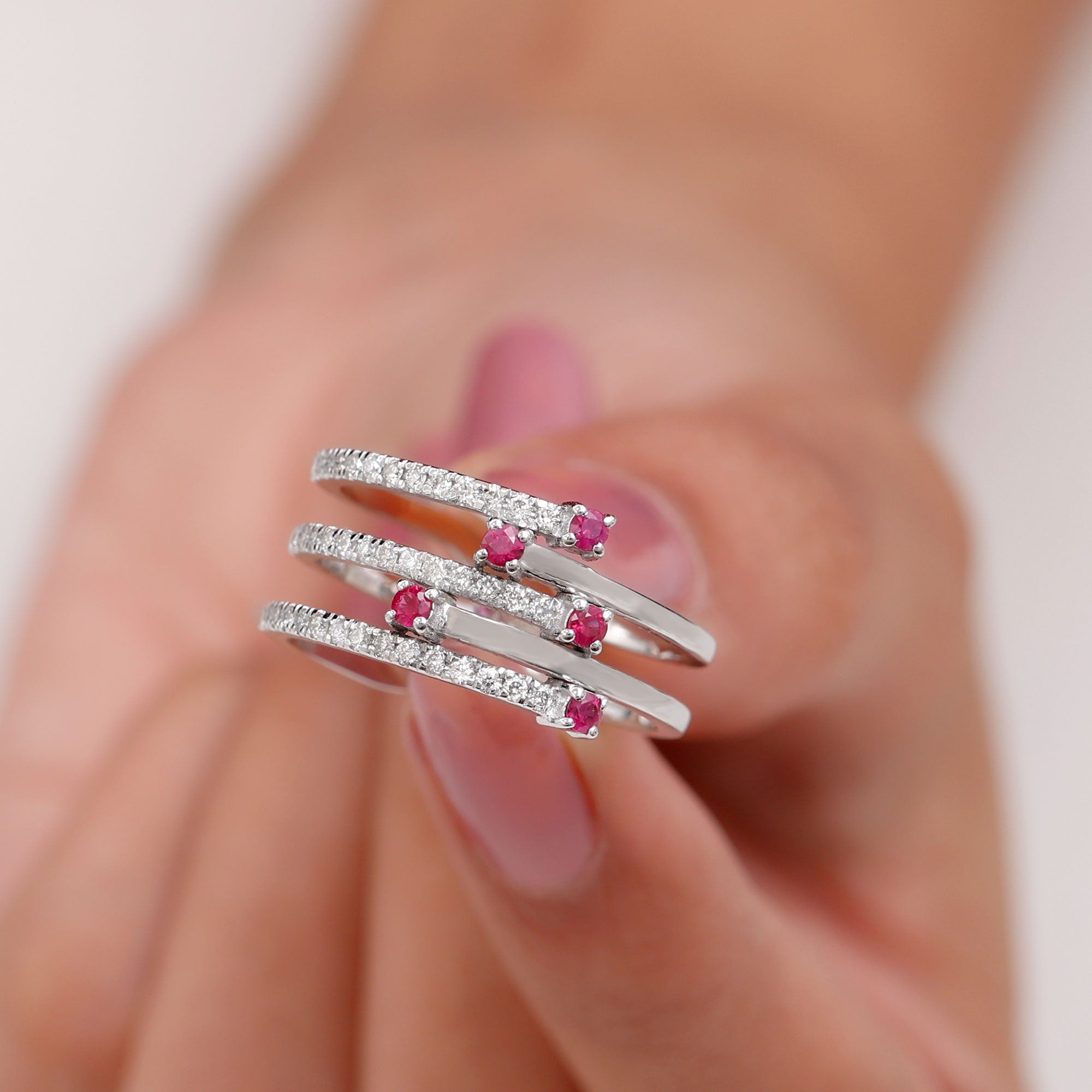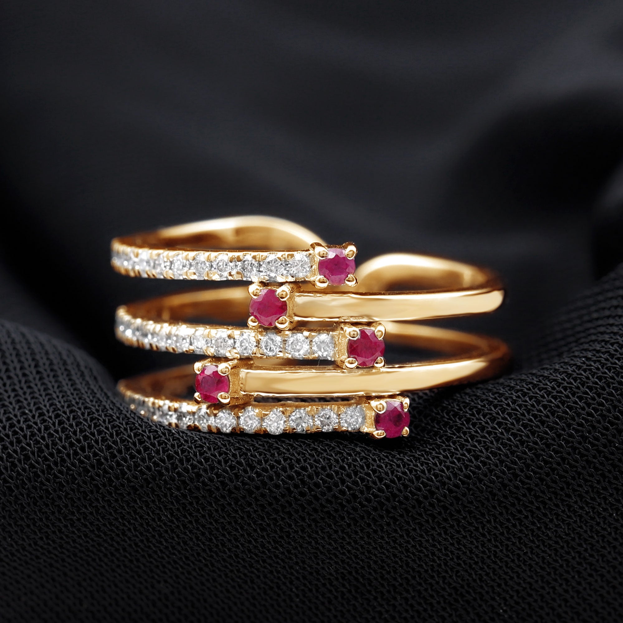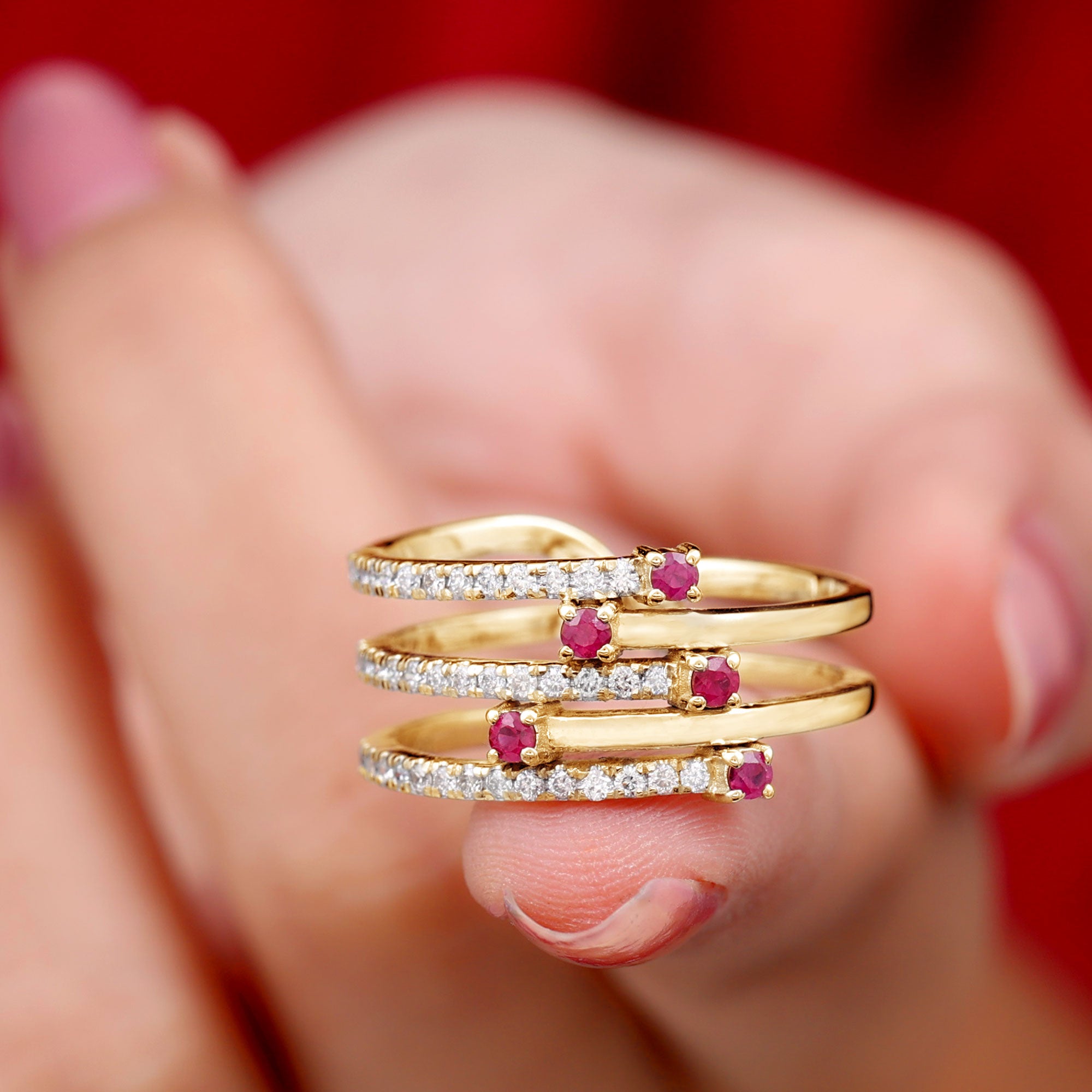 Treat yourself to the beauty and luxury of this stunning round ruby and Diamond wrap ring. This stunning Round Ruby and Diamond Wrap Ring is a perfect way to add a touch of luxury and elegance to your wardrobe. The ring features round-cut rubies in a zig-zag form, surrounded by a halo of sparkling Diamond stones. This ring is perfect for any occasion, from a night out on the town to a formal event. It is also a great gift for a loved one, especially for those born in July, as the ruby is the birthstone for that month.