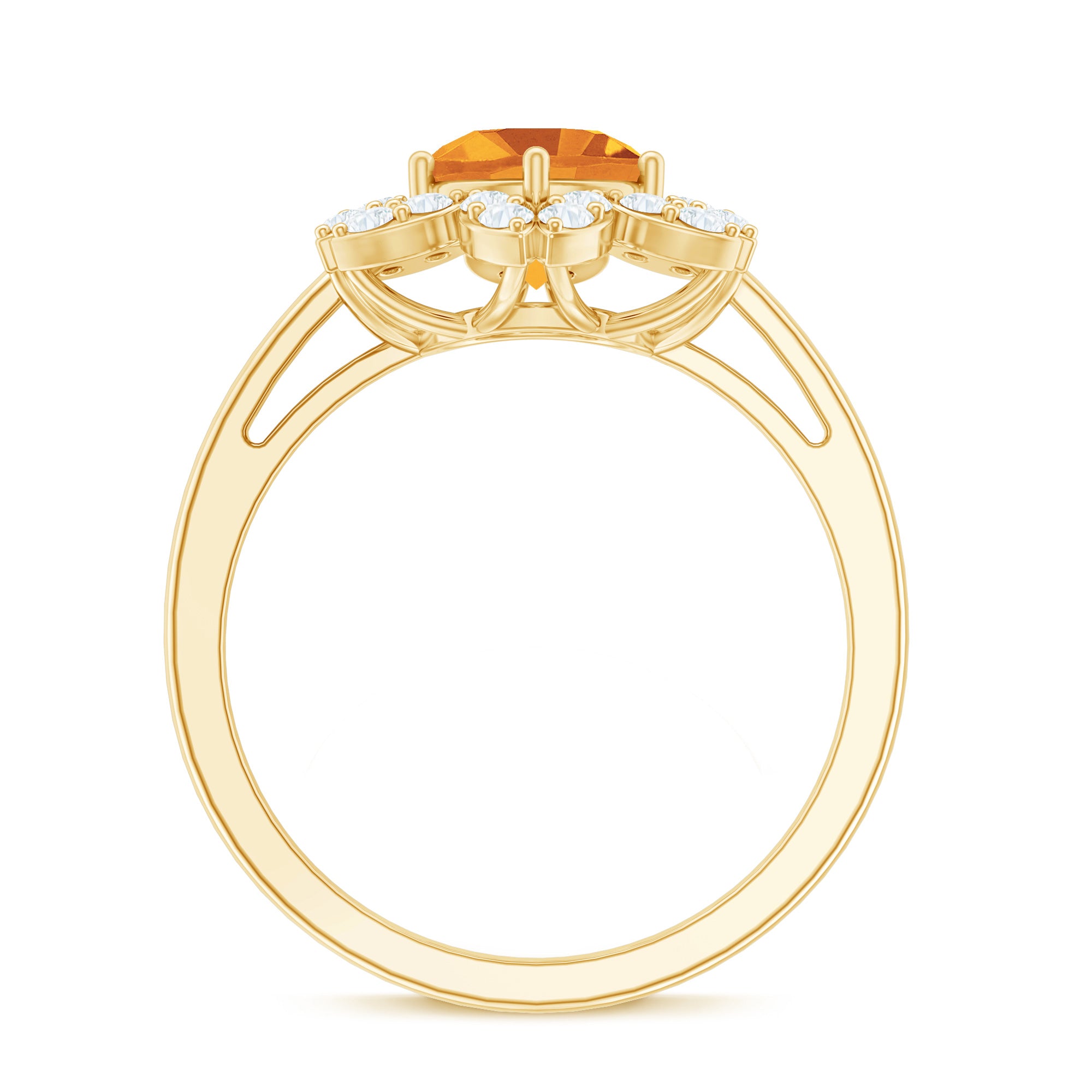 Embrace a trendy look by wearing this elegant Flower Ring adorned with Round Shape Citrine in 6 Prong Setting with Diamond Halo. Crafted with Gold, this Citrine Ring will bring intense shine and allure to your look. Surprise your lady love with this alluring Yellow Citrine Ring and make her heart flutter.