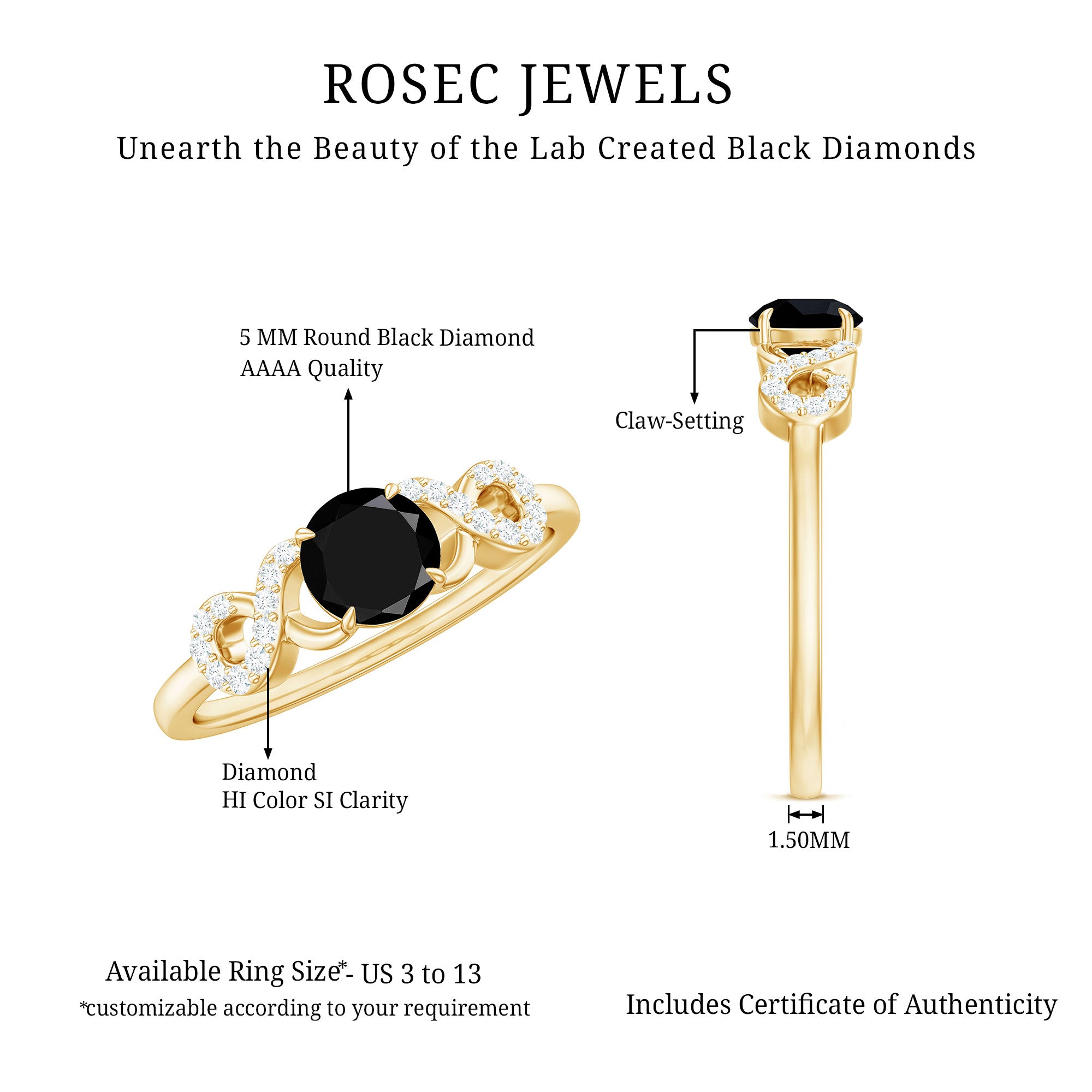 This exquisite engagement ring is sure to turn heads. It features a stunning round-cut created Black Diamond solitaire in the center, surrounded by crisscross band of gold embellished with round-cut Diamond stones. At 5 MM, the created Black Diamond solitaire shines bright, making this ring a beautiful and meaningful symbol of love.