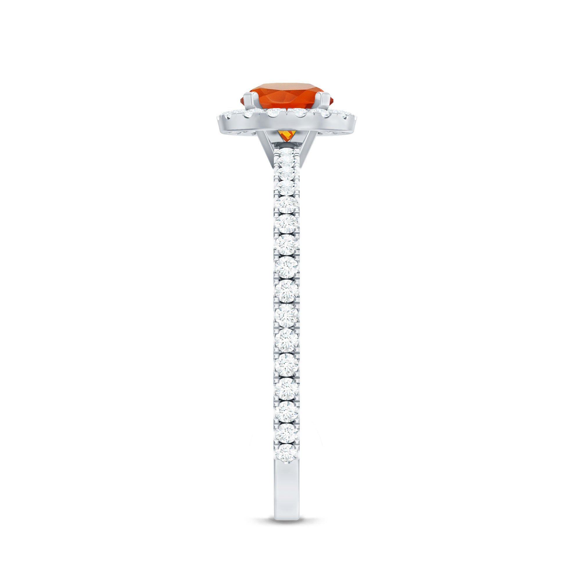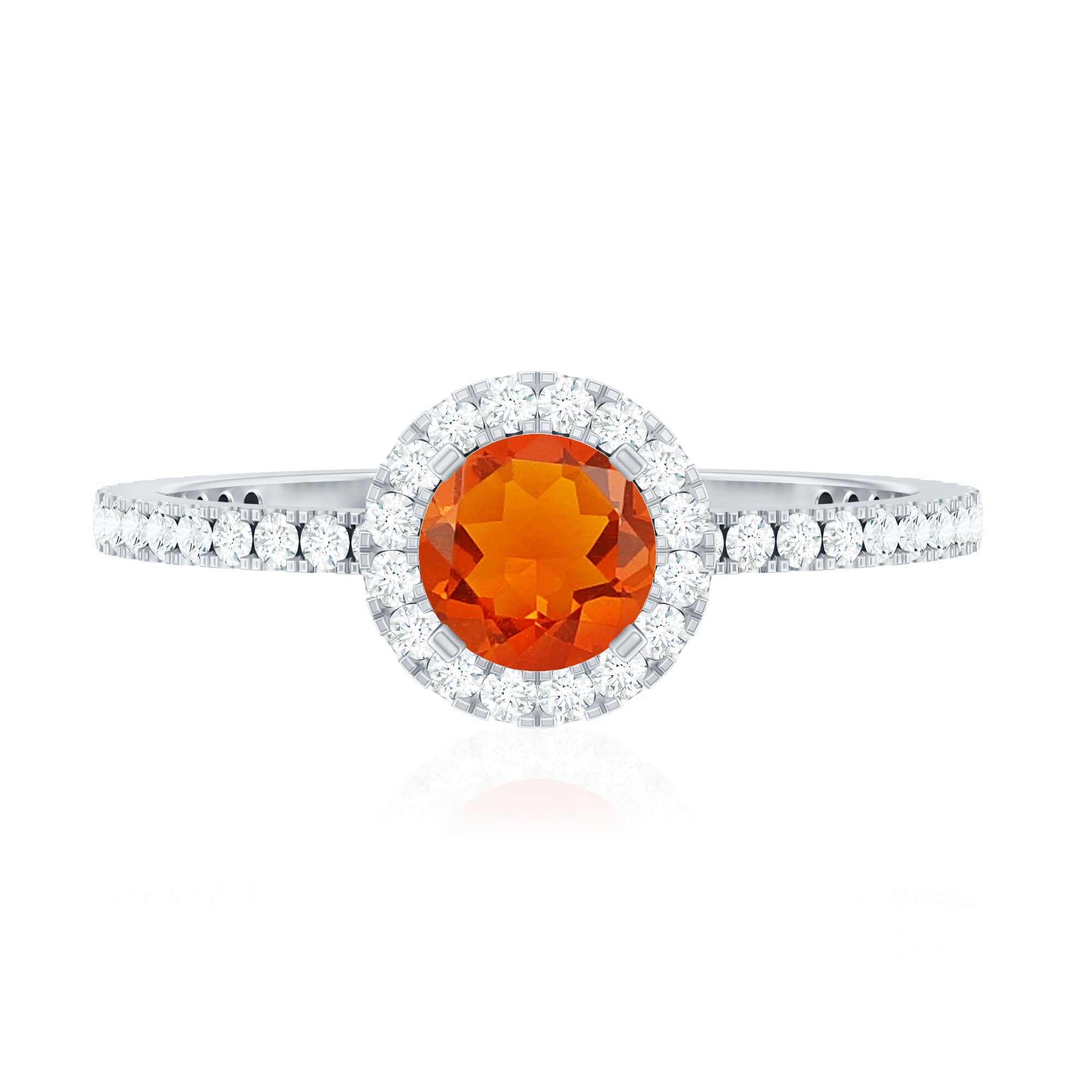 Make your special day more memorable with this stunning engagement ring that features a round shape fire opal center stone, beautifully surrounded by a halo of sparkling Diamond stones. The fiery orange-red hue of the opal is truly captivating, symbolizing passion and desire. The halo of Diamond stones adds a touch of sparkle and elegance, creating a beautiful contrast against the rich opal. The band is also studded with similar Diamond stones. This ring is the perfect choice for those who want a unique and vibrant engagement ring that is sure to make a statement. It is a true symbol of love and commitment.