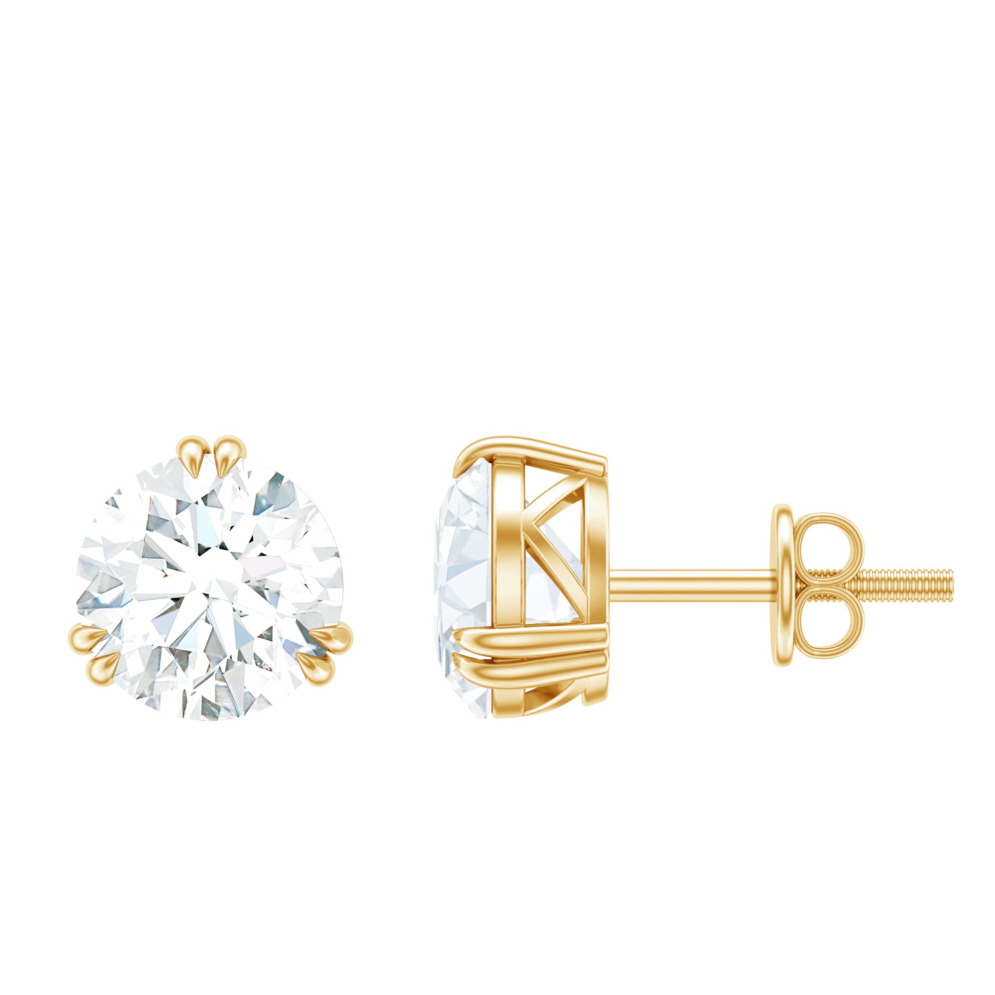 Enhance your outfit with these sophisticated, Gold Solitaire Stud Earrings. The earrings feature a round-cut Moissanite set as a solitaire in a 3 double claw prong setting.