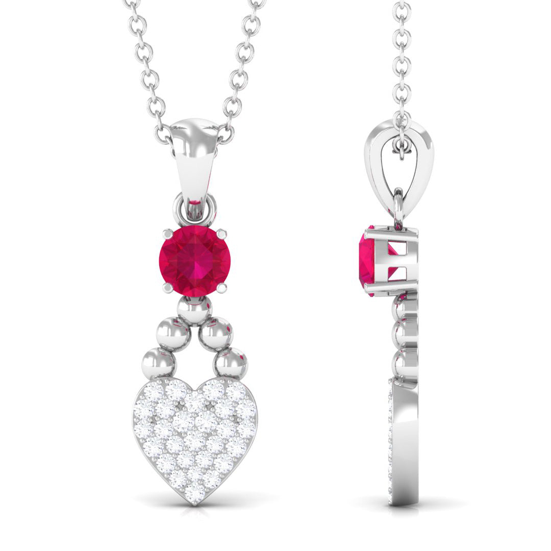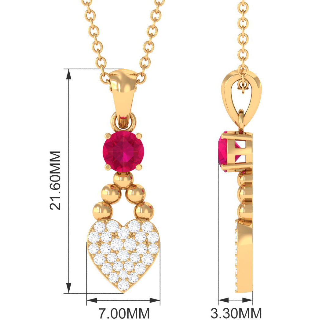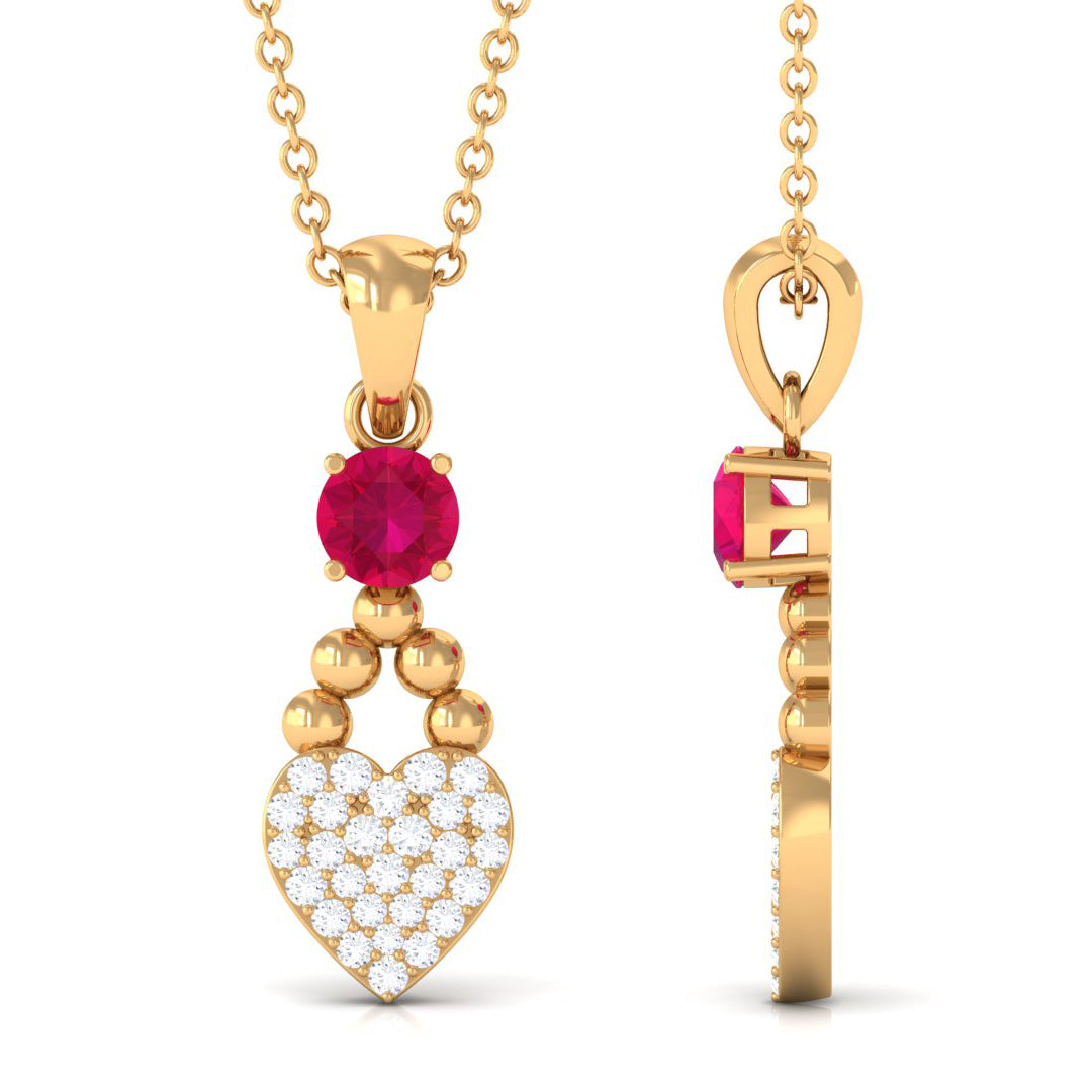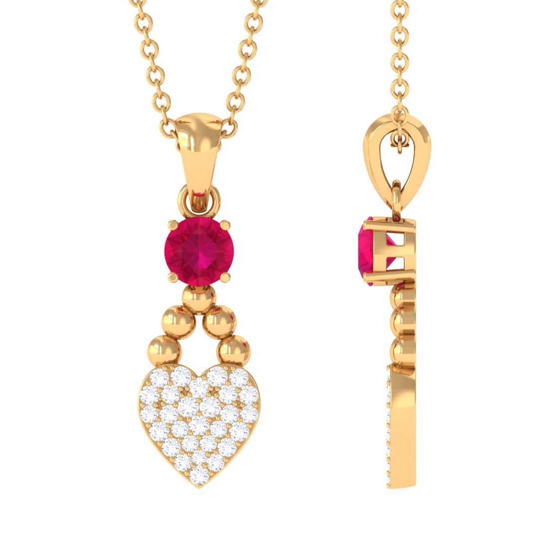 This dazzling heart pendant is a true testament to love and elegance. Made of lustrous gold, it features a stunning round-cut Ruby at its center, and a heart shape decorated with round-cut Diamond stones. The pendant intricate design adds a touch of glamour and charm to any outfit, making it a perfect gift for a loved one or a beautiful addition to your jewelry collection. The rich red hue of the Ruby is a symbol of renewal, growth, and new beginnings.