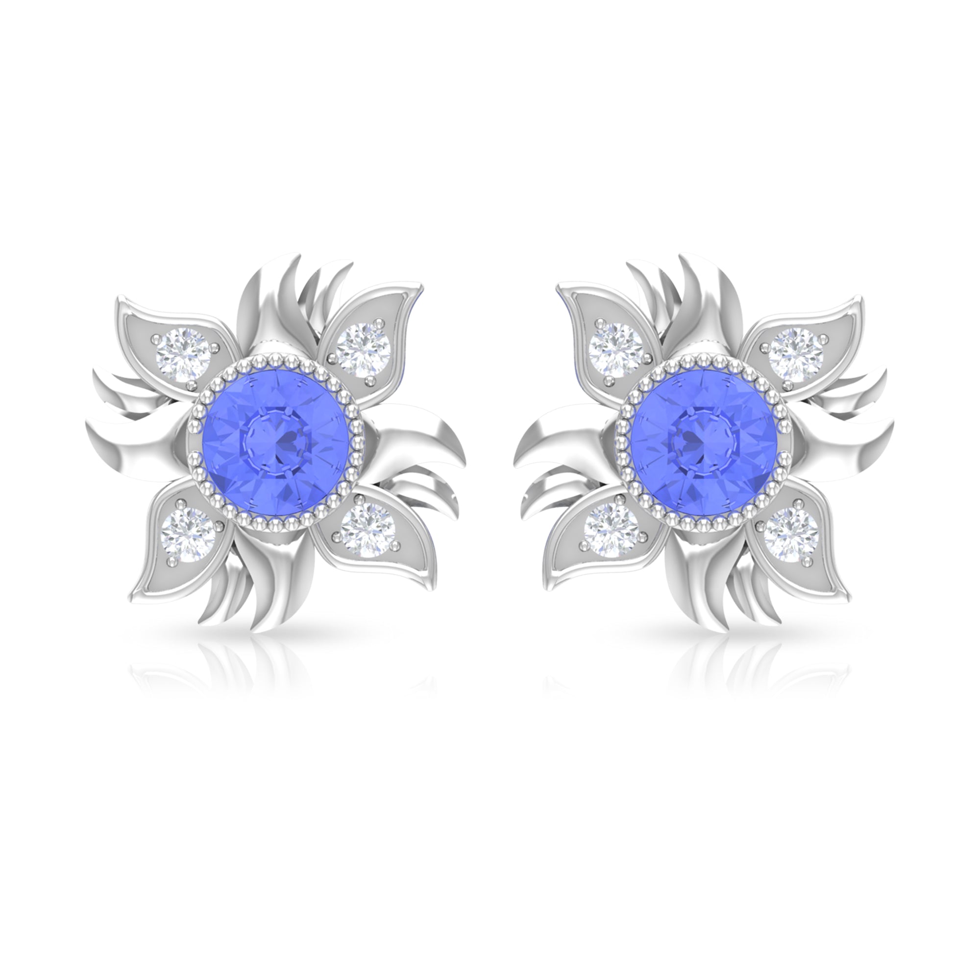 This Sunburst Stud Earrings is embellished with Round Shape Tanzanite is set at the center in a Bezel Setting and round shape Diamond are set as floral pattern.