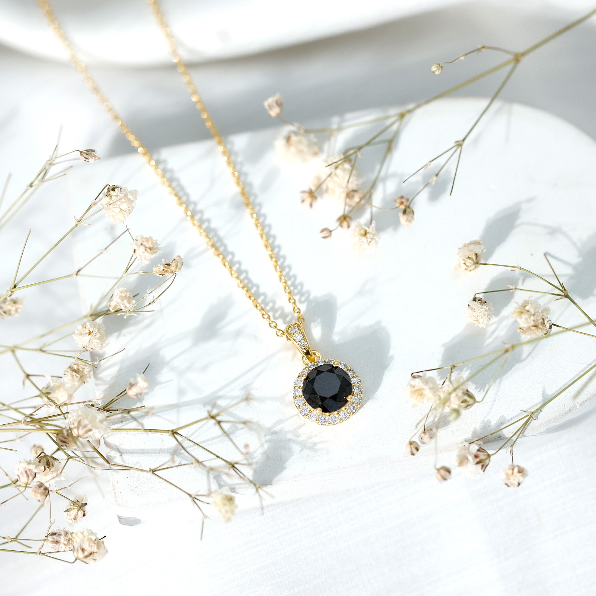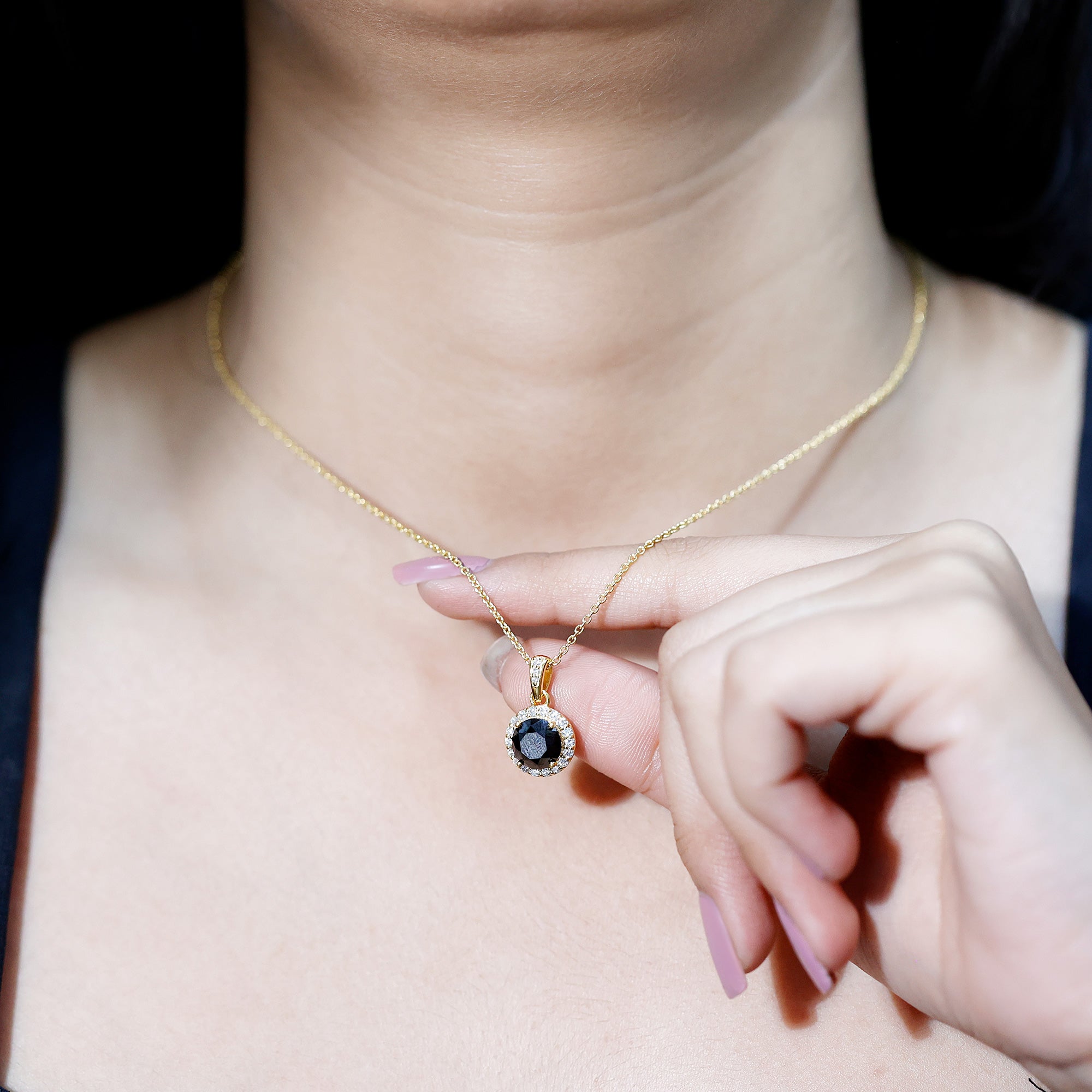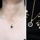 Add a touch of bold elegance to your jewelry collection with this stunning Black Diamond Necklace. Crafted in 14K yellow gold plated silver, this piece showcases a striking 8 MM round black diamond set securely in claw setting. Surrounding the center stone is a delicate halo of round brilliant cut lab grown white diamonds. The Round Pendant hangs gracefully from a polished chain, allowing it to catch the light with every movement. This creates a subtle shimmer that makes it perfect for both everyday wear and special occasions. The thoughtful design highlights the contrast between the deep black center stone and the bright surrounding diamonds, offering a sophisticated yet modern look. The decorative bail, also adorned with small lab grown white diamonds, adds an extra detail of refinement, making this Halo Pendant Necklace a truly eye-catching piece. Its versatile design means you can wear it alone for a simple statement or layer it with other necklaces to create your own unique style. This Black and White Diamond Necklace is more than just jewelry, it is a piece that reflects your style and spirit.