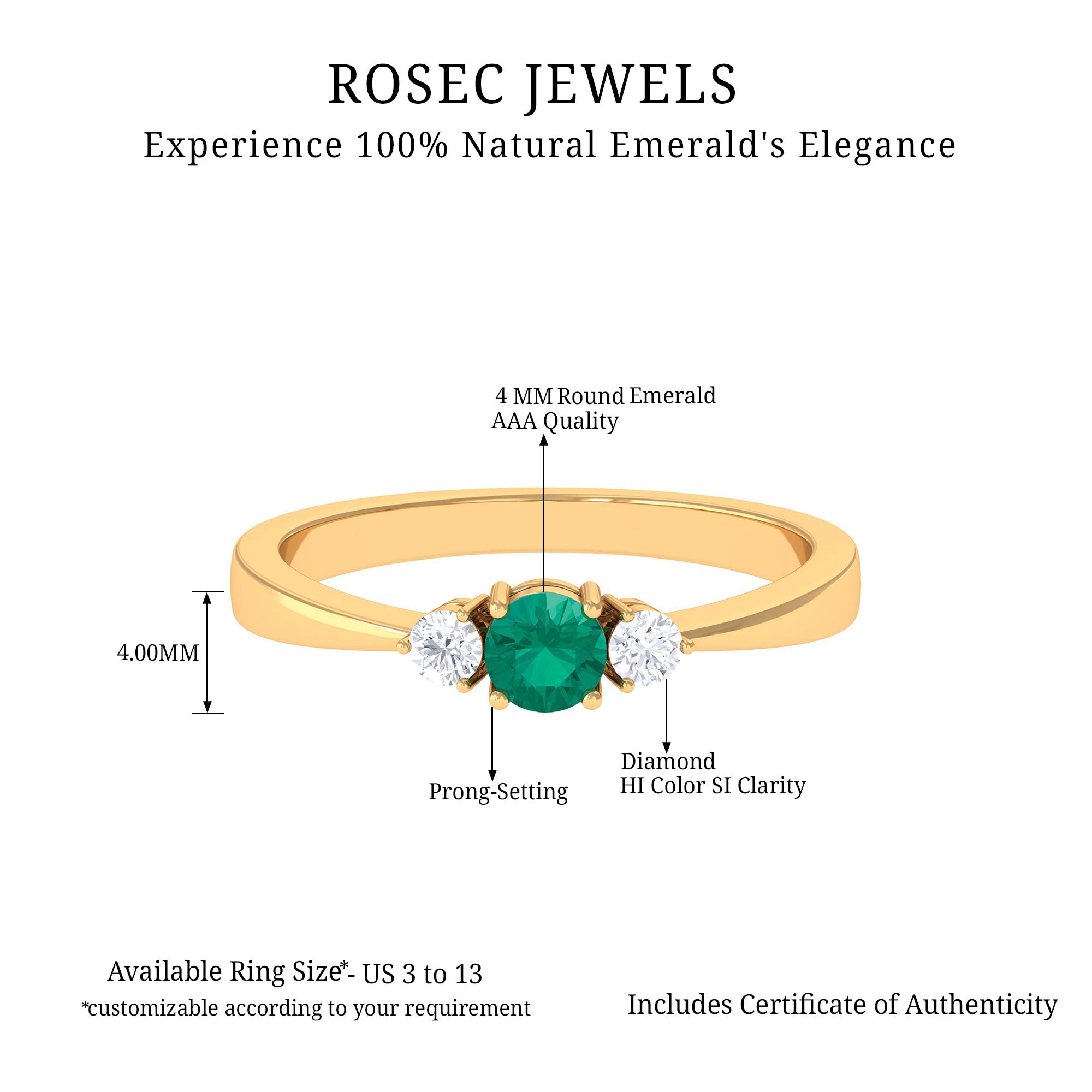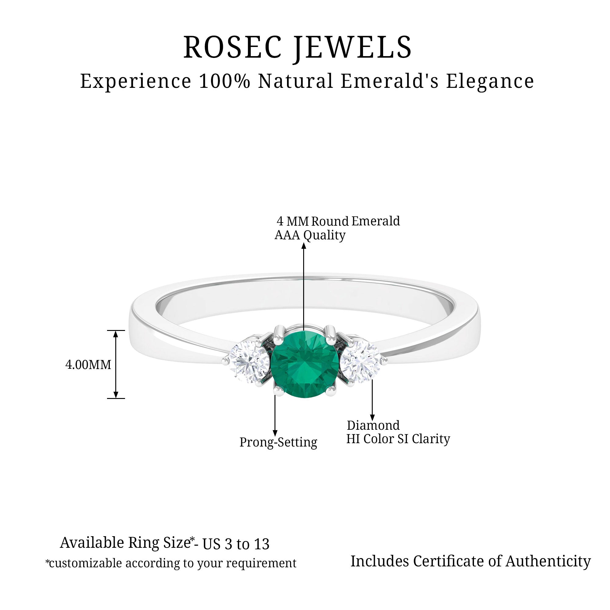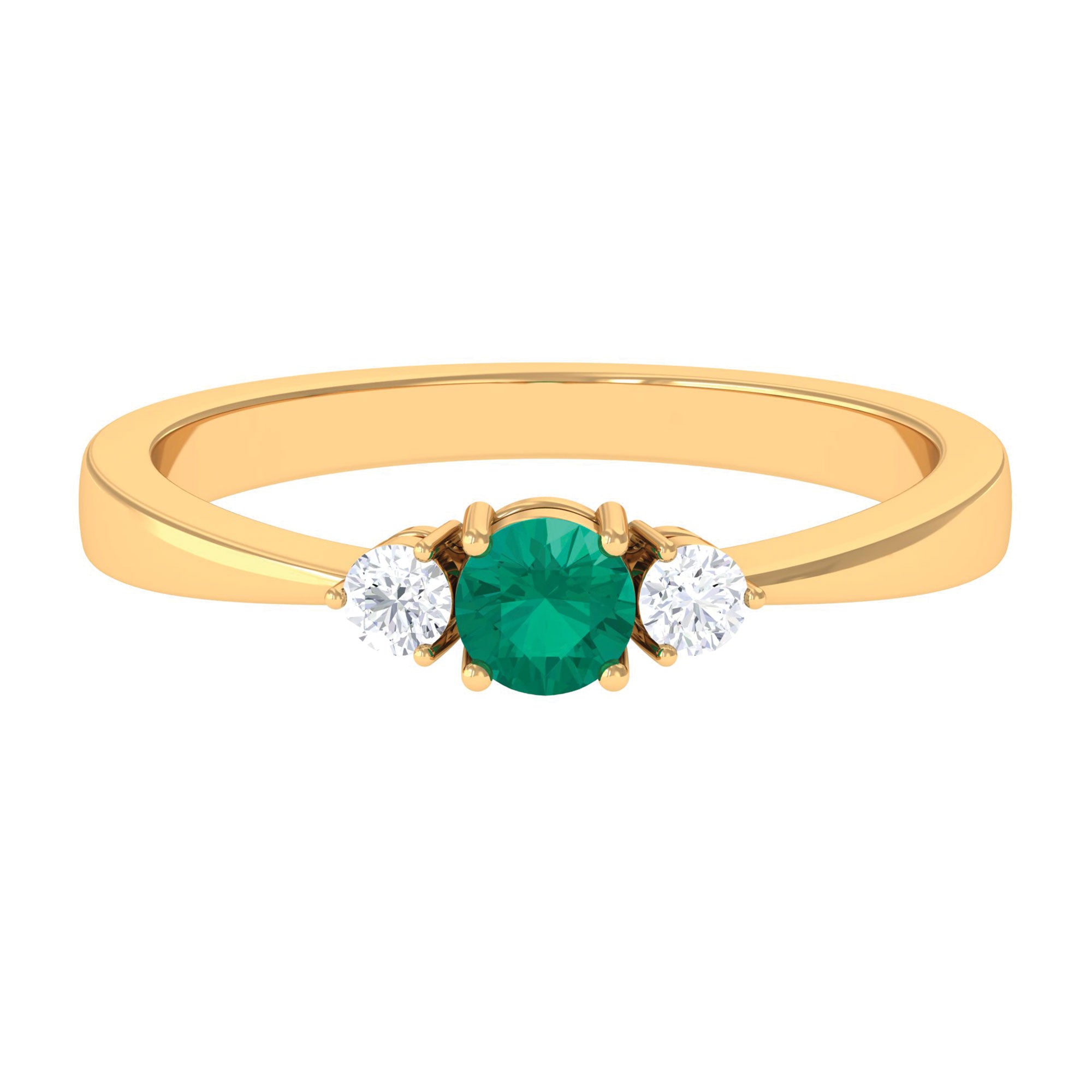 Timeless love finds its expression in this Emerald Promise Ring, created to symbolize new beginnings and a lasting connection. It is curated with a round shaped emerald of AAA quality, glowing with a rich green color. On each side of the center stone, round cut HI-SI quality diamonds add a soft sparkle, completing the classic three stone style that reflects the past, present, and future of your love story. Each gemstone has been carefully selected and certified for its quality, ensuring beauty and authenticity that can be cherished for a lifetime. The balanced arrangement of stones gives the Emerald and Diamond Ring a refined look, while the pinched shank adds a comfortable and elegant touch to the overall design. The vivid emerald paired with dazzling diamonds creates a meaningful piece that blends simplicity with sophistication. Designed to reflect love’s pure essence, this Emerald 3 Stone Ring feels both personal and timeless, carrying a quiet message of devotion and unity. Perfect for a promise, anniversary, or a milestone in your journey together, this Past Present and Future Ring is a beautiful reminder of trust and growth. Crafted with attention to detail, it offers both brilliance and comfort, making it a piece to wear proudly every day or treasure for special occasions.