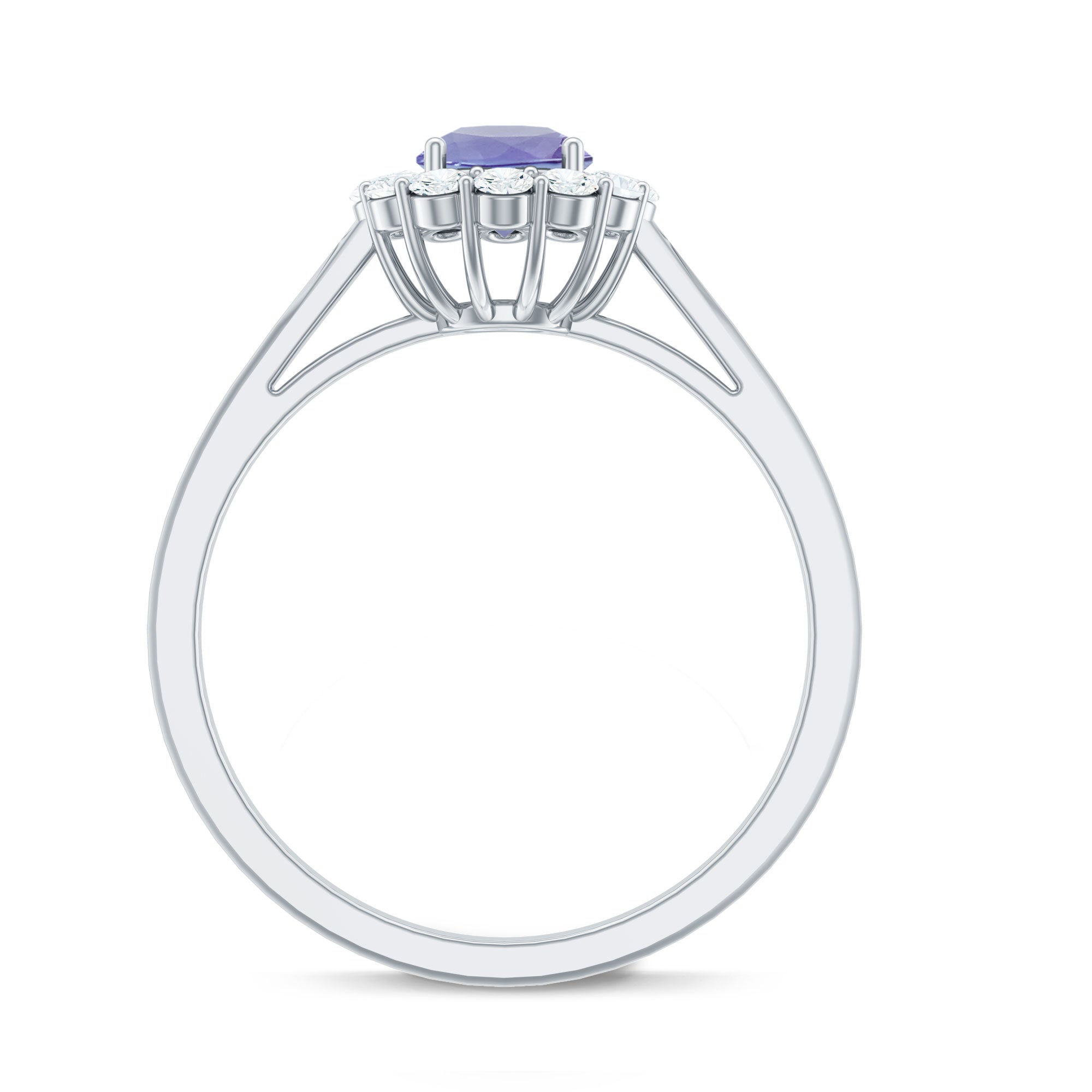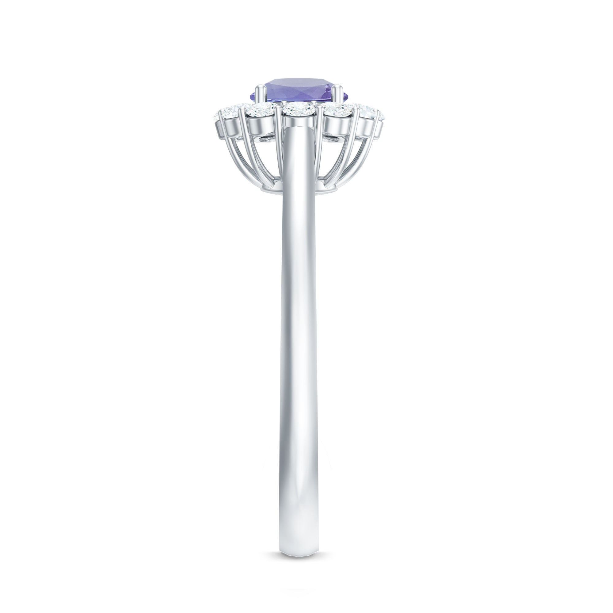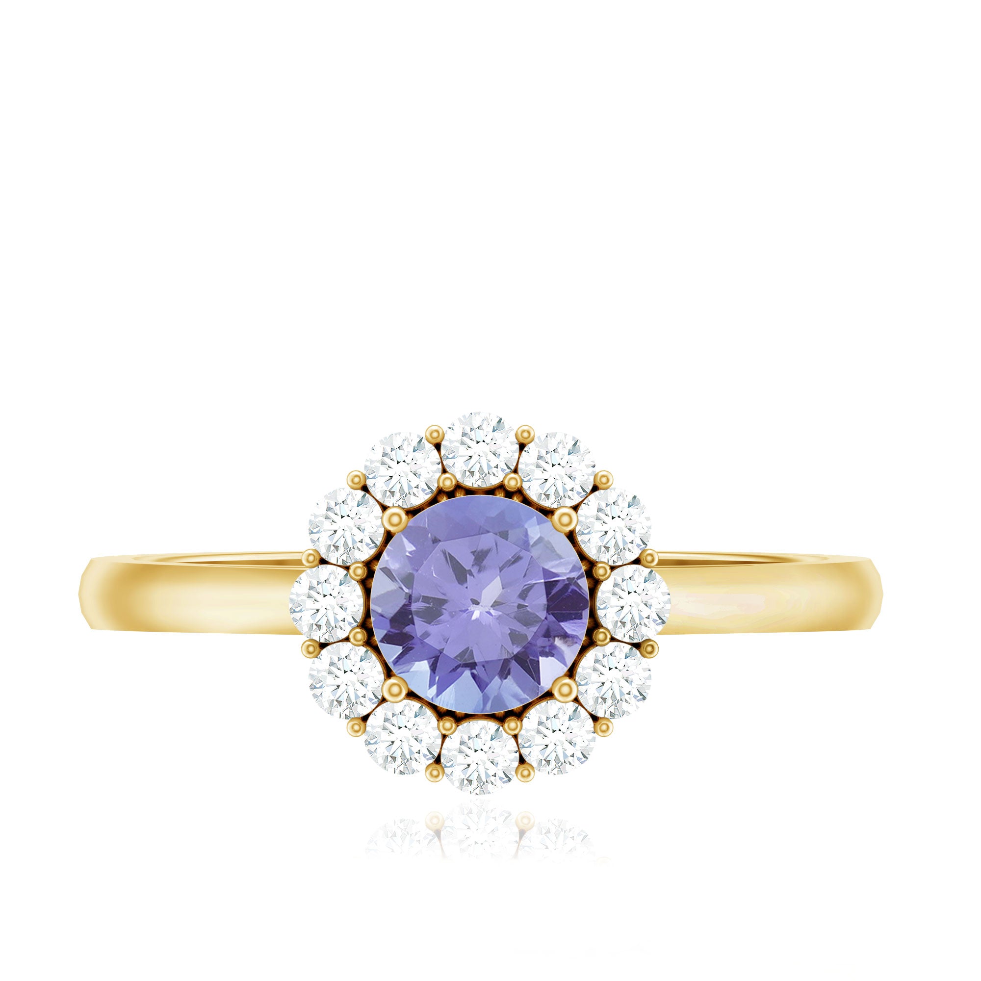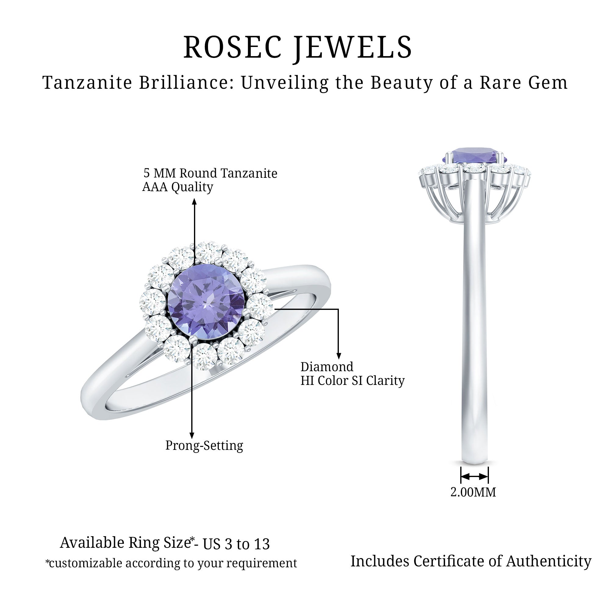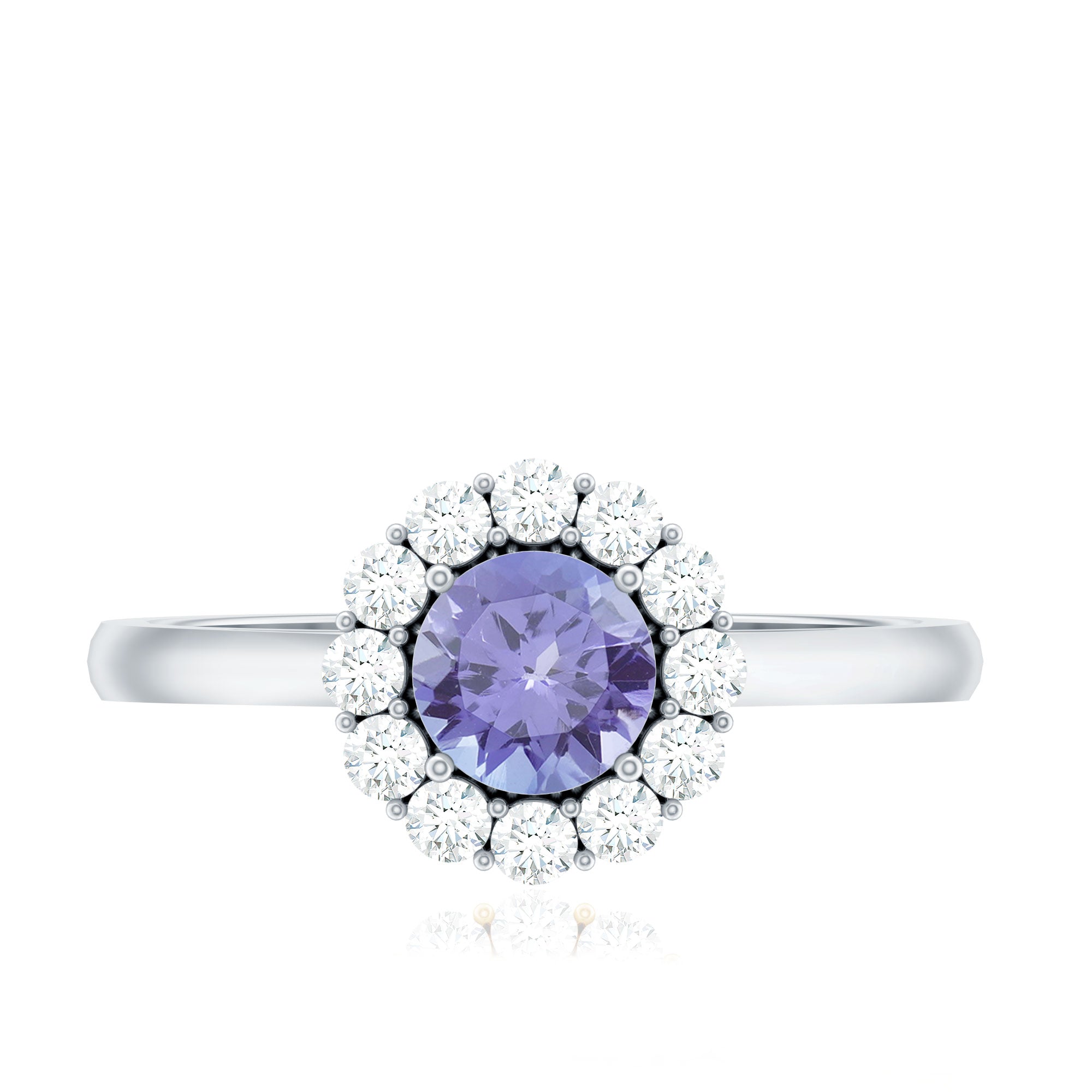 This Halo Ring will mesmerize everyone when you will walk around the town. Adorned with sparkling 5 MM Round Shape Tanzanite in the center while Round Shape Diamonds studded as Halo, enhance its beauty. This Tanzanite and Diamond Ring is crafted with Hallmarked Metal and makes a precious anniversary gift for your partner, something she would never like to keep away from herself.