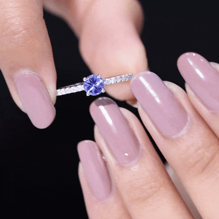 Celebrate lifes biggest moments with this luxurious Solitaire Ring, featuring a Round Shape Tanzanite stone in Prong Setting, accompanied by Surface Prong Set Diamond Side Stones. This exquisite ring is a beautiful and timeless piece of jewelry that is sure to be treasured for years to come.