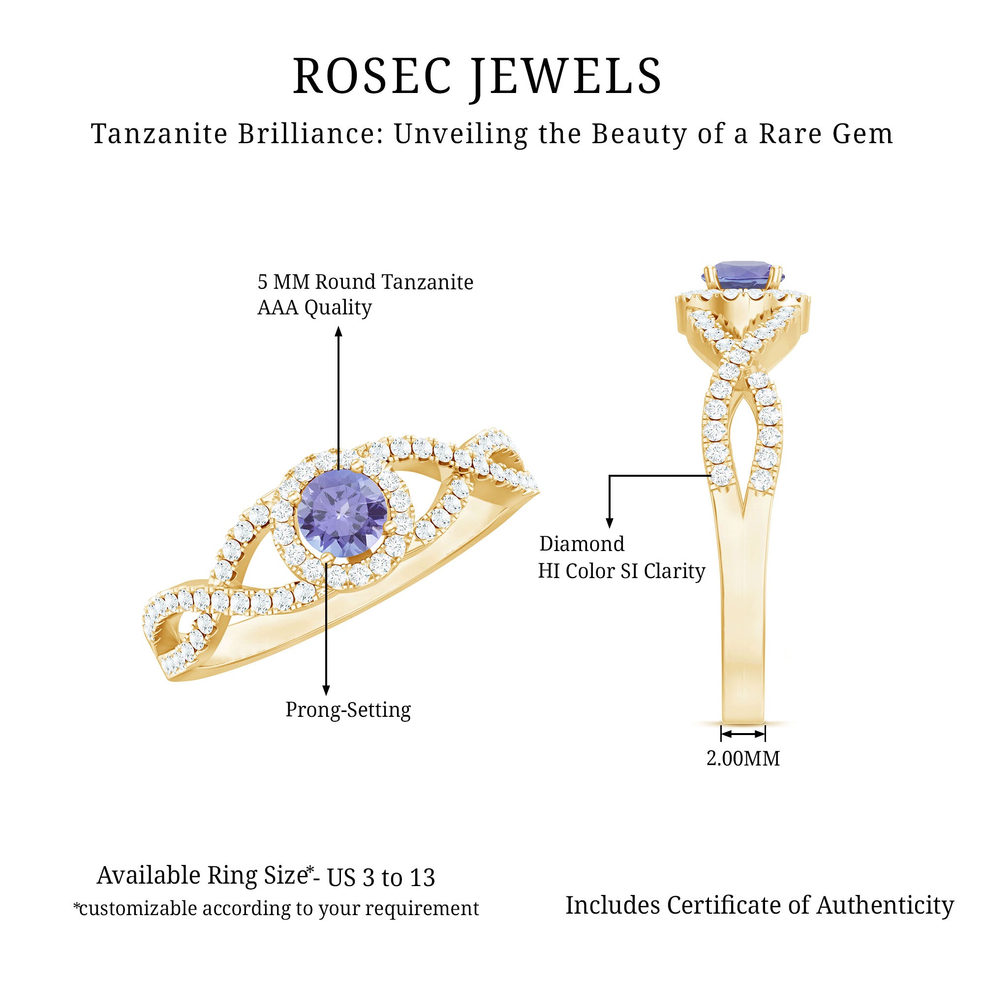 Round Tanzanite Crisscross Engagement Ring with Diamond Halo