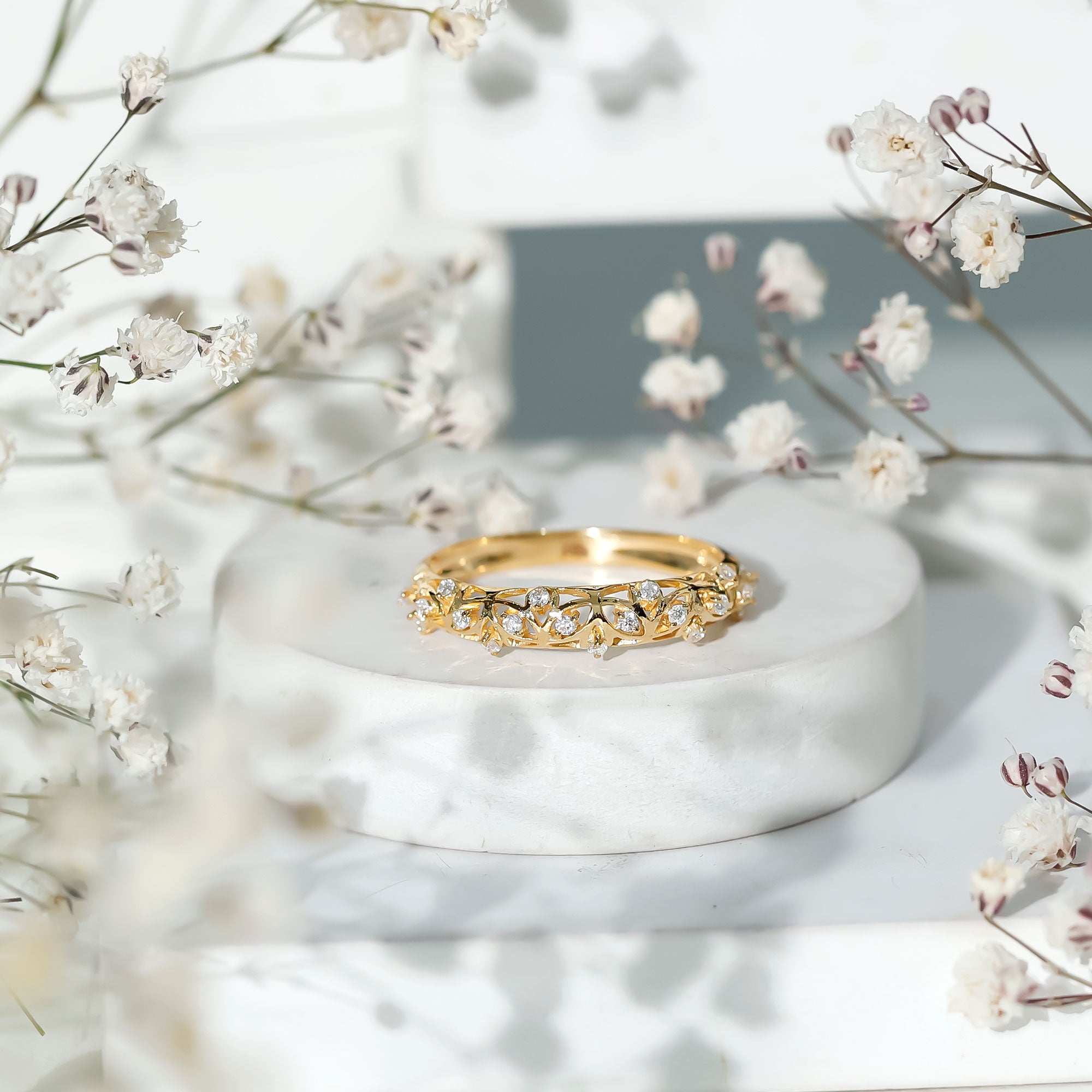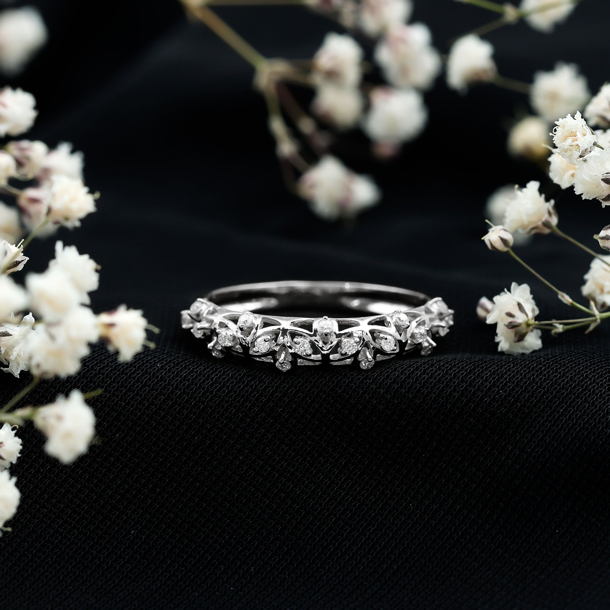Round Zircon Semi Eternity Band Ring with Gold Filigree Details