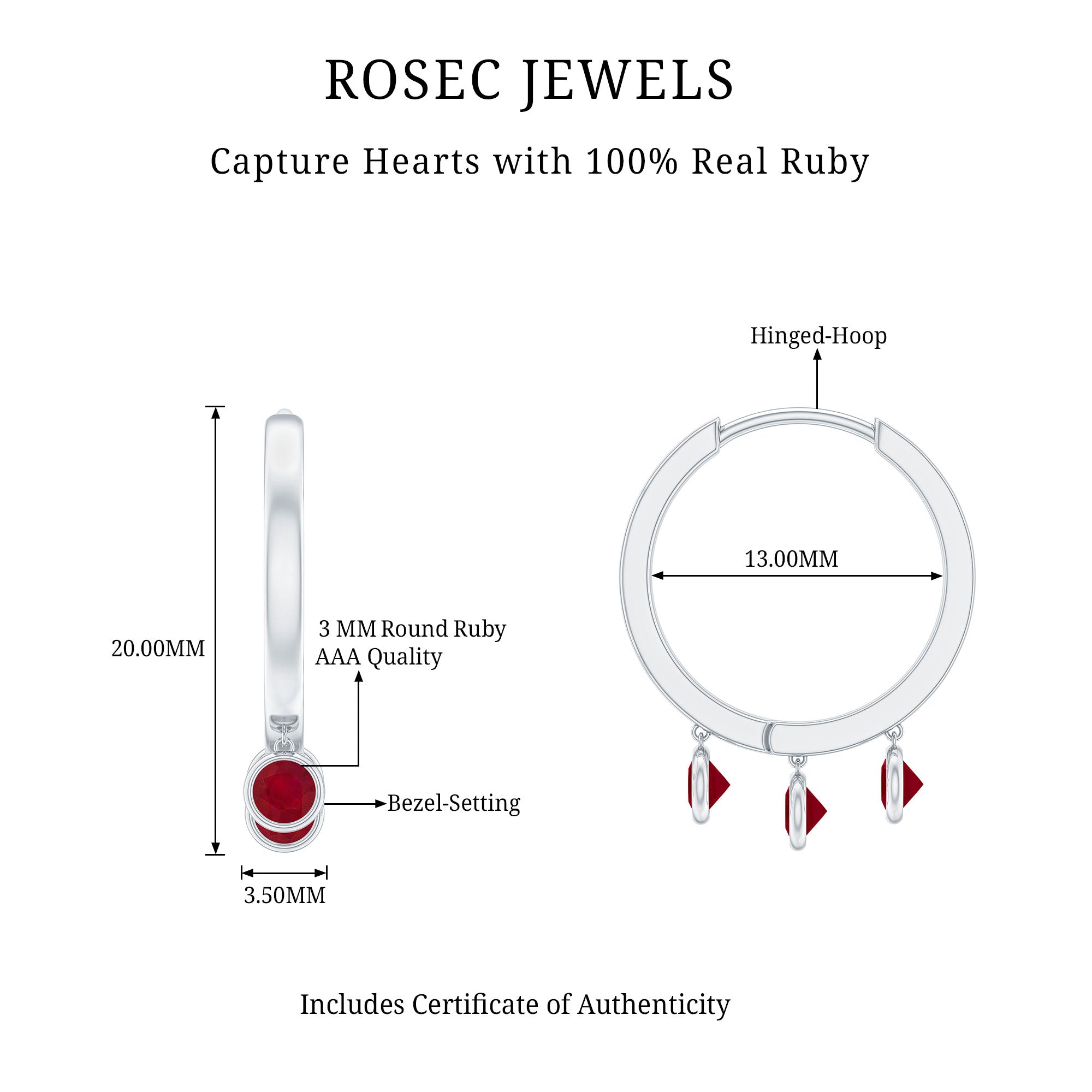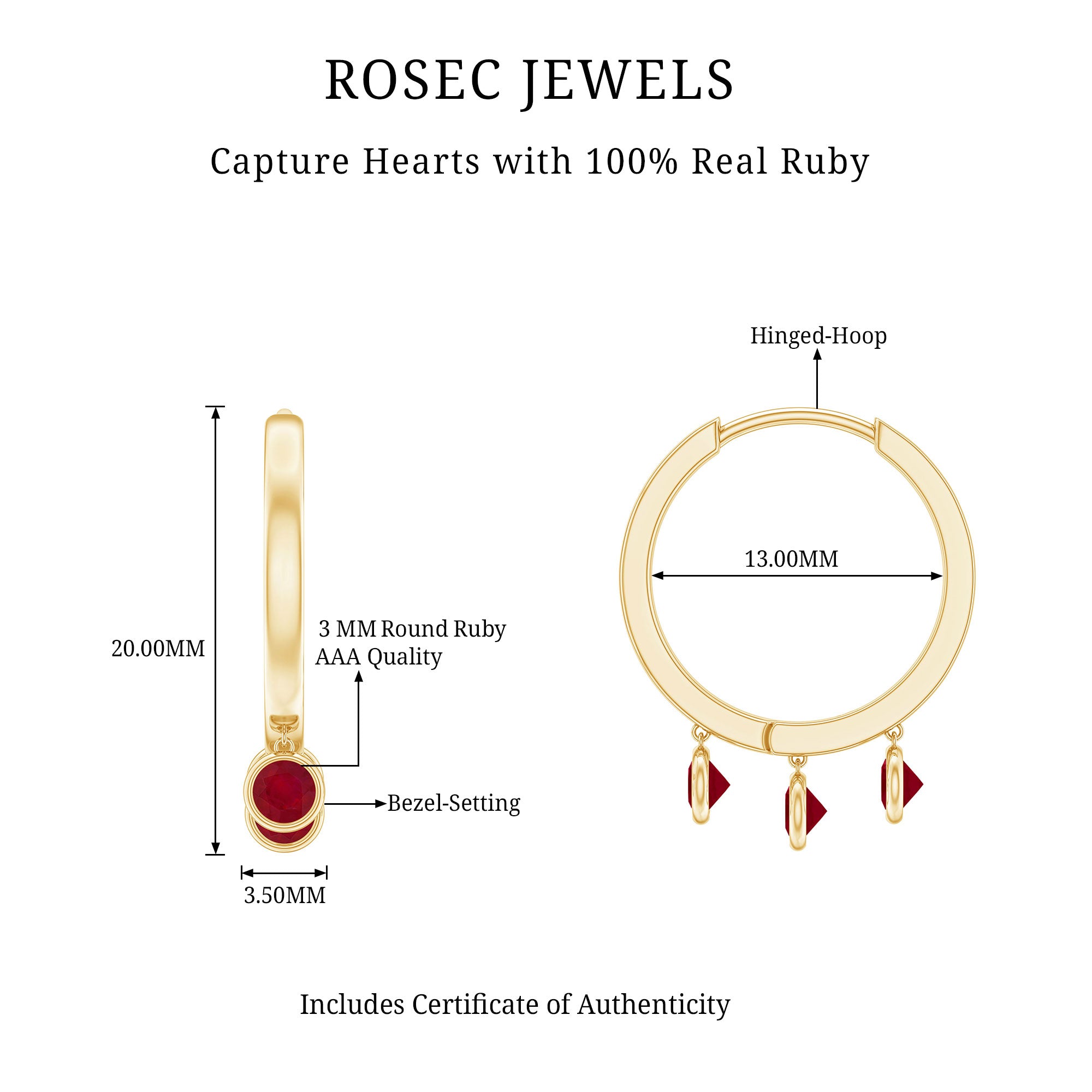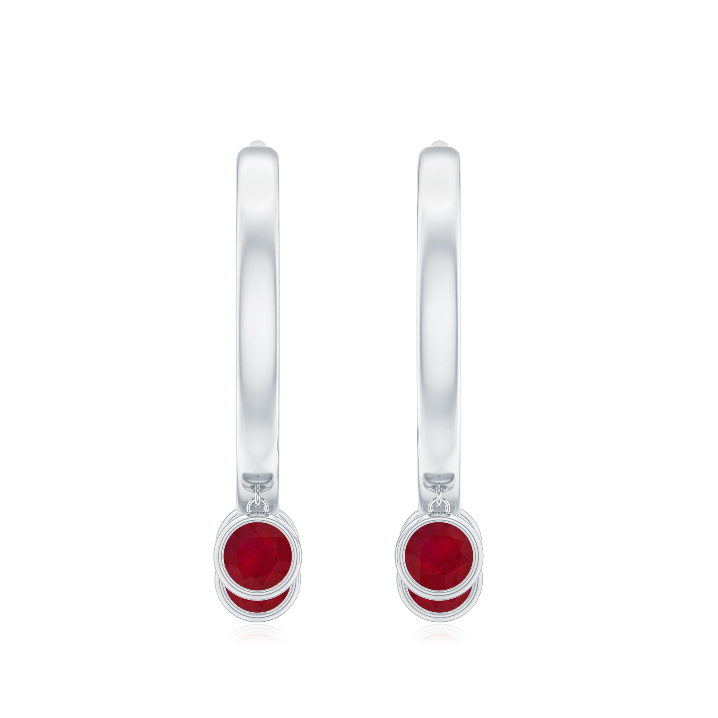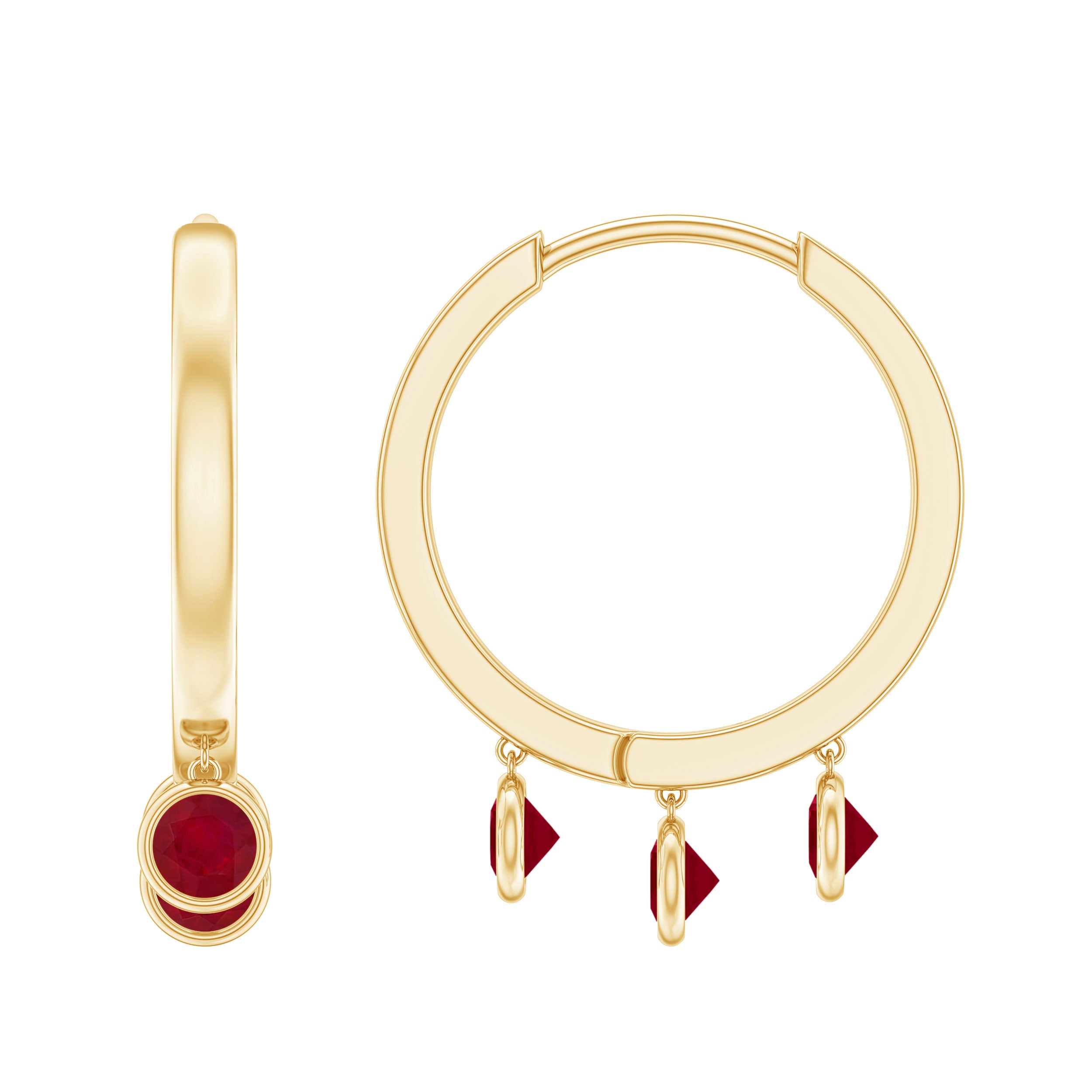 Our elegantly designed Hoop Earrings are modern and simple that you will never want to take off. These Hoop Drop Earrings are embellished with three Round Ruby secured by Bezel Setting, designed to sparkle forever. Whether you are going out or getting ready for an important event, carry these Ruby Earrings with your attire to add a charming touch to your looks. The Hoop Earrings make a beautiful birthday gift for your special person.