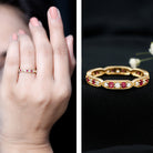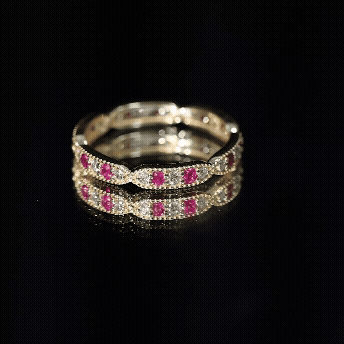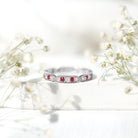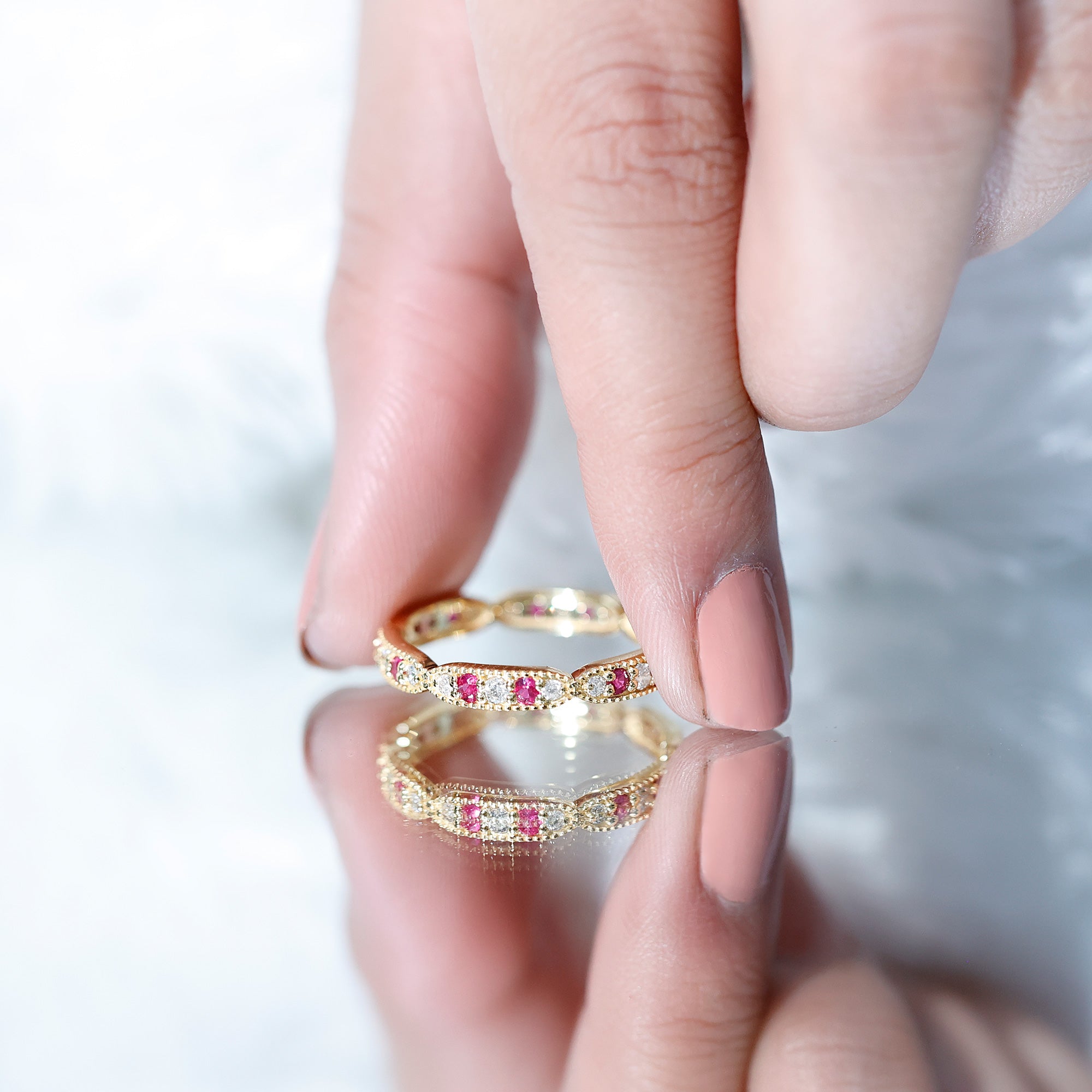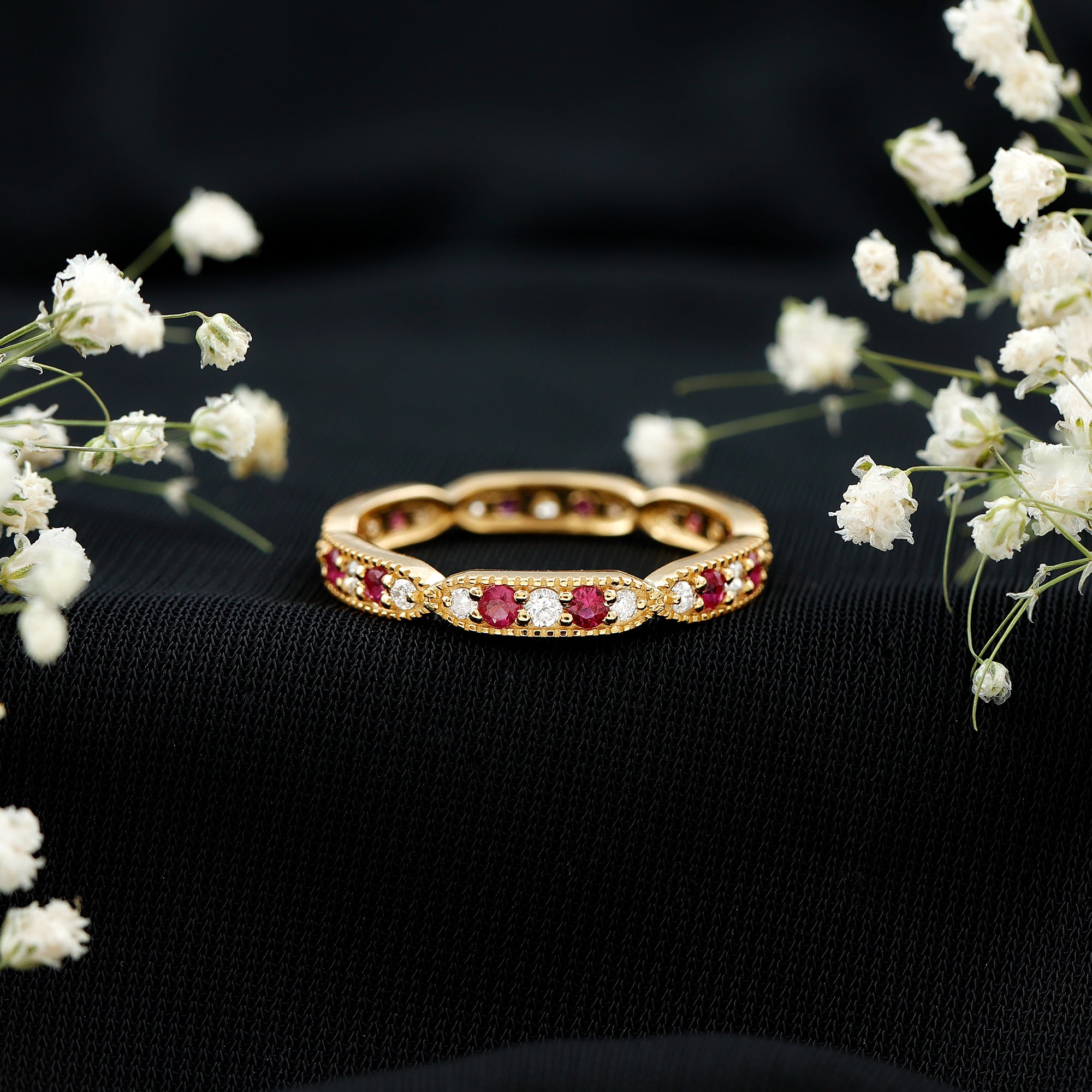 An Amazing and Classic Ruby Diamond Alternating Ring embellished with Round Shape Ruby and Sparkling Round Shape Diamond is set in the alternative pattern. The beaded design makes this ring more beautiful. A phenomenal ring is a perfect gift for your lovely lady.