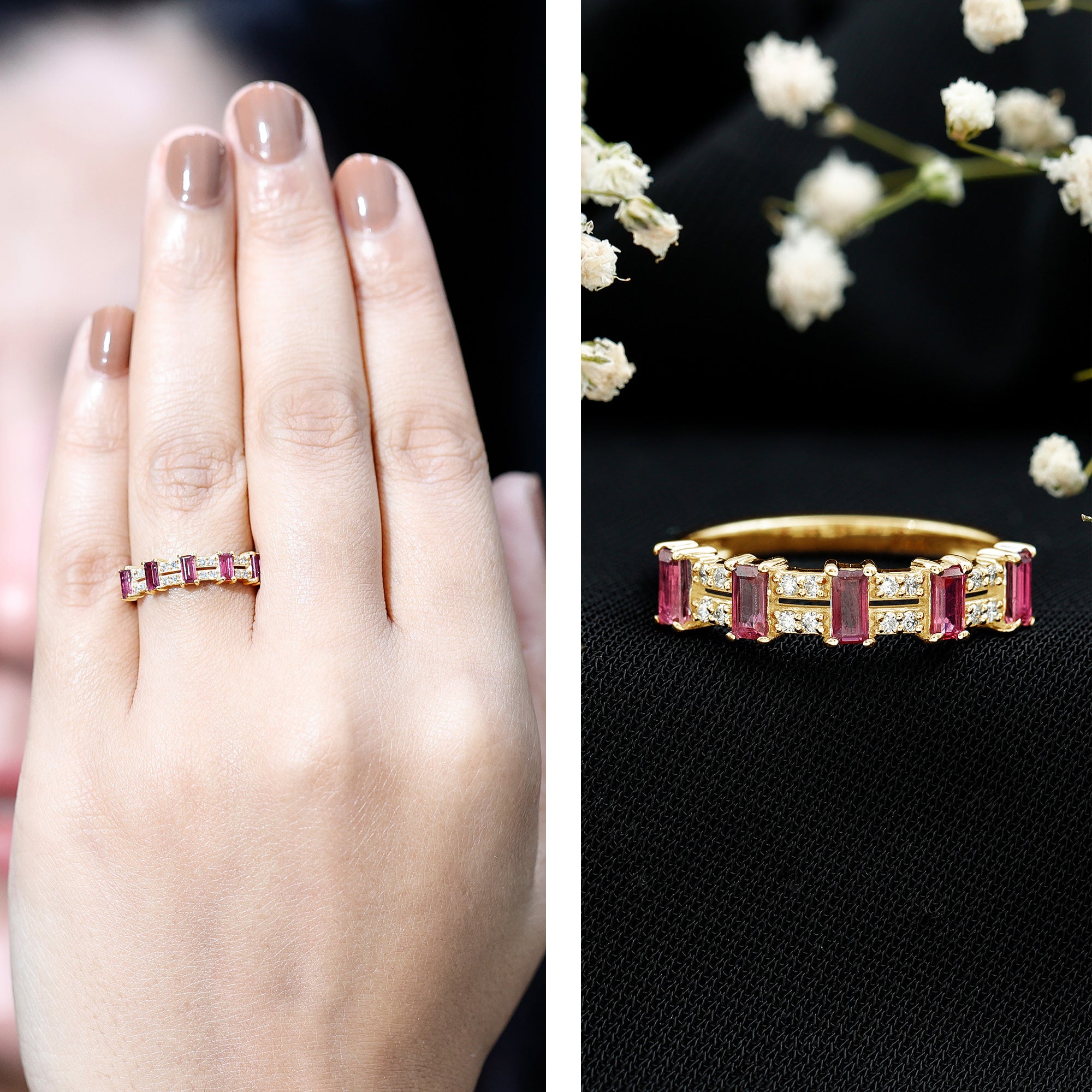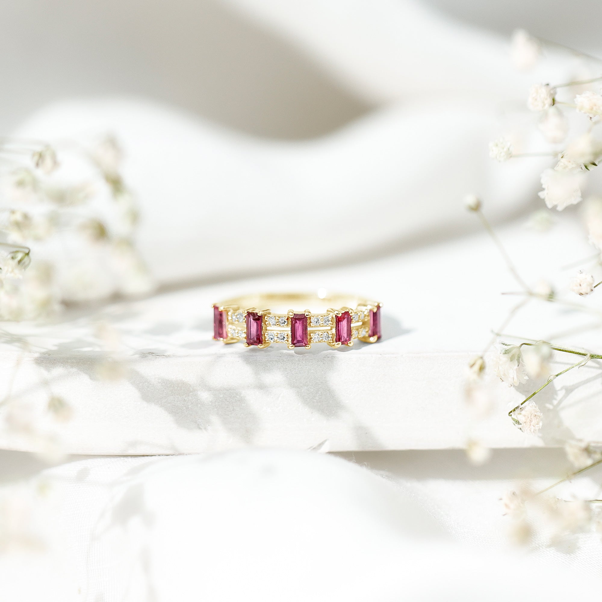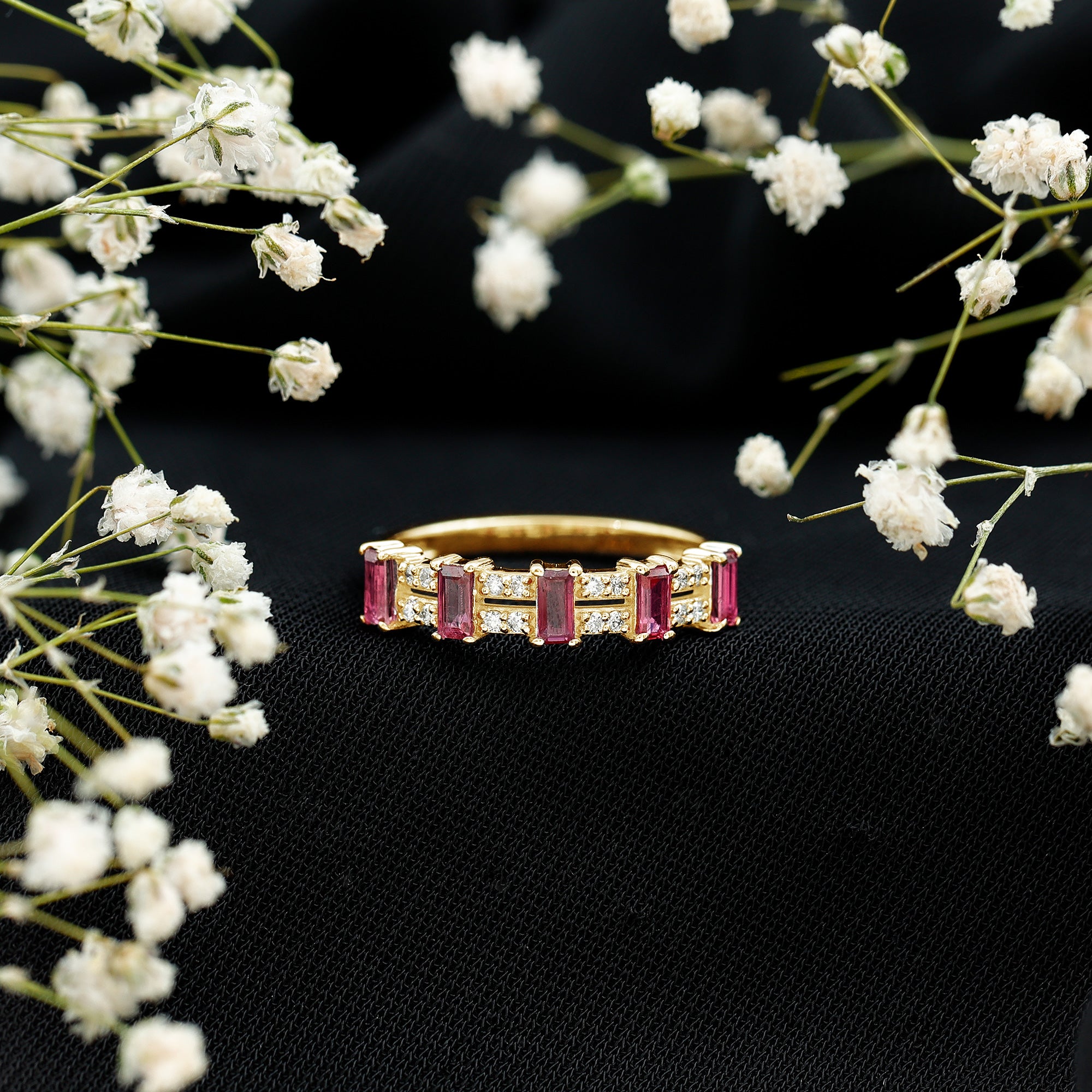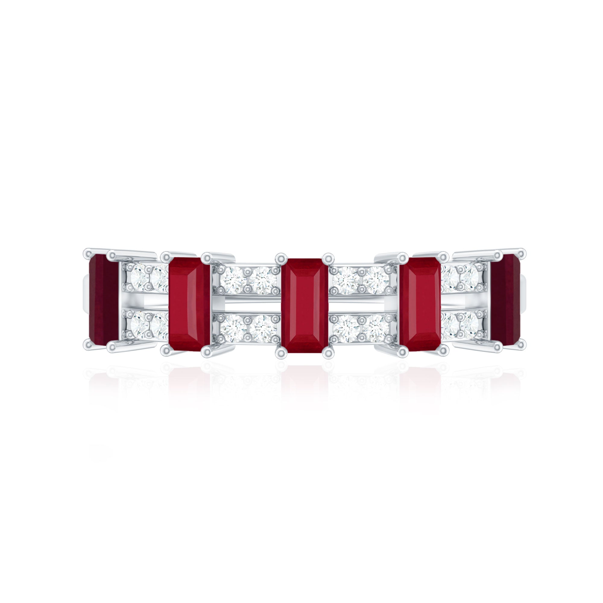 Make a bold statement with this Wide Half Eternity Band Ring featuring Ruby and shimmering Diamond, a stunning blend of elegance and glamour.
