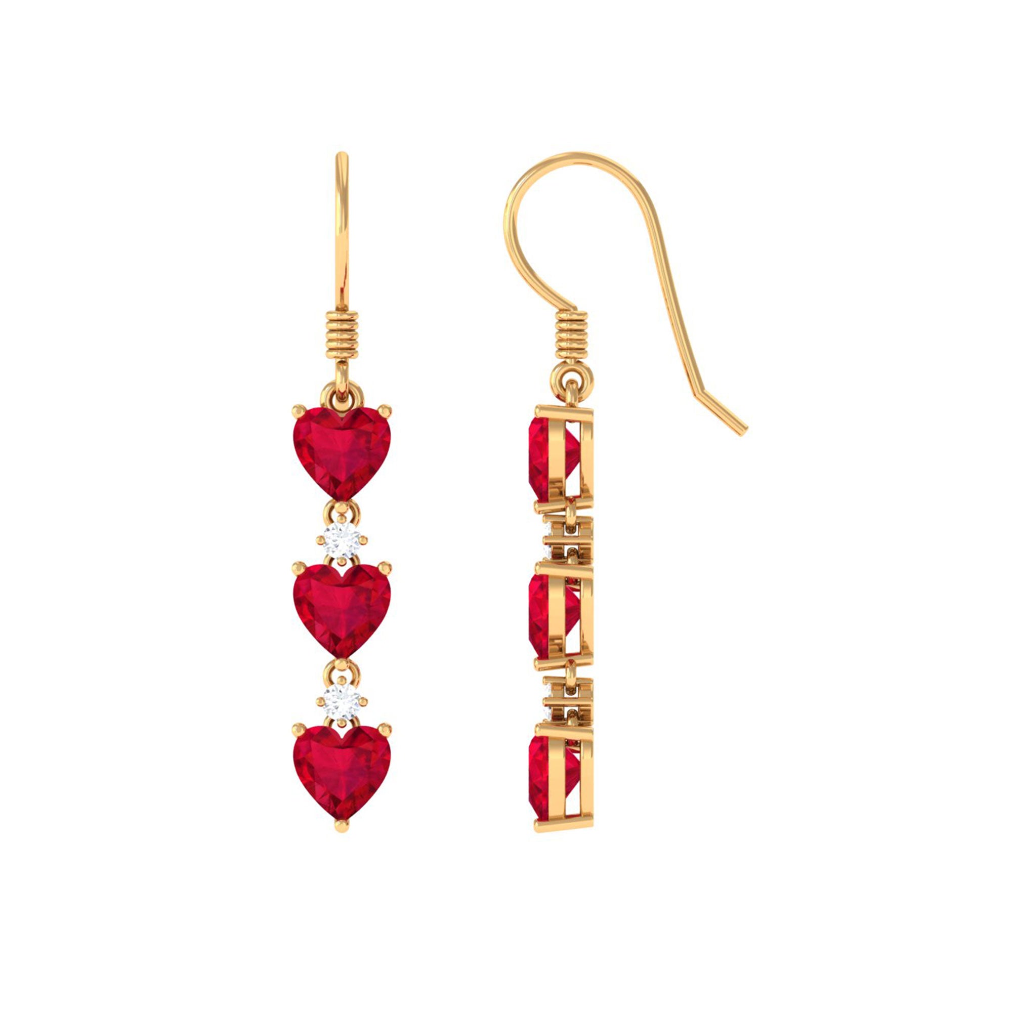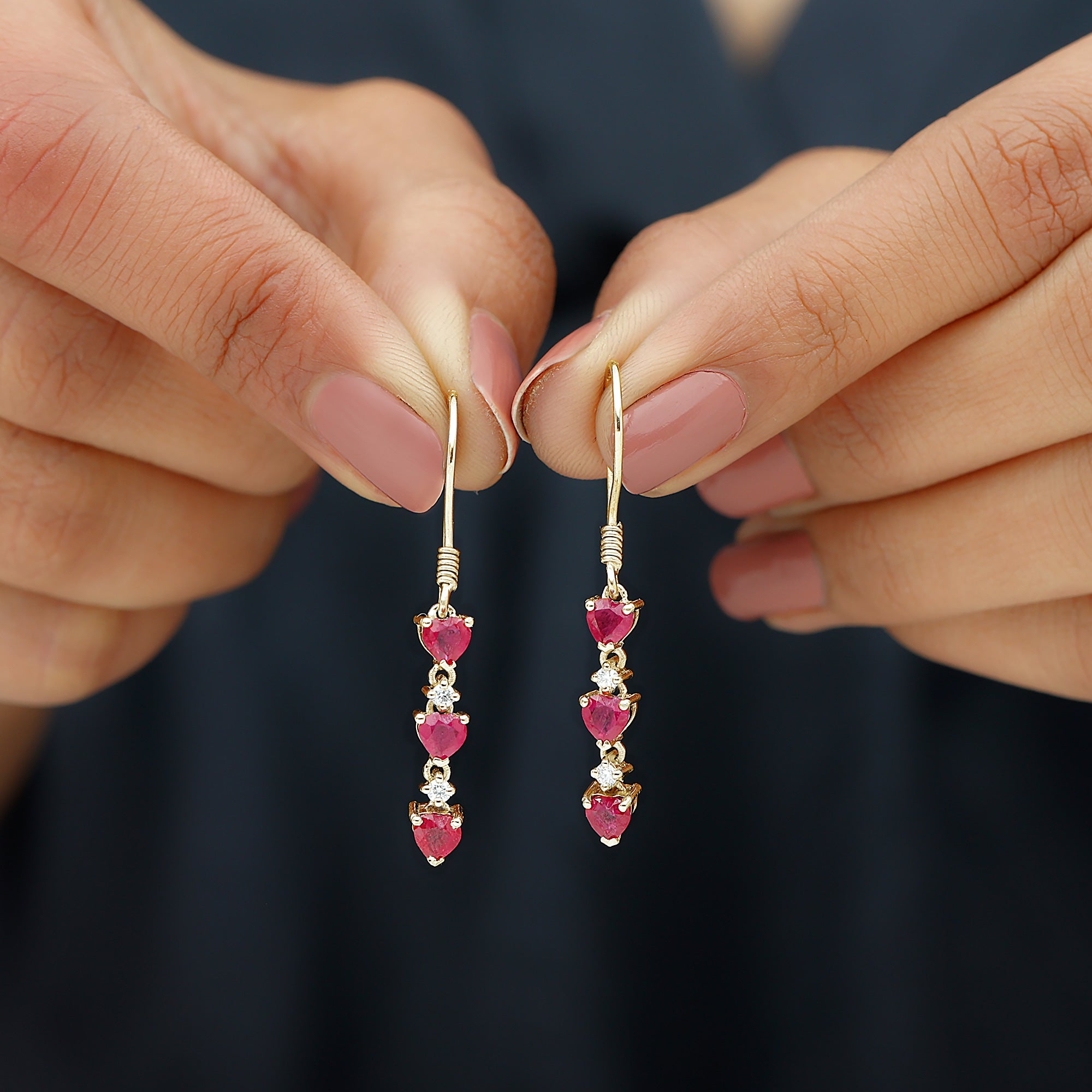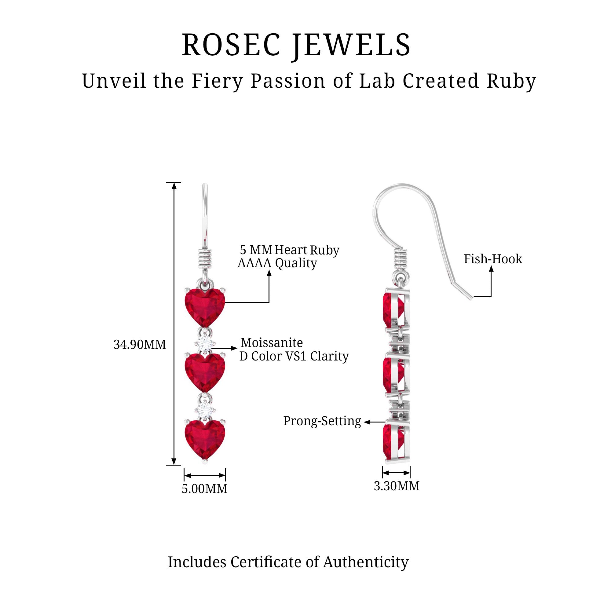 Fall in love with these Heart Dangle Earrings, symbolizing enduring love and devotion. These Fine Earrings showcase three 5 MM Heart Shape Lab Created Ruby gemstones held in Prong Setting, complemented by gleaming Moissanite gemstones. Hanging delicately from a Fish Hook, they capture the essence of romance and elegance.