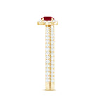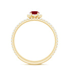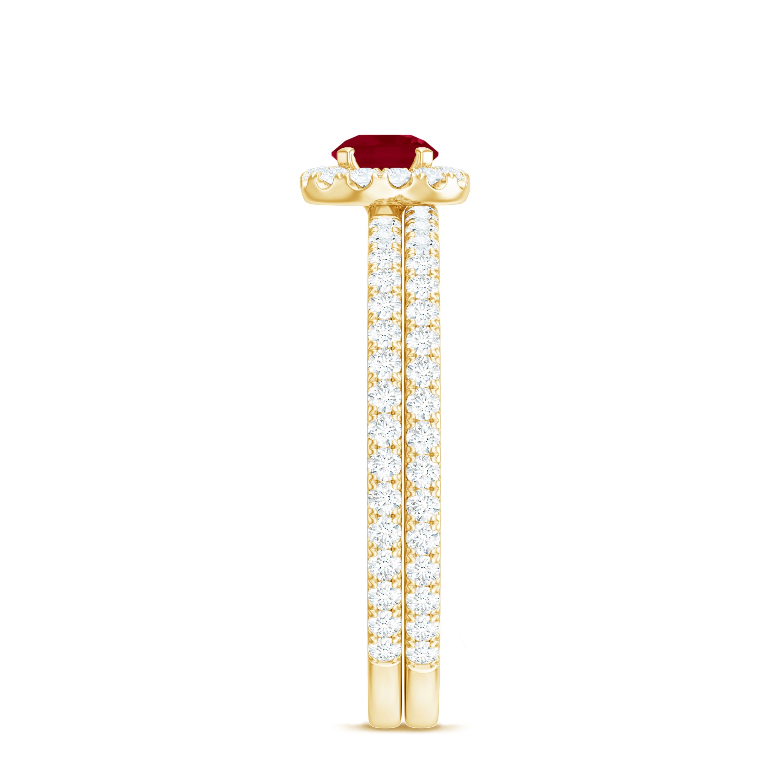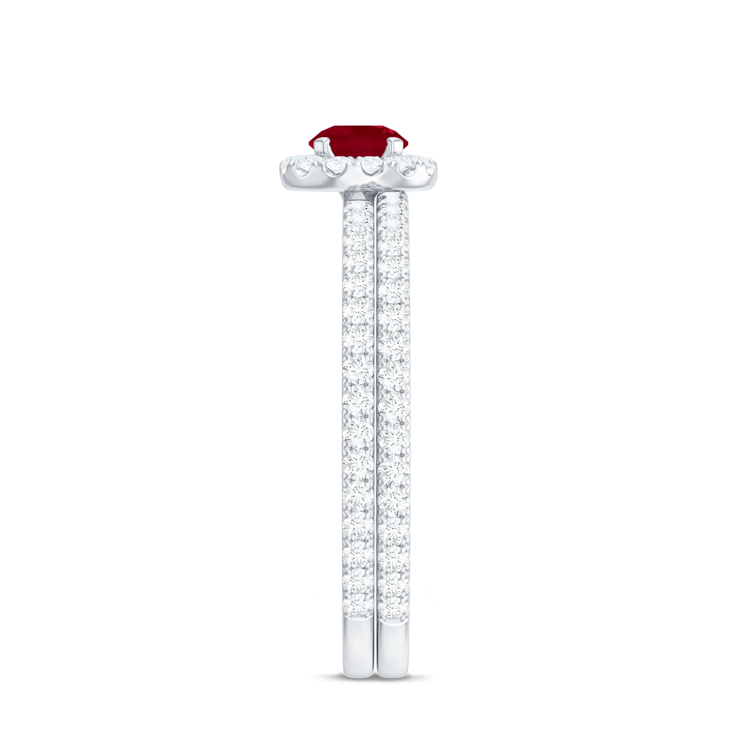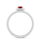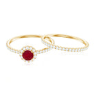 Enhance your style with this versatile stackable Ruby Ring Set, designed to be worn together or separately for a stunning look. The set features a Minimal Ring Set crafted with exquisite attention to detail. One ring showcases a Round Shape Ruby in a prong setting, surrounded by a halo of sparkling Diamond stones and complemented by side stones. The other ring features a half-band design adorned with round Diamond stones. These captivating rings, with their intricate craftsmanship, will add a touch of elegance and sophistication to any outfit. Create your own unique combination and let this Ruby Ring Set be the perfect accessory to express your personal style.