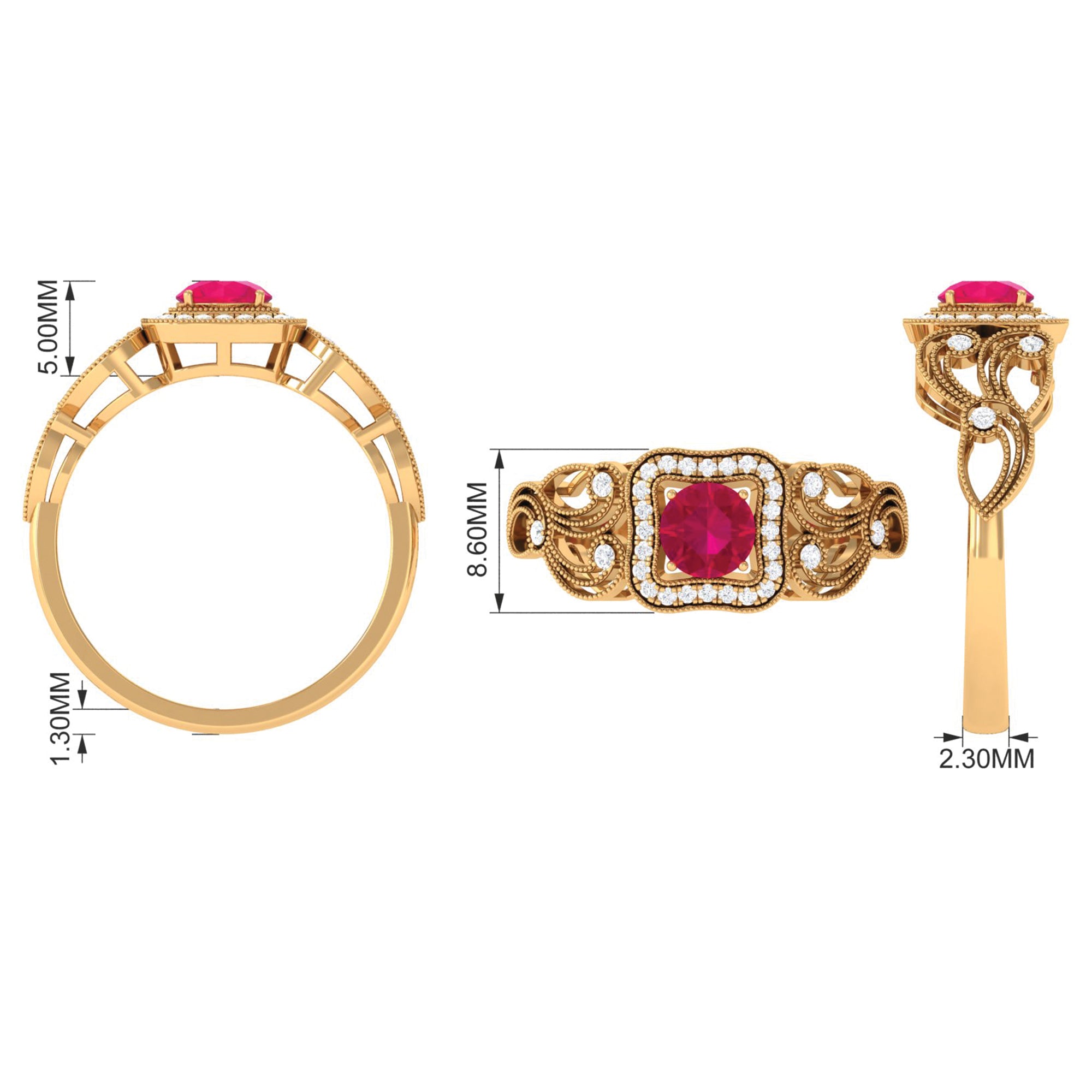 Accentuate your look with this Vintage Ruby Engagement Ring and grab all the attention at the party. The Round Ruby is held in prong setting beautifully exhibiting an effortless charm and the round diamond arranged as accent. The Milgrain details are augmenting an opulent appeal of this Ruby and Diamond Ring.