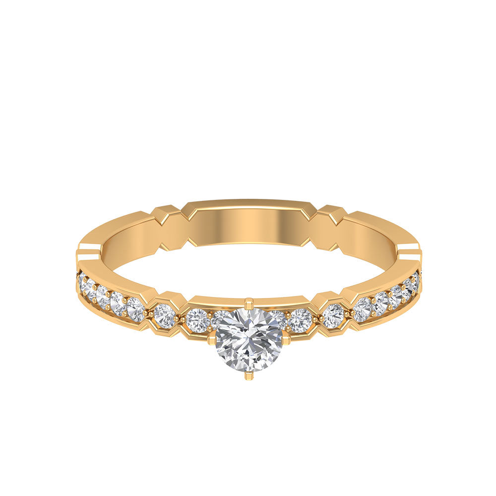 Modern and Classic Diamond Solitaire Engagement Ring is embellished with the Round Shape Solitaire Diamond as a centerpiece and small Round Shape Diamonds engraved in 4 Prong Diagonal Peg Head Setting. Antique Women Statement Ring is composed of 14K Gold. An ideal accessory for women.