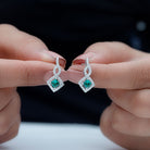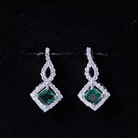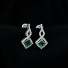 • The Drop Earrings feature a 4 MM princess cut lab-created emerald set in prongs, surrounded by round cut moissanite stones, plus a unique design at the top embellished with small moissanite stones.