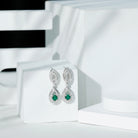 These Lab Grown Emerald Earrings feature a stunning dangle drop design. Crafted from gold plated silver, they symbolize love and enduring connections, making them a remarkable piece of jewelry for someone special in your life. The earrings showcase beautiful 6 MM round lab-created emeralds held securely by prongs, surrounded by a double teardrop frame adorned with small round brilliant cut Moissanite. An exclusive open marquise shaped frame is embellished with moissanite stones at the top, linking the Emerald Wedding Earrings with a screw back closure. These Bridal Earrings are a classic and eye-catching accessory, radiating elegance with their incredible brilliance and vibrant color that sparkles with light. Just like a true and everlasting love, they are carefully crafted to embody a sophisticated style that captures the essence of romance. These Teardrop Drop Earrings add movement, enhancing the sparkle that draws attention and instantly elevates your look with sophistication.