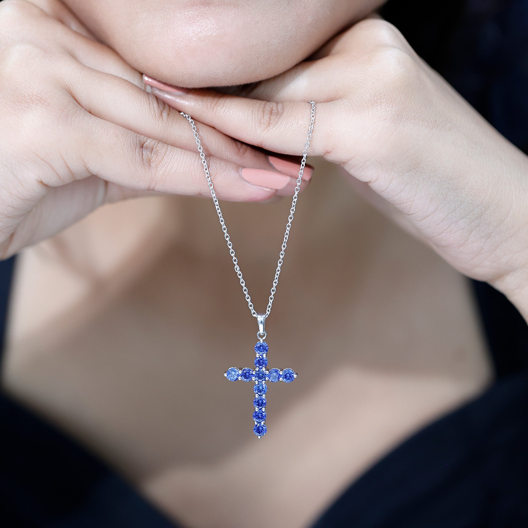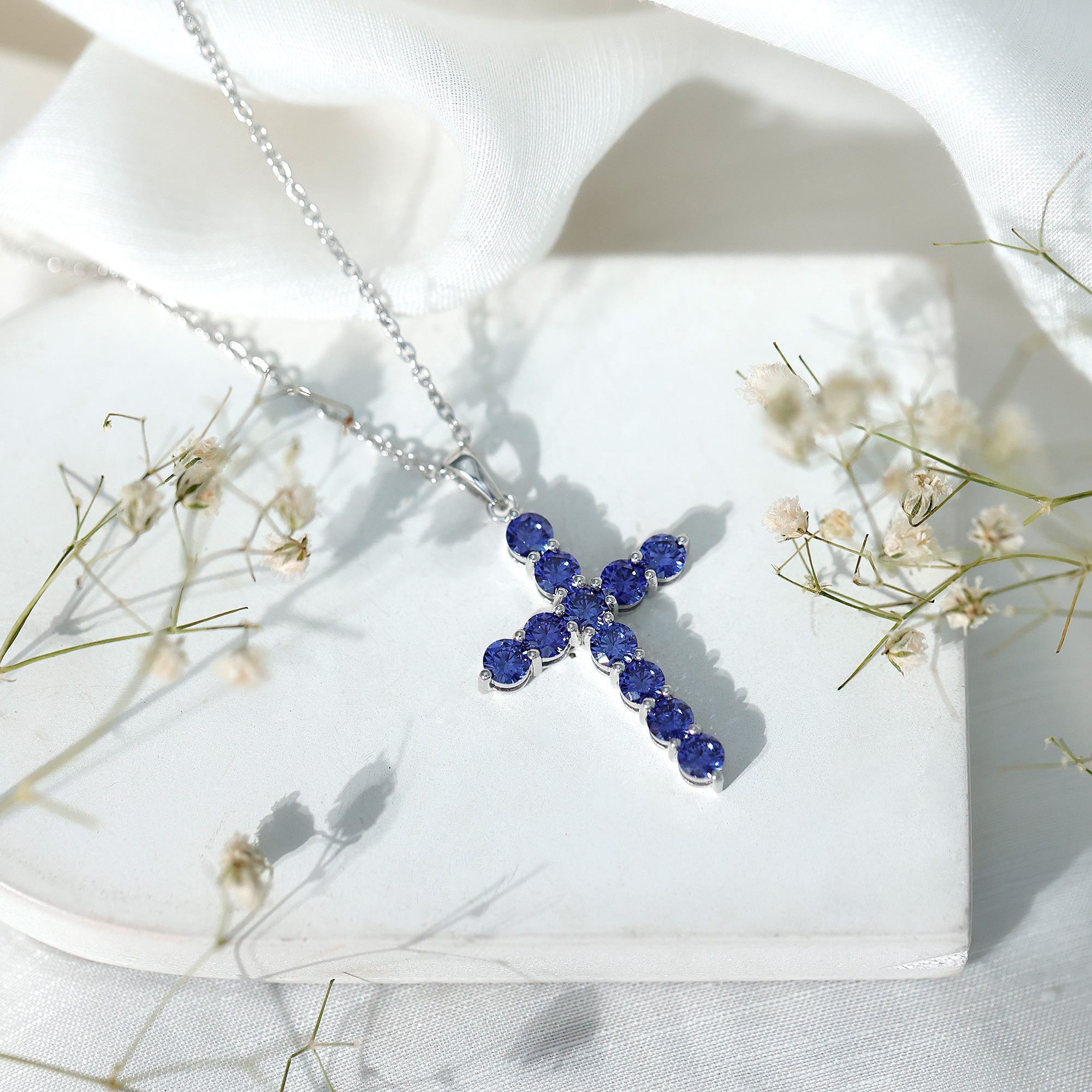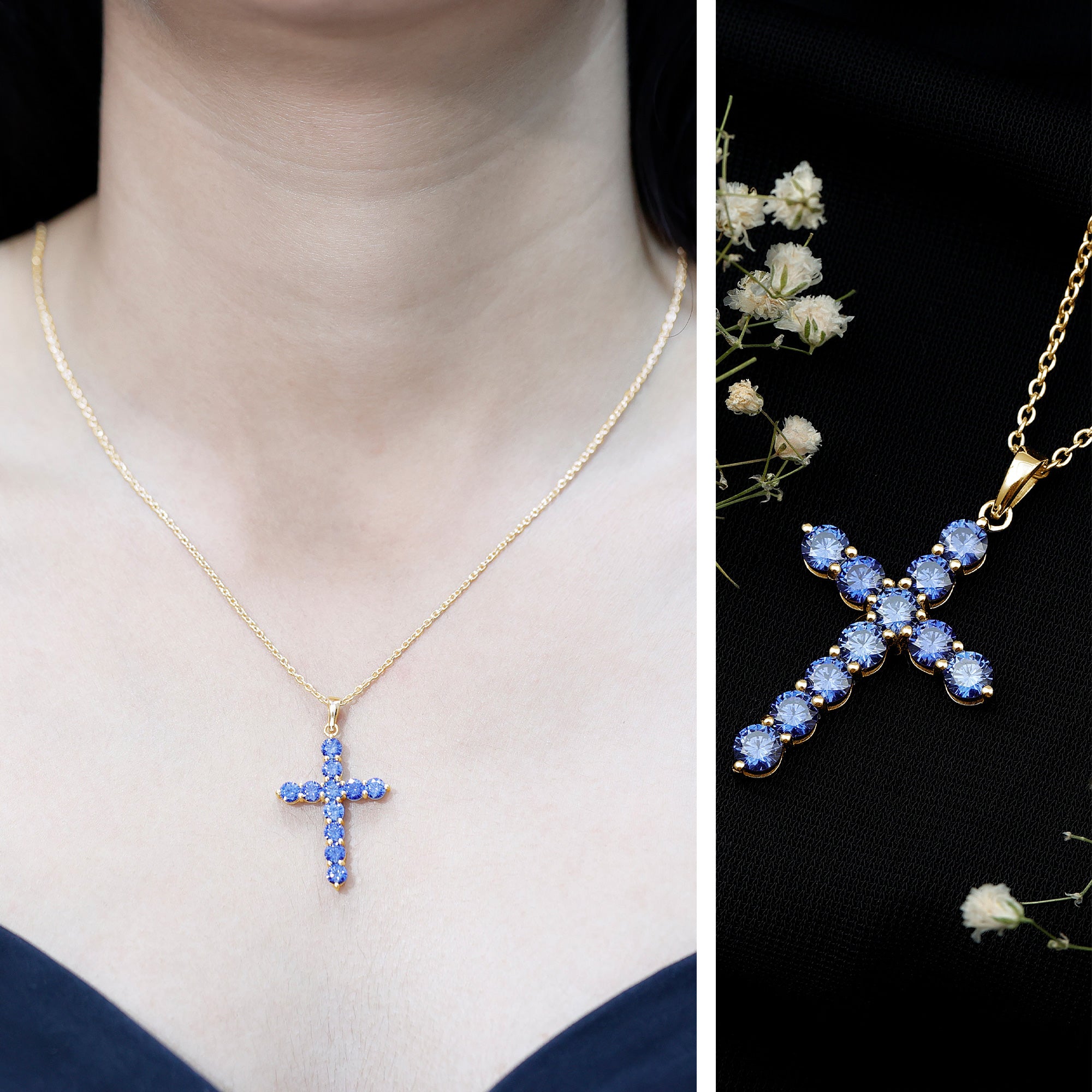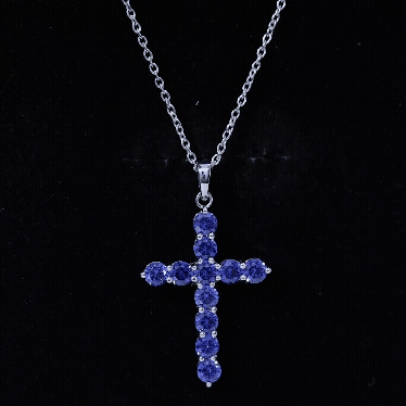 Embrace the beauty of faith and elegance with this breathtaking cross pendant necklace. Crafted with meticulous attention to detail, it highlights a created blue sapphire gemstone radiating a captivating blue hue. The gemstone is lovingly nestled within a cross-shaped frame, symbolizing timeless devotion. Whether worn as a religious symbol or as a cherished piece of jewelry, this necklace effortlessly combines spirituality and style. Enhancing any ensemble with its subtle yet striking presence is a testament to both faith and fashion.