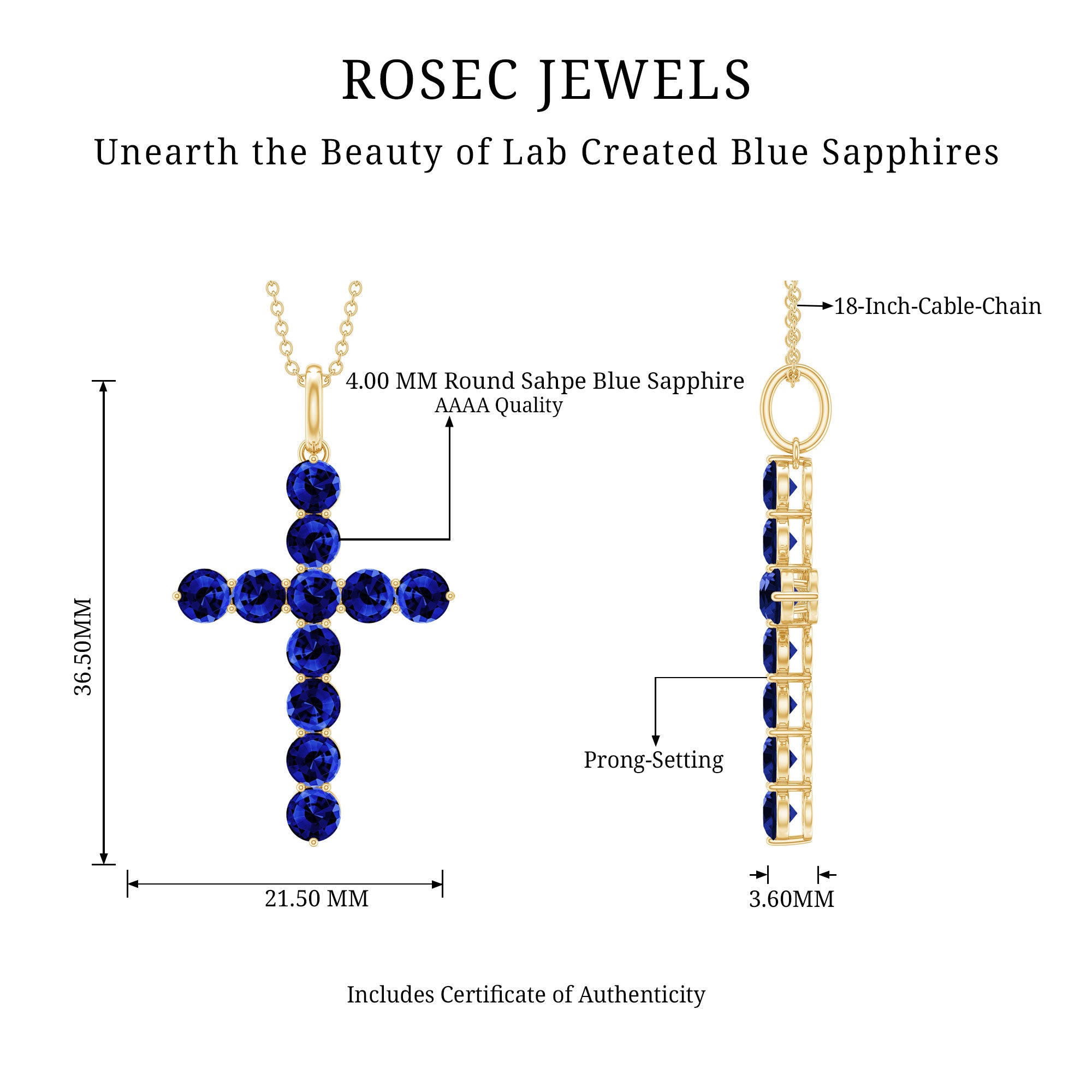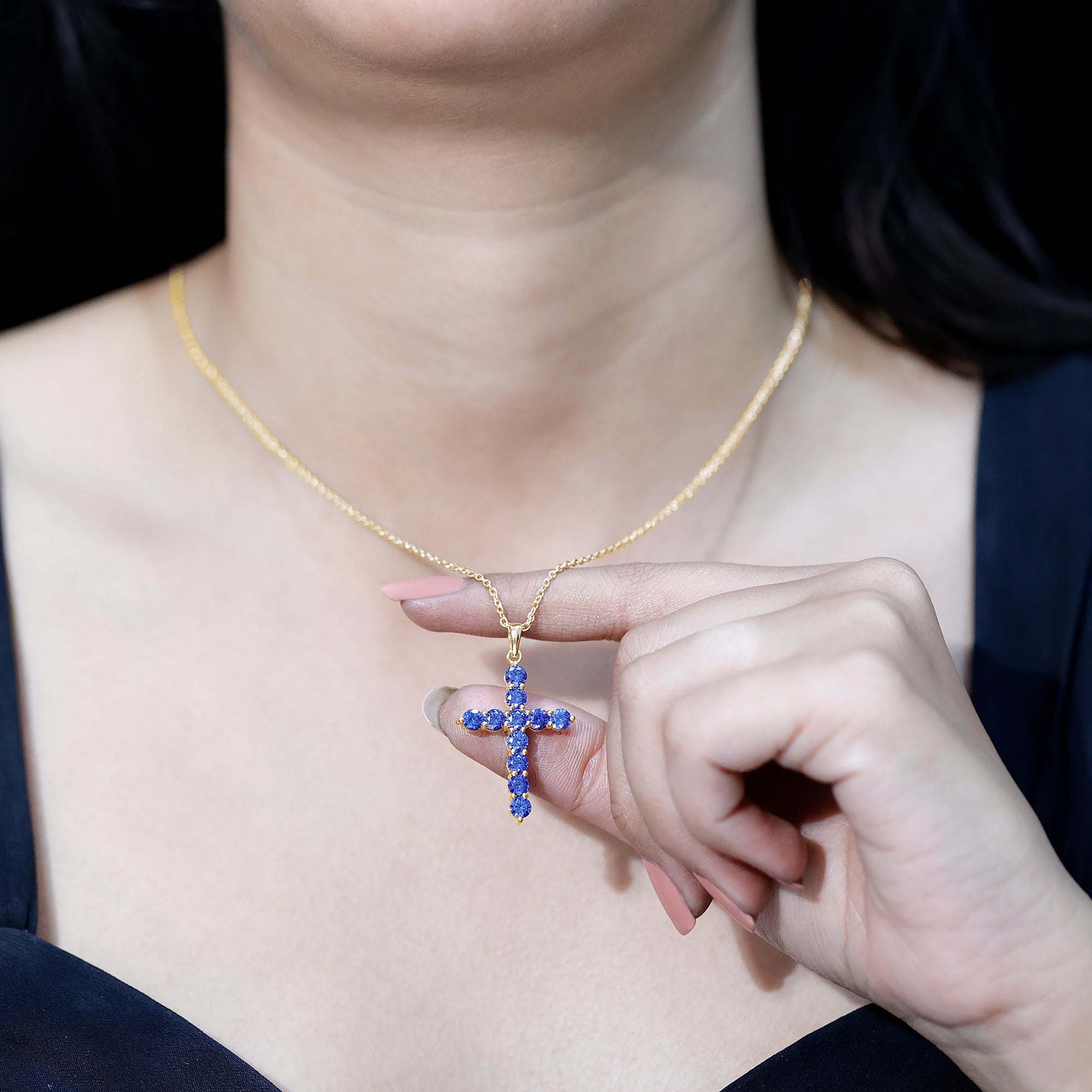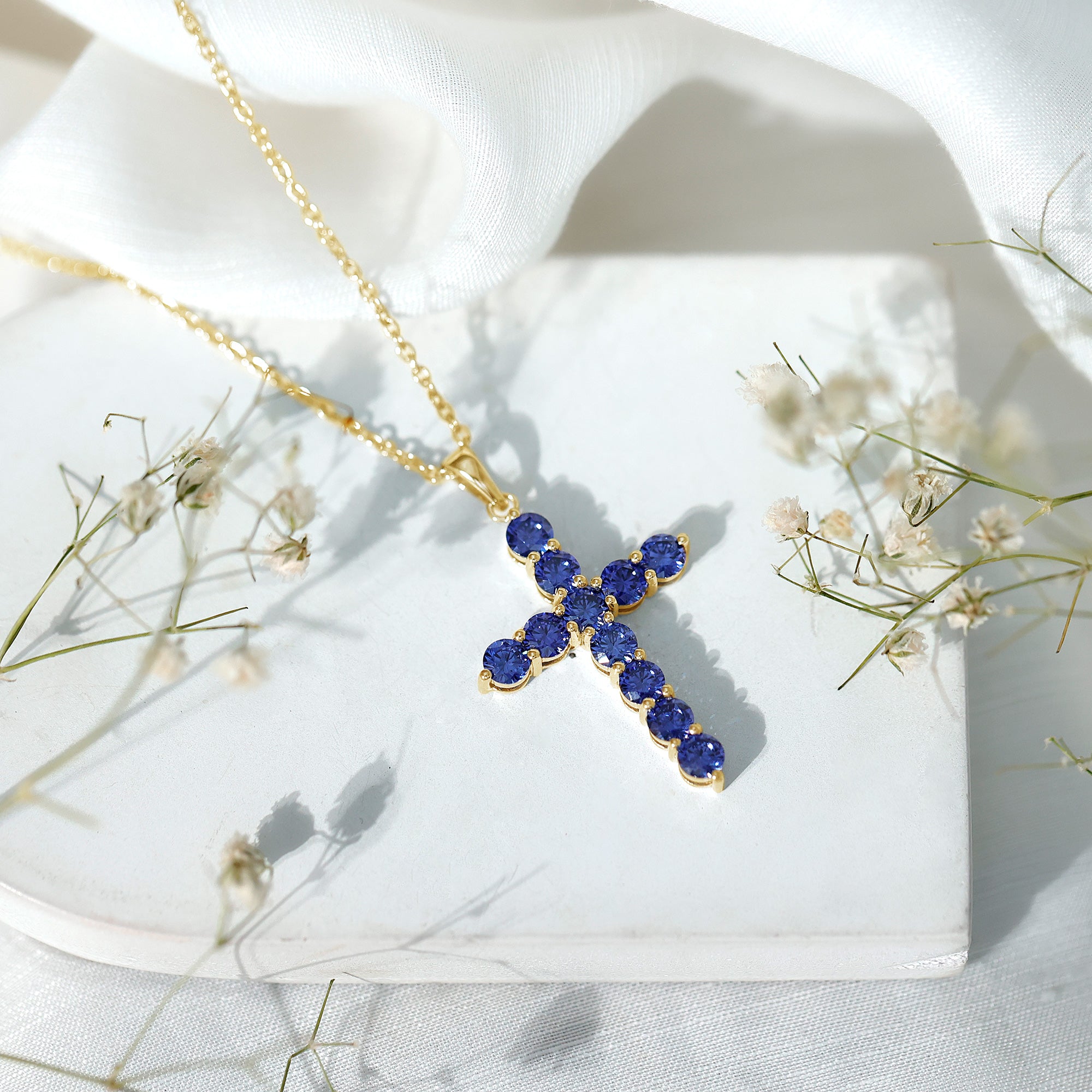Embrace the beauty of faith and elegance with this breathtaking cross pendant necklace. Crafted with meticulous attention to detail, it highlights a created blue sapphire gemstone radiating a captivating blue hue. The gemstone is lovingly nestled within a cross-shaped frame, symbolizing timeless devotion. Whether worn as a religious symbol or as a cherished piece of jewelry, this necklace effortlessly combines spirituality and style. Enhancing any ensemble with its subtle yet striking presence is a testament to both faith and fashion.