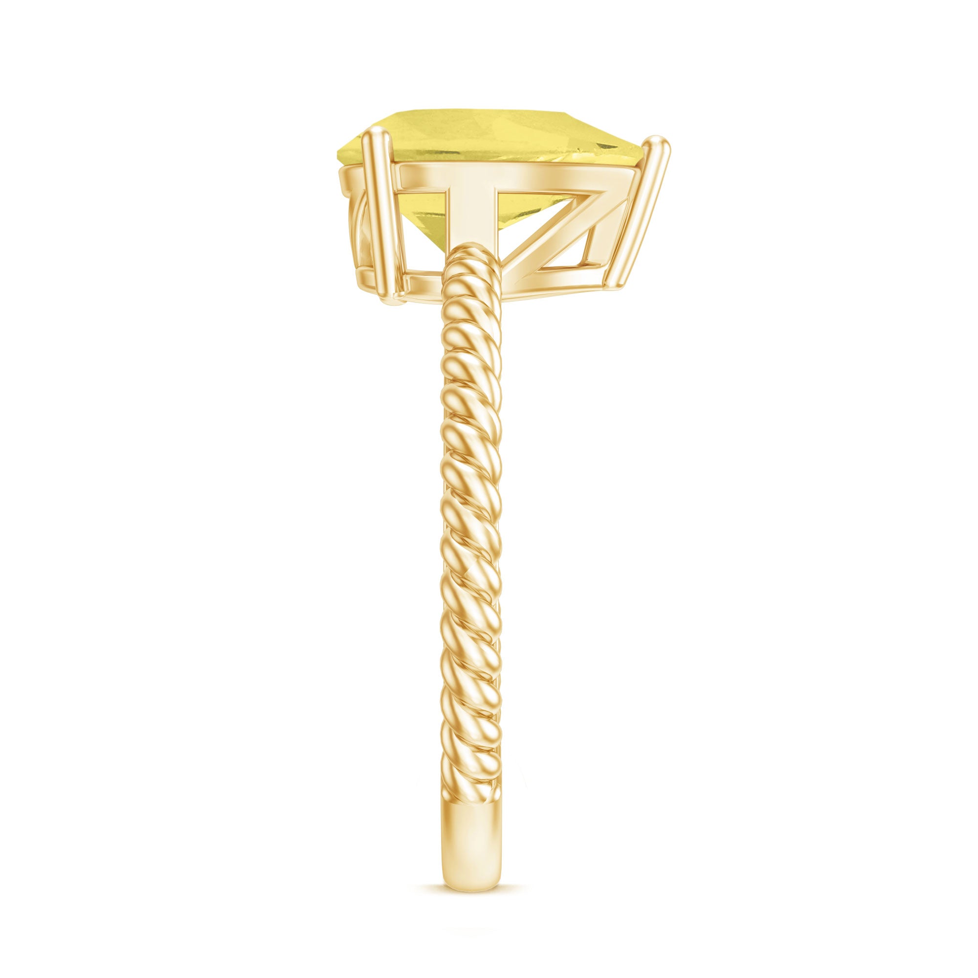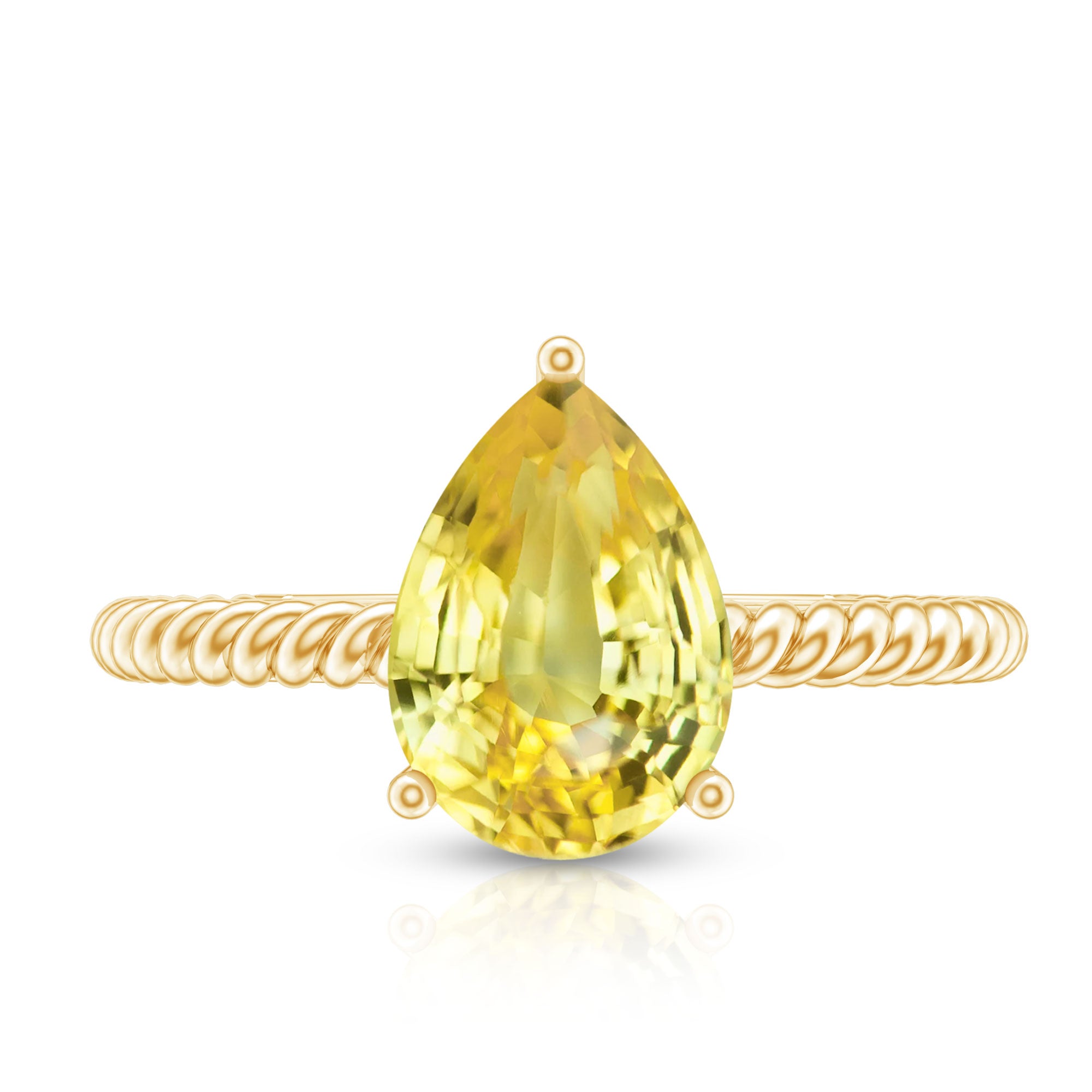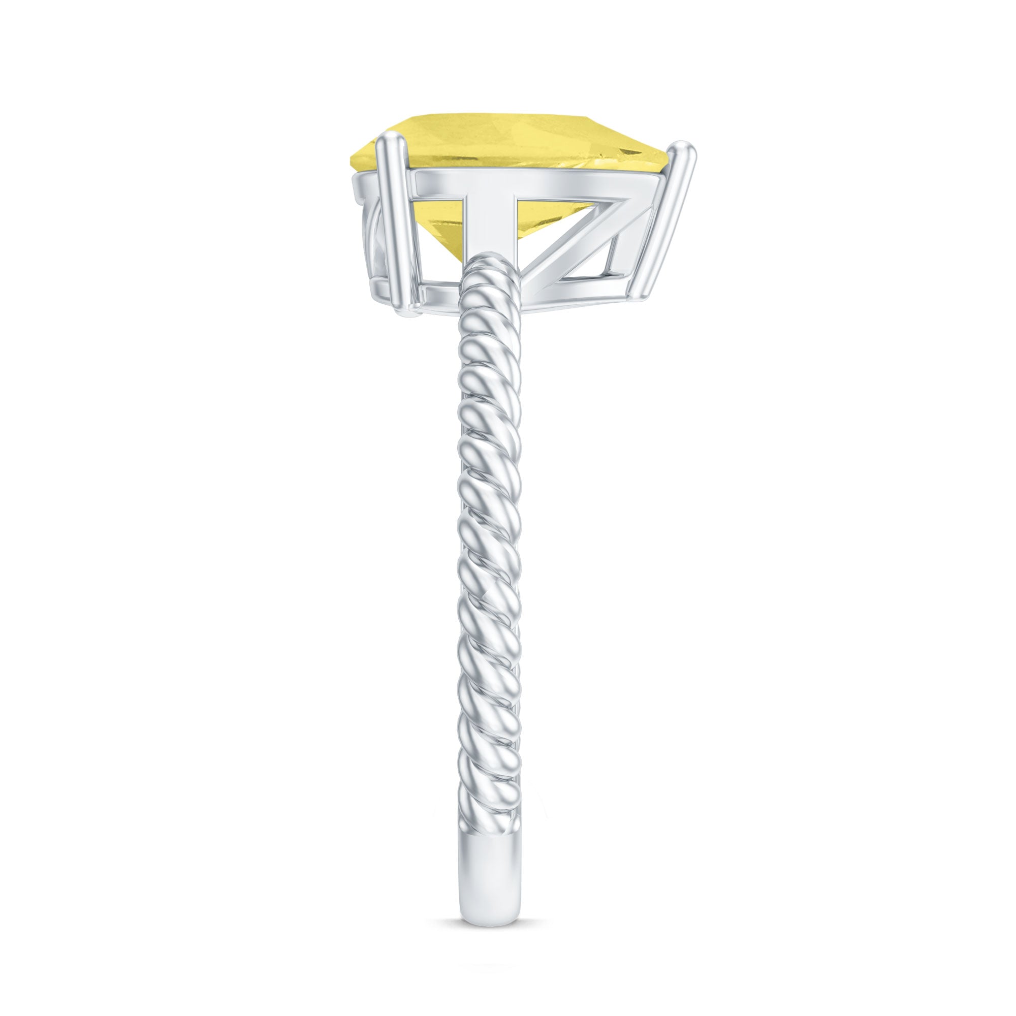 This simple yet exquisite Teardrop Engagement Ring is adorned with Pear Shape Lab Created Yellow Sapphire secured in 3 Prong Setting while Round Moissanite studded on the bridge of the ring and twisted rope shank adds a touch of uniqueness. This Teardrop Ring is crafted with Solid Metal. Make a commitment to a lifelong promise of caring, laughter, and love with her by getting this alluring Solitaire Ring for her.