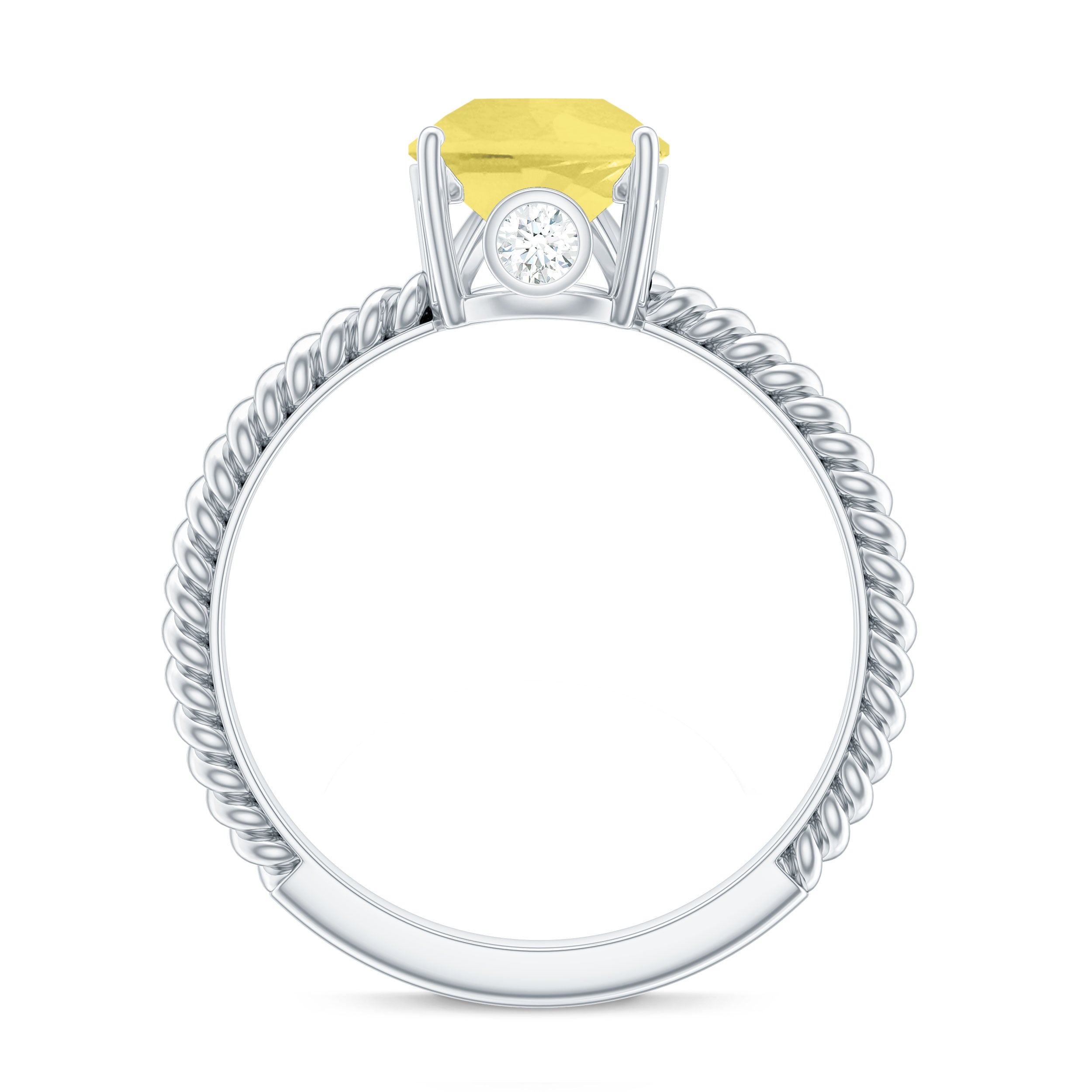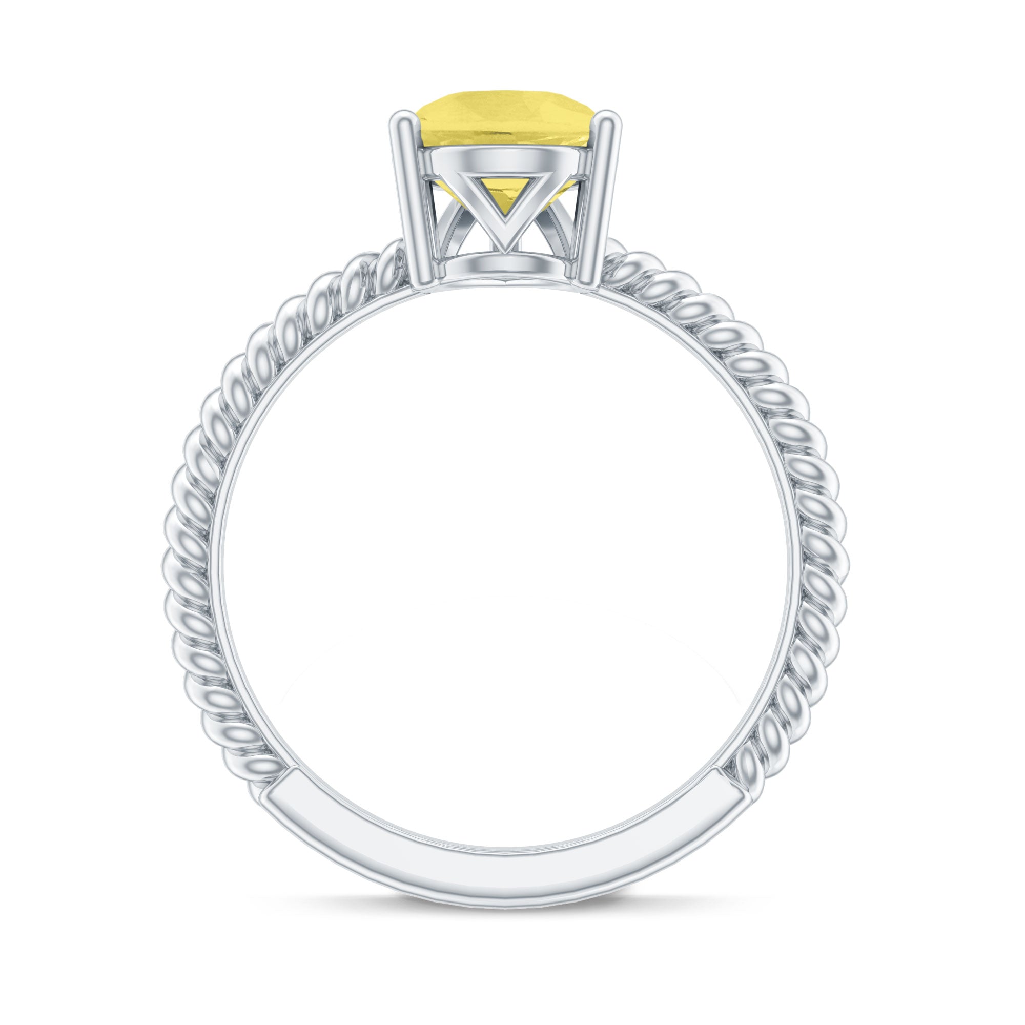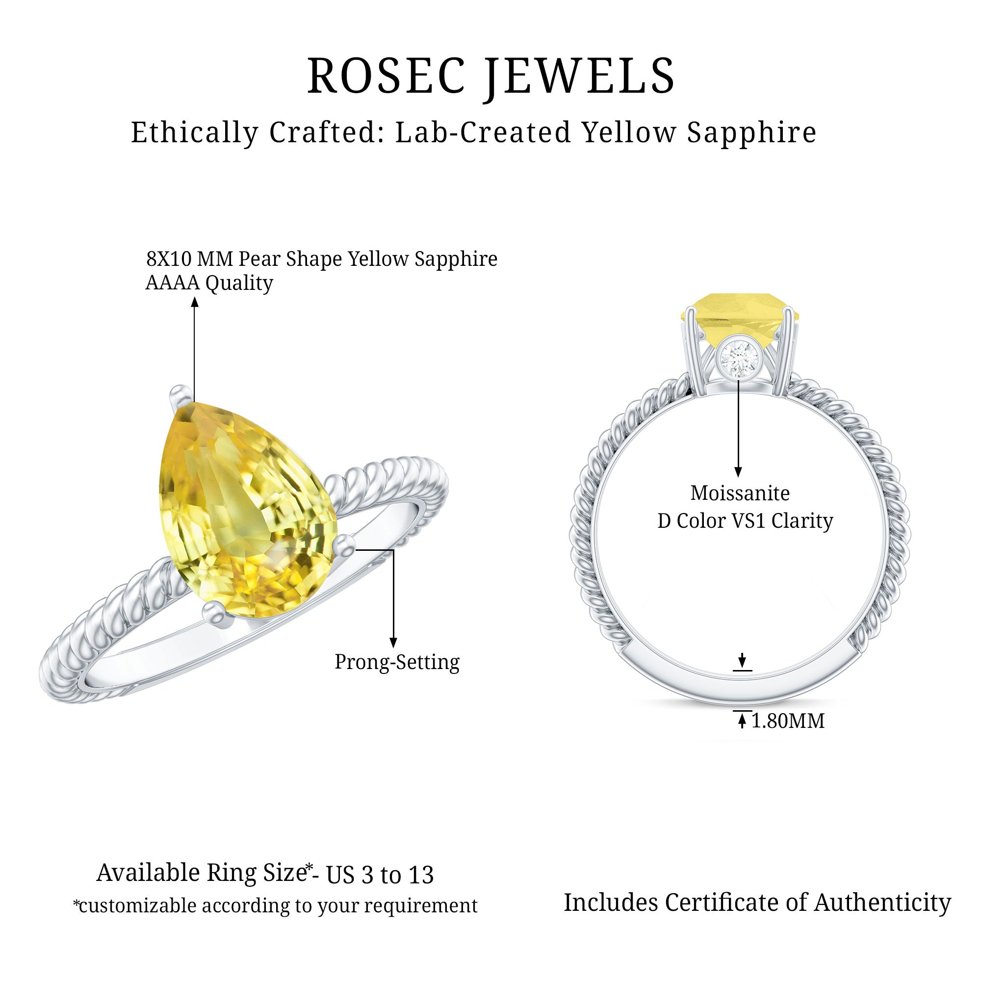 This simple yet exquisite Teardrop Engagement Ring is adorned with Pear Shape Lab Created Yellow Sapphire secured in 3 Prong Setting while Round Moissanite studded on the bridge of the ring and twisted rope shank adds a touch of uniqueness. This Teardrop Ring is crafted with Solid Metal. Make a commitment to a lifelong promise of caring, laughter, and love with her by getting this alluring Solitaire Ring for her.